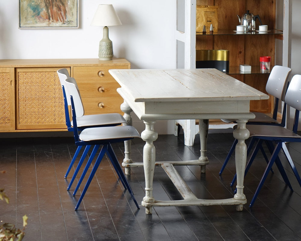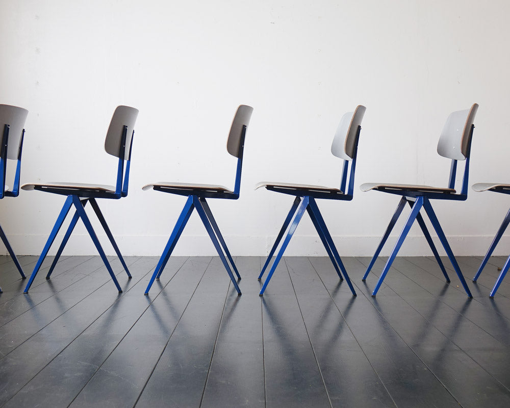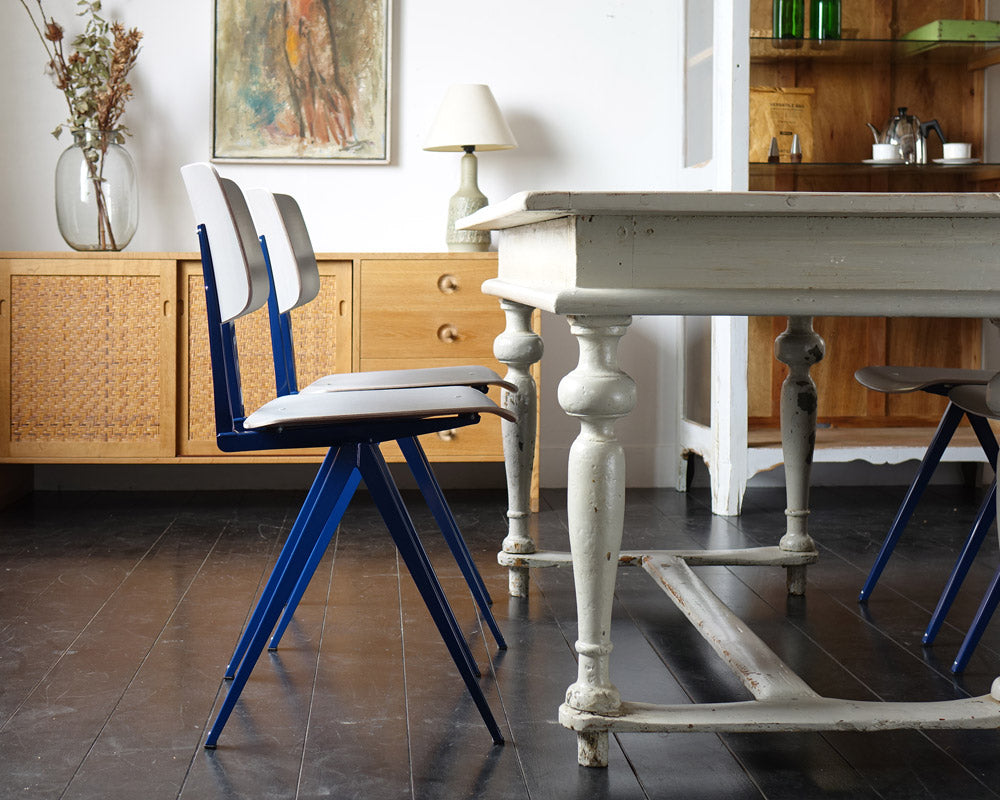 オランダのミッドセンチュリー期を代表する通称「コンパスレッグ」を採用したインダストリアルチェアModel S.16。2023年のスポットカラーの「グレー/カリブブルー」です。インダストリアルチェアModel S16は、1950年代後半から60年代初めに、学校、オフィス、病院、ダイニングホールなどの公共施設でのヘビーユーズに耐えられるよう、安価で実用性と耐久性が織り込まれたデザインとして製作されました。その後、国内の多くの施設にシェアが広がり、同社の代表的な製品として認知されるようになった椅子の一つです。一度は生産停止となったものの、ヴィンテージとして世界中にファンを持つS16は、2014年に生産を再開。Jean Prouve(ジャン・プルーヴェ)、Wim Rietveld(ウィム・リートフェルト)、Friso Kramer(フリソ・クラマー)らの工業製品の流れを汲んだシンプルで工業的な外観と豊富なカラーバリエーションが、時代や環境を超越し、住宅から商業施設、様々な空間で使用されています。2023年の限定スポットカラー 2023年の限定スポットカラーは爽やかで深みのある「カリブブルー」。シートにはグレーを採用しブルーとグレーのコンビネーションは相互に引き立て合うカラーコーディネートです。コンパスレッグ オランダのミッドセンチュリーデザインの代表とも言われる「コンパスチェア」。逆V字に開いたレッグが特徴的な通称「コンパスレッグ」を採用し、1950年代から60年代にかけて複数のメーカーから相次いで製造されました。ガルファニタスも同様に生産していましたが、他のコンパスチェアとは異なり一般家庭ではなく、公共施設や学校、政府機関を中心に採用されています。特殊素材PAGウッド シートと背もたれに採用されている合板は、ドイツのPAGHOLZ社が開発した「PAGウッド」と呼ばれる特殊複合素材です。PAGウッドはブナ合板と特殊樹脂を複合圧縮した強化材で、耐衝撃性や耐久性、耐水性を備えた素材です。シートには細かなな凹凸があり滑りを抑えるなど細かい配慮がされS.16に対するこだわりを感じさせます。