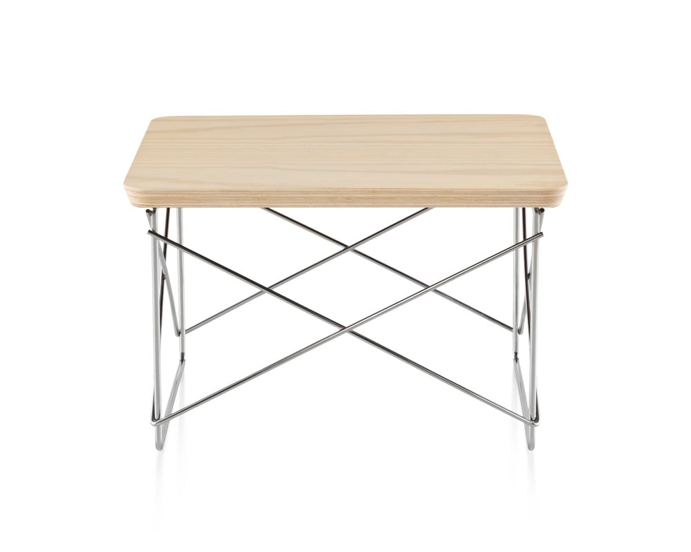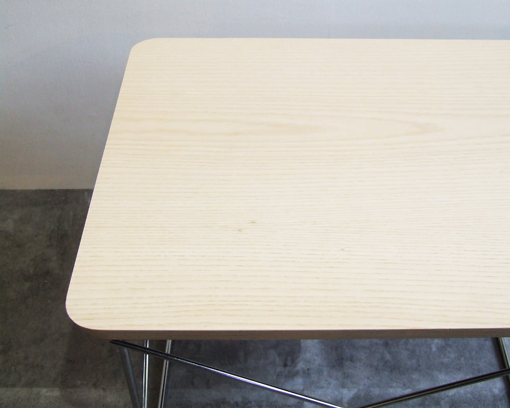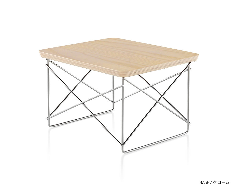 Herman Miller/ハーマンミラー社の多目的に使用することができる小さなローテーブル、Eames/イームズ LTR(Low Table Rod)テーブルです。1950年発表。日本のお膳を参考にイームズ夫妻が、自らの自宅でが使用するためにデザインされたテーブルです。イームズ夫妻の自宅にチャップリンやイサムノグチを招き、この小さなテーブルでもてなした事はあまりにも有名な話です。プライウッドの天板に細い溶接ワイヤーロッドの脚を組み合わせたスタイリッシュなフォルムは、 イームズがプライウッドを成型する画期的な技法を開発した後に、ワイヤーロッドを同時に溶接し量産できる技術を開発したことで生まれました。このワイヤーロッドを使用した革新的な技術は、後にシェルチェアのワイヤーベースやワイヤーチェア、ストレージユニットに応用されることになりました。天板のプライウッドは、13層からなるバーチ材積層合板を使用し、積層面を約20度の傾斜で美しく見せるデザインになっています。トップは、木目が美しく経年変化の楽しめるナチュラルなアッシュ材、ベース/脚のワイヤーロッドは、クローム、ブラックからお選びいただけます。単体で、並べて、積み重ねてと様々な用途で使用できる、イームズが生み出したまさにミッドセンチュリー期のモダンデザインを代表するテーブルです。