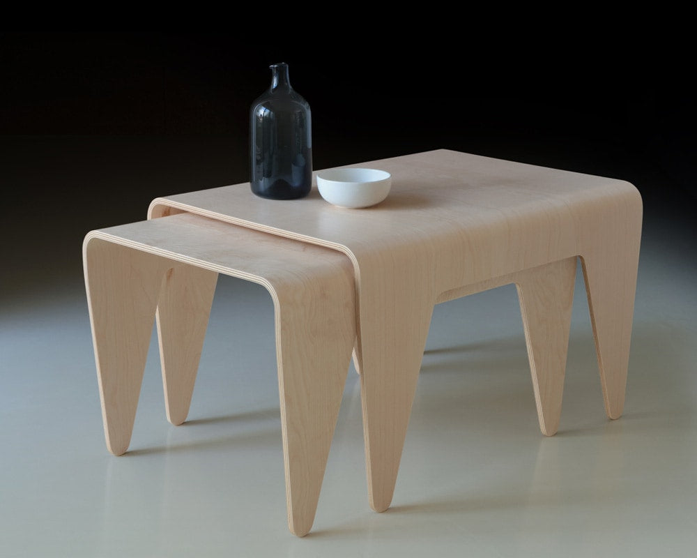 1936年にMarcel Breuer/マルセル・ブロイヤーによりデザインされた、プライウッド家具の名作:ネスティングテーブルです。11mm厚のバーチ合板の一枚板から裁断・成形され、当時、「史上最もシンプルなテーブル」と評されました。無垢材に比べ薄くても強度があり、しなやかな造形を可能とするプライウッドの特徴を生かしたミニマルなテーブルは、現在もなお色褪せないモダンデザインの名作です。ブロイヤーと言えばバウハウスを代表するデザイナーの一人。彼によって手掛けられたプライウッド製のファニチャーシリーズは、20世紀の家具デザインの象徴と評され、現在においてもインテリアデザインの礎となっています。シンプルで使う場所を選ばないテーブルは、Medium(ミディアム)、Large(ラージ)の2サイズ展開。ミディアムサイズは一回り大きいラージサイズの下に入れ子状に完全に収まります。単体でも組み合わせてもご利用いただけます。