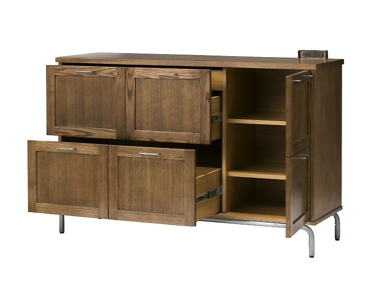 ミッドセンチュリー期のイギリスの学校をイメージてデザインした「BRISTOL(ブリストル)」シリーズのキッチンカウンターです。木部のミディアムブラウンとクリア塗装を施したスチール素地の組み合わせがトラッドな印象のキッチンカウンターです。トラッドな印象ながら、スチール部分はヴィンテージ家具に見られるポリッシュ仕上げをイメージして、インダストリアルミックスなテイストのお部屋に相性のよい雰囲気に仕上がっています。本体のサイズや素材などのディティールは同シリーズで統一してある為、キッチンボードやカウンターと並べて使用する事で、さらに収納力がアップし、トータルコーディネートを実現します。実用性を重視し、上部コンセントを設け、右側の取っ手をタオルかけに使える幅にしてあり、扉にはスライド丁番を取り付けてスムーズな開閉を可能にしています。「ユーズドルックなのに機能性や実用性を兼ね備えた家具」というジャーナルスタンダードファニチャーの新しいコンセプトのシリーズで、キッチンカウンター、ダイニングテーブル、キャビネット等をシリーズでトータルコーディネート可能な商品です。