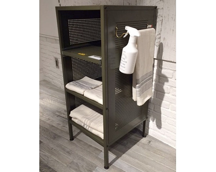 業務用のシェルフをイメージしてデザインされたjournal standard Furniture(ジャーナルスタンダードファニチャー)の「ALLEN Steel Shelf Small(アレン スチールシェルフ)」です。店舗や工場などで使用されている什器をイメージしたシェルフで、インダストリアルからモダン、オールドアメリカな空間まで、幅広く合わせることが出来る万能シェルフです。上段の棚板はスライド式になっている為、奥に収納したものが取りやすくデザイン。奥にしまって取り出しにくい物、箱類で取り出さなくても蓋を置けるとき・・・非常に便利な機能です。また、本体はスチールなのでマグネットでメモやお気に入りのポストカードと留めてあけたり、パンチング部分にフックをとりつけ、ショッピングバッグをかけておいたり、アイデア次第で格好良く、機能的にお使いいただけます。ALLENシリーズのKHAKI(カーキ)のカラーはベイカーパンツ色のカラーにこだわり、家具へ再現しています。「何にでも合わせやすく、合わせる物によって部屋のテイストを選ばない」そんな商品に仕上がっております。