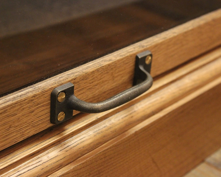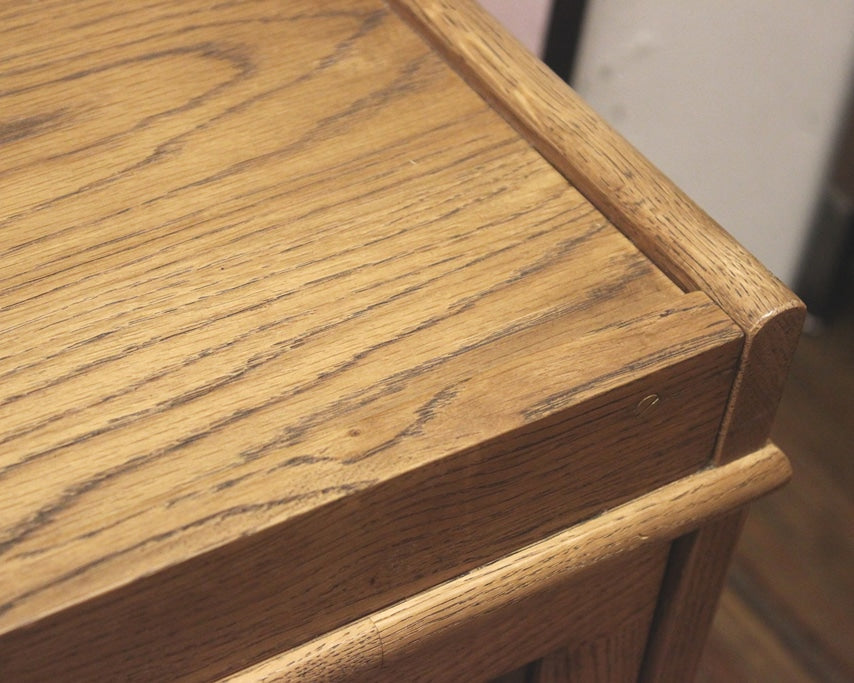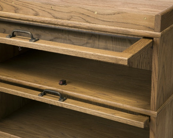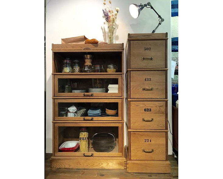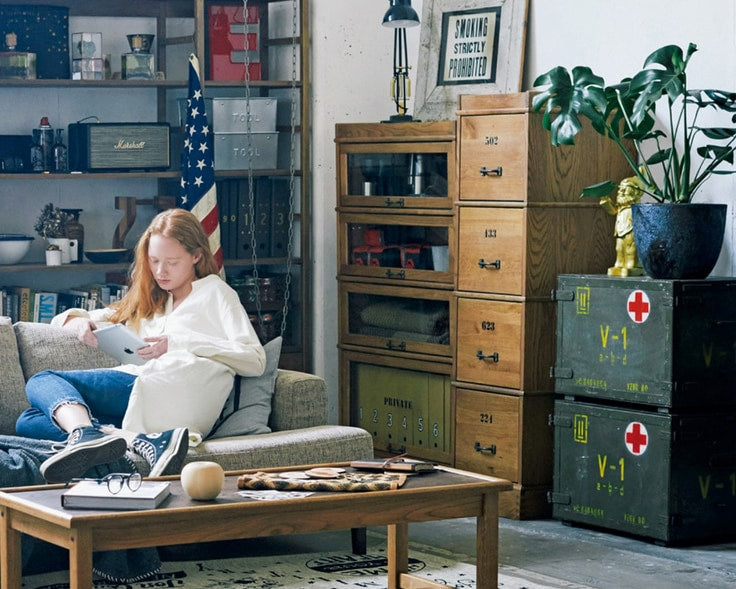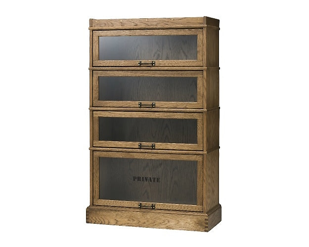 ヴィンテージのファイルボックス等をイメージソースにjournal standard Furnitureらしいデザインを落とし込んだ「BOND(ボンド)」シリーズのキャビネット「BOND SLIDE CABINET(ボンドスライドキャビネット)」です。以前はヴィンテージストアに多々出回り高値で取引されていたファイルキャビネットやブックケース。近年は、数が減り希少になっているそれらを、journal standard Furnitureらしくリデザインしてリリースされた「BOND」シリーズ。見せる収納にも活躍しそうなこのキャビネットは、ガラス扉を持ち上げ上部へスライドして収納できる仕様で、お好みの箇所をオープンして使用することも可能です。また、実用的でありながら細部にまで拘り、ハンドルは実際に使われていたヴィンテージハンドルを型取りして作られた鋳物のハンドルを使用し、ヴィンテージ家具に見られる、真鍮無垢のマイナスビスを使用しています。また、最下段のガラスには当時のアメリカ軍のフォントを再現しステンシルプリントが施されるなど、journal standard Furnitureらしさあふれるデザインです。同シリーズでコーディネート可能なキャビネットです。