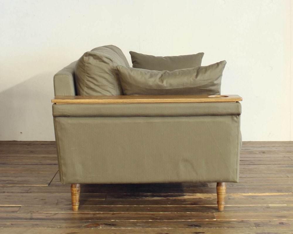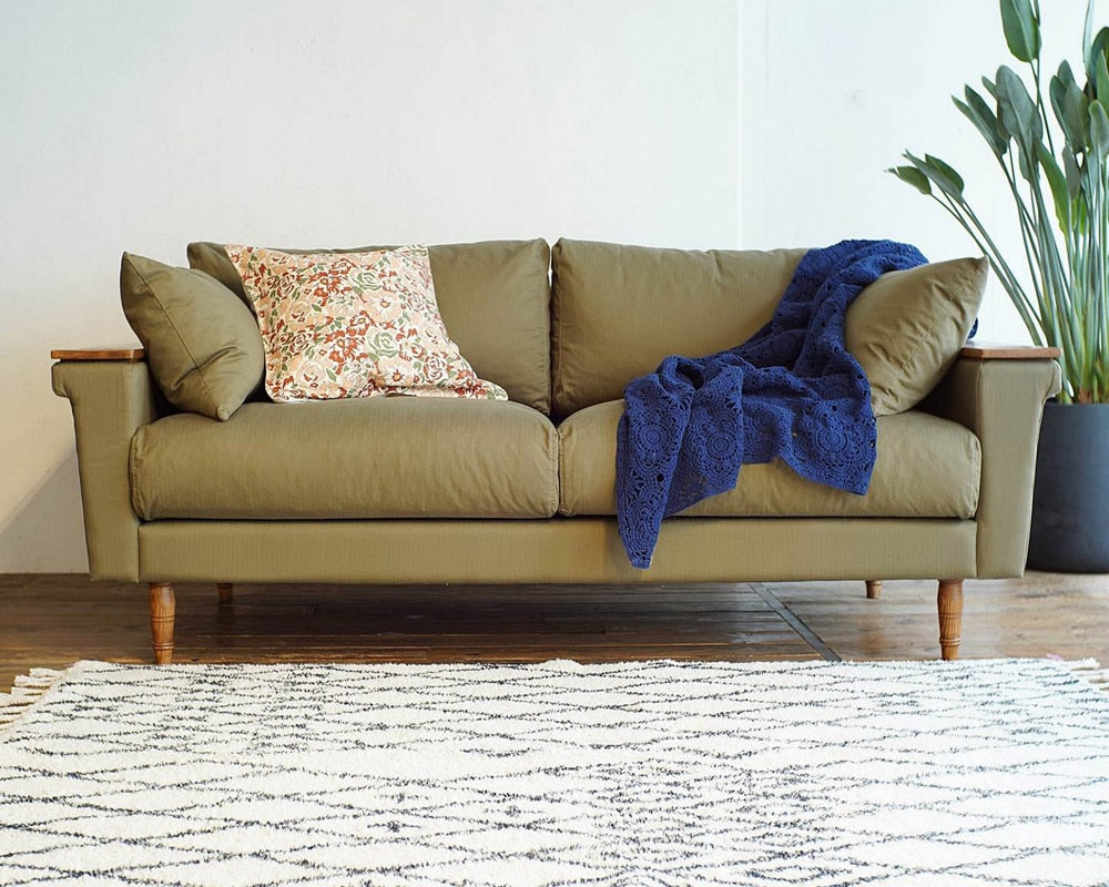 journal standard Furniture の定番アイテムのチェック生地を使った「ABBEY SOFA(アビーソファ)」です。ヴィンテージカーや乗り物からインスパイアを受けたデザインで、座り心地を追求し、シート下にはSバネ、シートクッションにはポケットコイルとフェザーを使用。また、背面クッションは表面にフェザー、内側にミクセルキューヴとウレタンで製作し、フカフカの座り心地を実現しています。1人暮らしの女性にも最適なサイズ感で、張り地はjournal standard Furniture のアイコン的なミリタリーを思わせるオリーブグリーンの生地を使用。その生地は「US.ARMY/M47HBTUTILITYPANTS」を忠実に再現しています。細工の入った木脚。優しい肌触りの無垢材で仕上げた肘掛には丸いくぼみが設けられ、スマホや、読みかけの本、カップなど色々なものが置けてとても便利です。