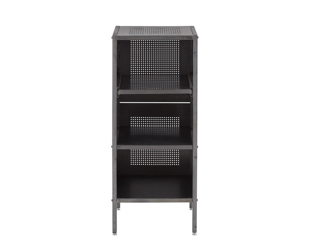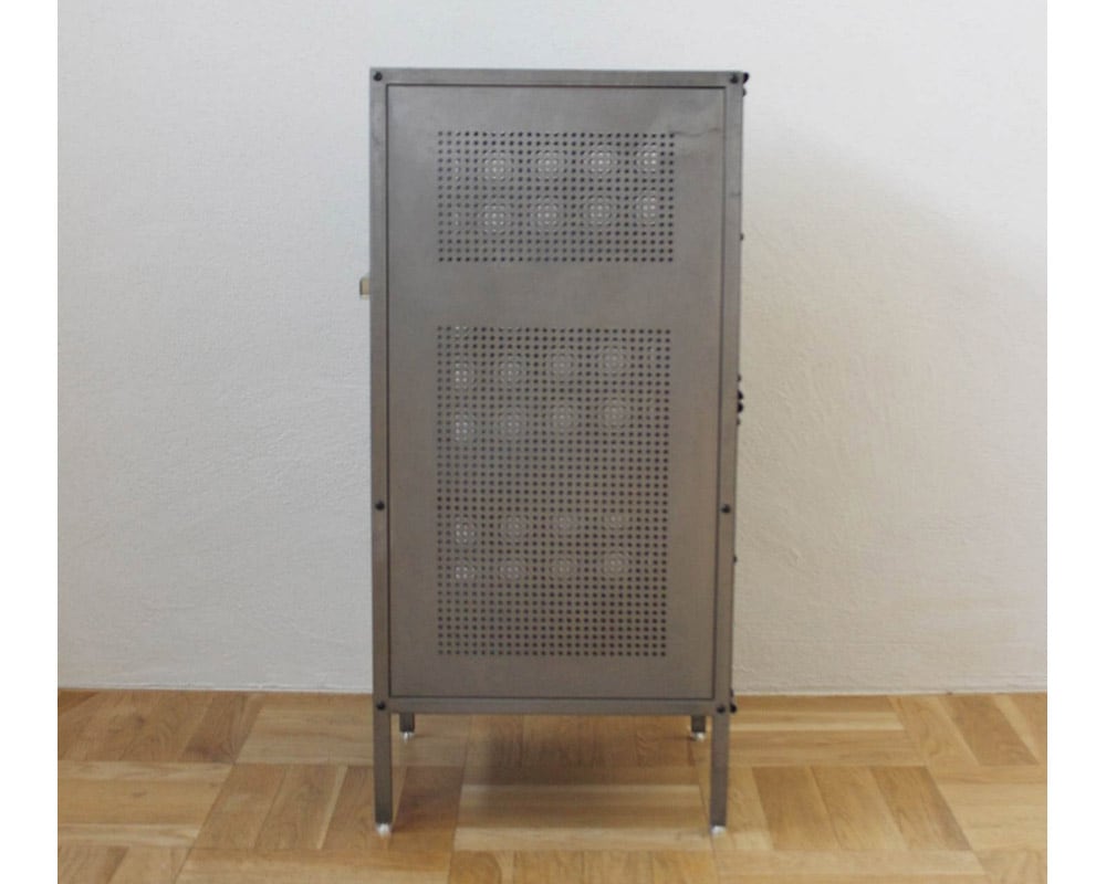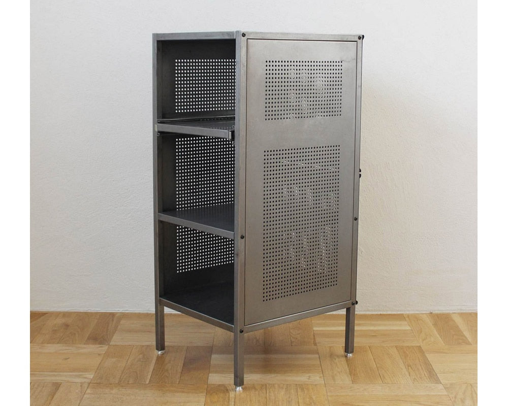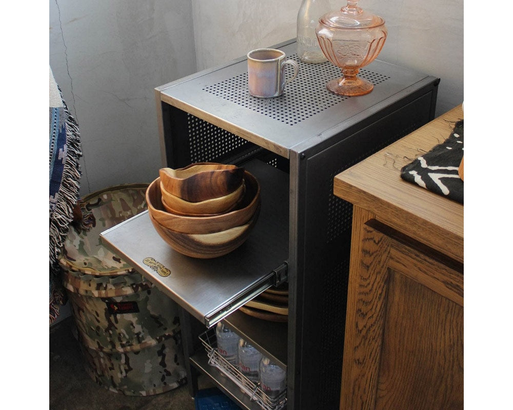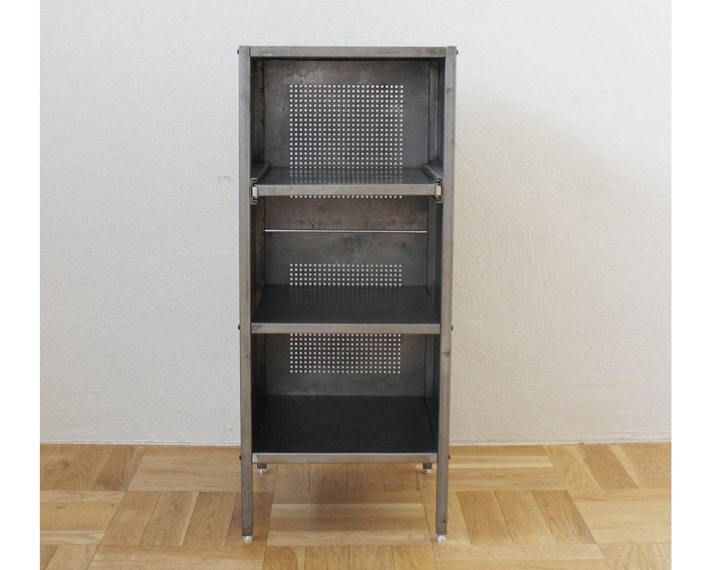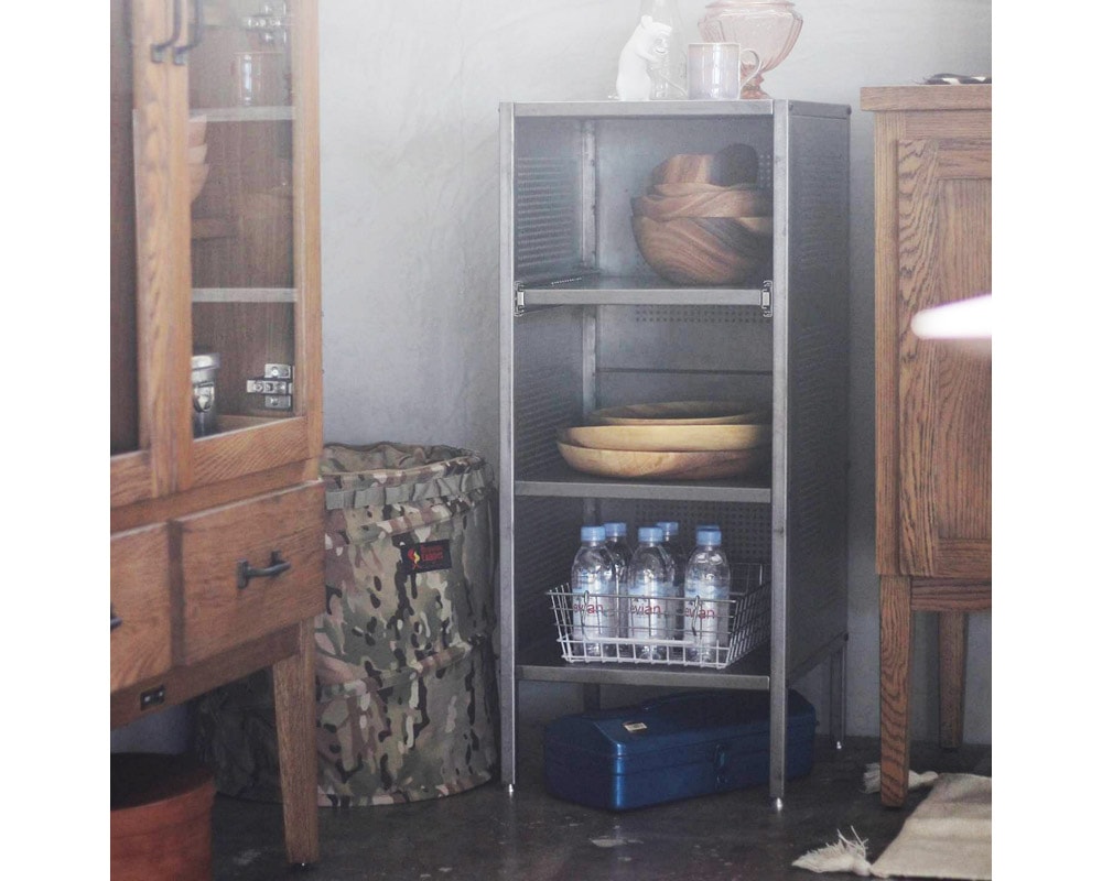 業務用のシェルフをイメージしてデザインされたjournal standard Furniture(ジャーナルスタンダードファニチャー)の「ALLEN Steel Shelf Small(アレン スチールシェルフ)」の無塗装仕様です。店舗や工場などで使用されている什器をイメージしたシェルフで、インダストリアルからモダン、オールドアメリカな空間まで、幅広く合わせることが出来る万能シェルフです。上段の棚板はスライド式になっている為、奥に収納したものが取りやすくデザイン。奥にしまって取り出しにくい物、箱類で取り出さなくても蓋を置けるとき・・・非常に便利な機能です。また、本体はスチールなのでマグネットでメモやお気に入りのポストカードと留めてあけたり、パンチング部分にフックをとりつけ、ショッピングバッグをかけておいたり、アイデア次第で格好良く、機能的にお使いいただけます。あえて塗装をせず、スチールの素材感を大切にしたシェルフで、年月を経て多少の錆がでたり変化が楽しみです。「何にでも合わせやすく、合わせる物によって部屋のテイストを選ばない」そんな商品に仕上がっております。