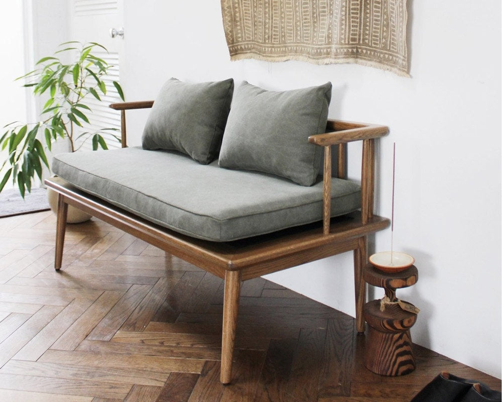 リビングとダイニングベンチシートとしても使える、journal standard Furniture(ジャーナルスタンダードファニチャー)の「ALVESTA BENCH/アラベスタベンチ」です。実は新築のマンションの専有面積は年々減少してきているのをご存知でしたか? 置ける家具も限られてくるし、けど広さは欲しいけど・・・ リビングダイニングのベンチシートとしてお使いできるソファベンチになります。一人もしくは二人暮らしのラブシートとして、 住宅の玄関先や廊下に置くベンチとして、など様々な用途でも使えるようなベンチです。フレームは木目がはっきりとしていて、堅くて丈夫なアッシュ材。ファブリッククッションカラーはカーキと黒の2色展開。カーキは座面と置きクッション共に綿ファブリック仕様、 黒は座面がビニールレザーで置きクッションが綿ファブリックとなっています。