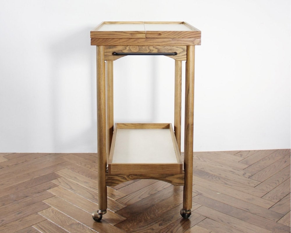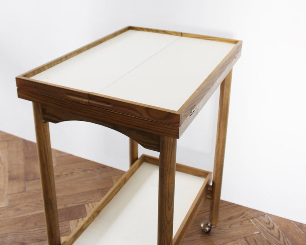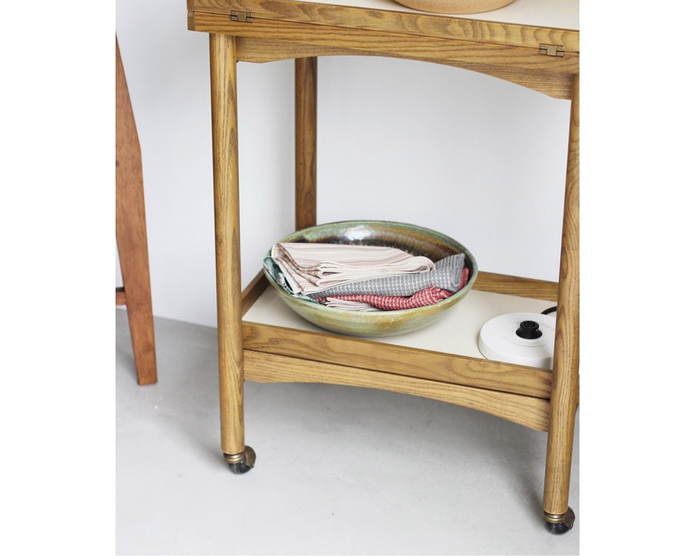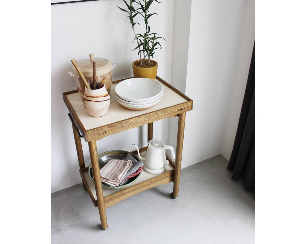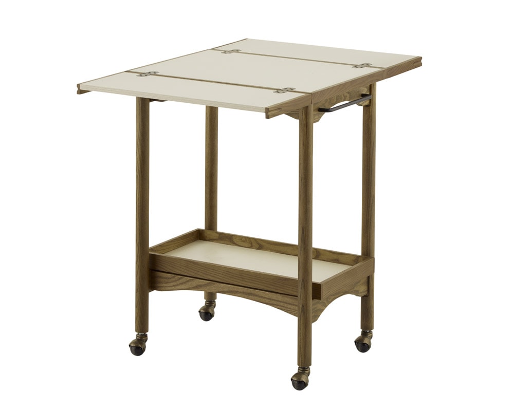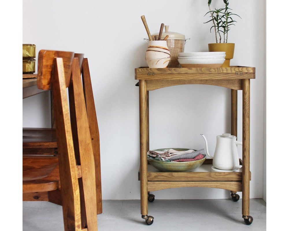 シンプルなデザインながら機能性も兼ね備えた、journal standard Furniture/ジャーナルスタンダードファニチャーのキッチンワゴン、「ALVESTA KITCHEN WAGON/アルベスタキッチンワゴン」です。天板が2倍の大きさに広がるバタフライ式のワゴンです。天板を広げることでエクストラのダイニングテーブルとして使用可能です。同シリーズのサイドテーブルと同じく、アッシュフレームとメラミン天板の北欧を感じるデザインに仕上げっています。外観にボルトの頭が出ないように全てのボルトを見えない内側から締めるようにしたところなど、随所にこだわりを感じさせます。スチール製のハンドルはワゴンを動かす際に使用する所でもありますが、簡易的なタオルフックとしても使用可能です。また、下部の棚板は取り外しが可能になっていて、外してそのままサービングトレーとしても使えます。