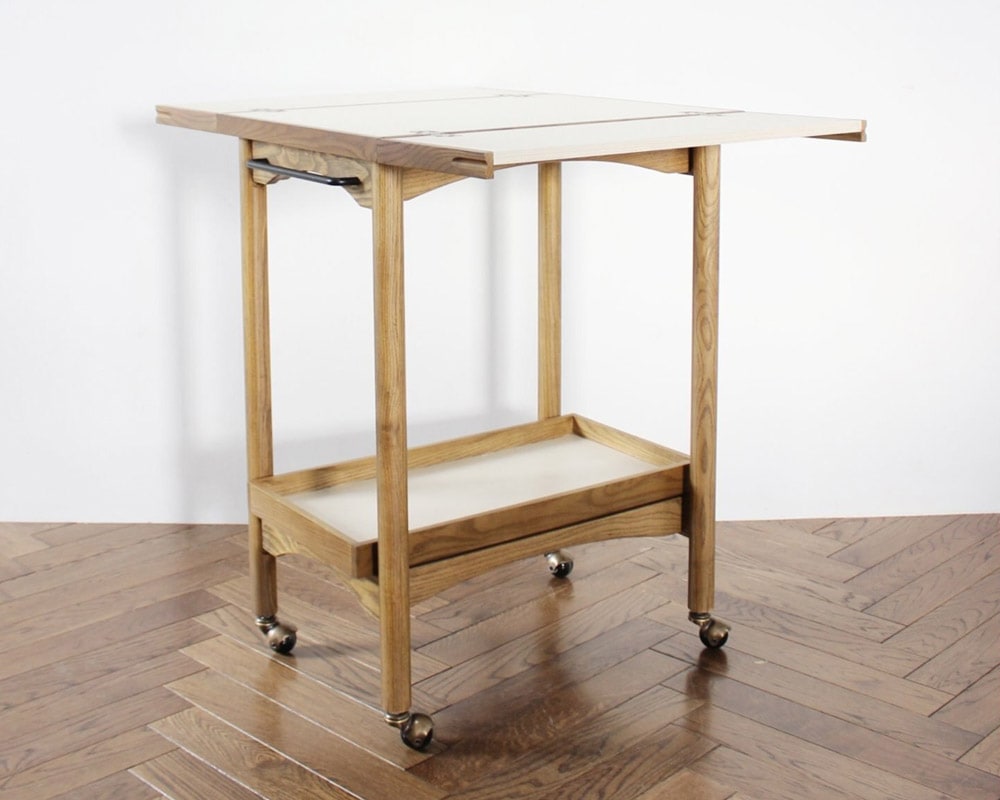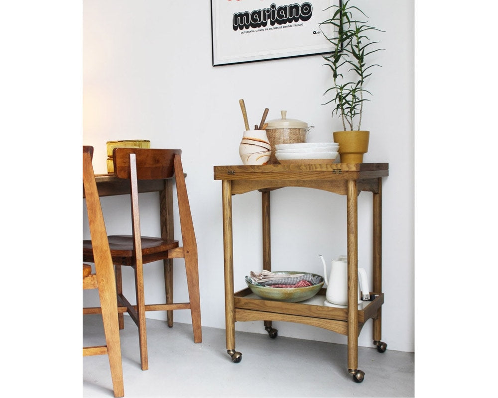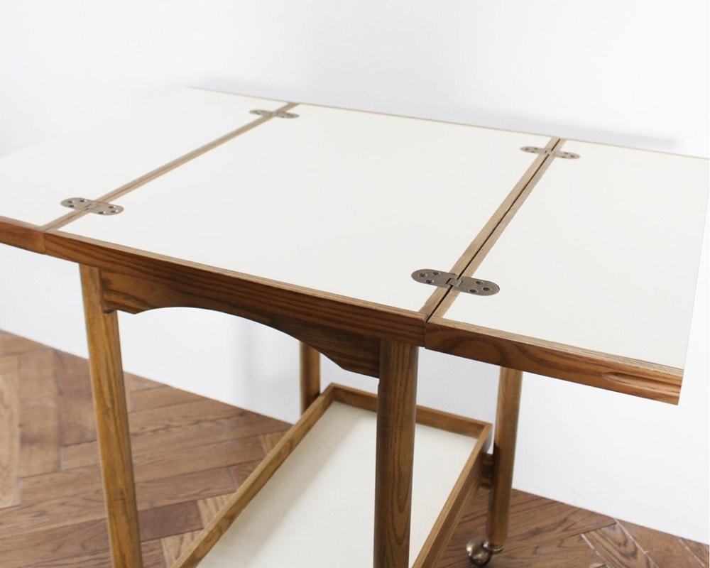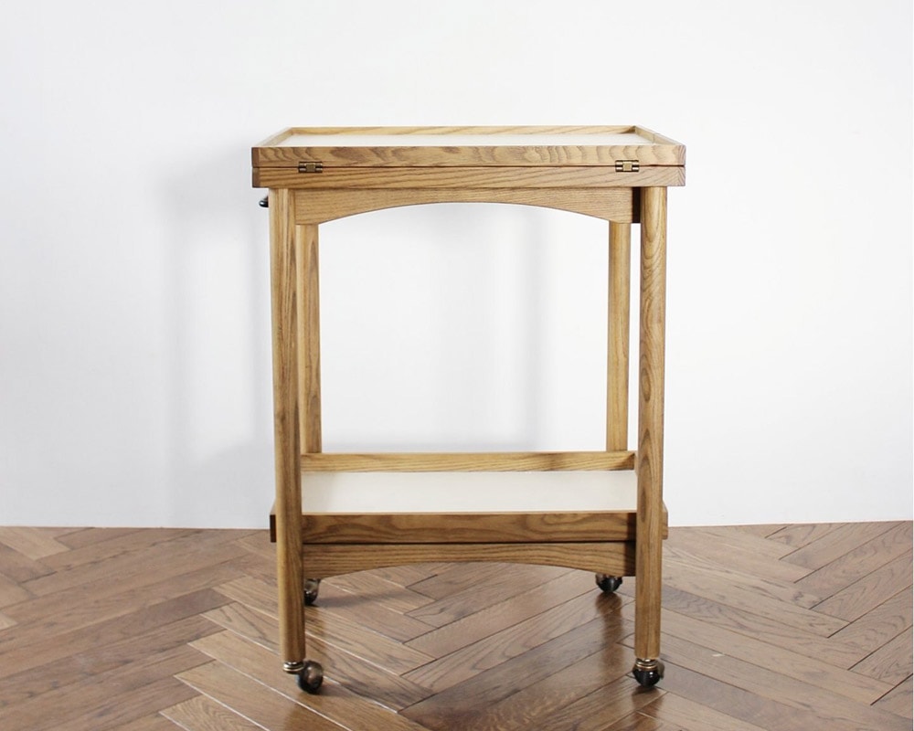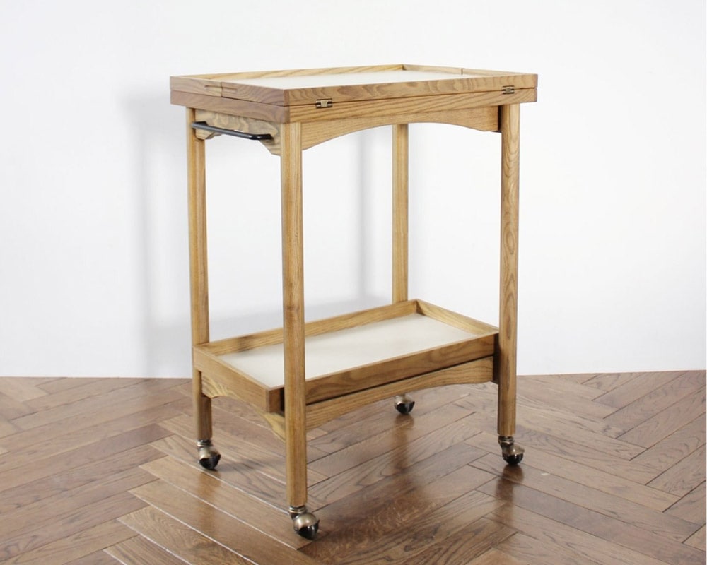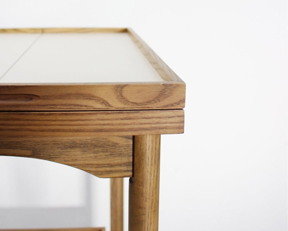 シンプルなデザインながら機能性も兼ね備えた、journal standard Furniture/ジャーナルスタンダードファニチャーのキッチンワゴン、「ALVESTA KITCHEN WAGON/アルベスタキッチンワゴン」です。天板が2倍の大きさに広がるバタフライ式のワゴンです。天板を広げることでエクストラのダイニングテーブルとして使用可能です。同シリーズのサイドテーブルと同じく、アッシュフレームとメラミン天板の北欧を感じるデザインに仕上げっています。外観にボルトの頭が出ないように全てのボルトを見えない内側から締めるようにしたところなど、随所にこだわりを感じさせます。スチール製のハンドルはワゴンを動かす際に使用する所でもありますが、簡易的なタオルフックとしても使用可能です。また、下部の棚板は取り外しが可能になっていて、外してそのままサービングトレーとしても使えます。