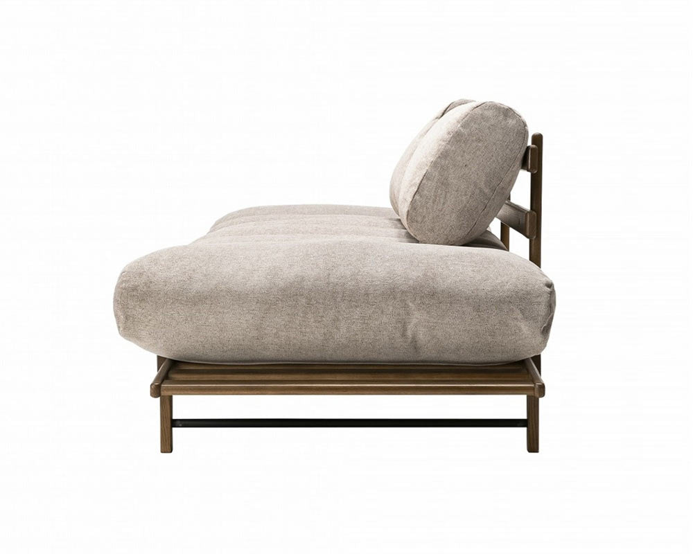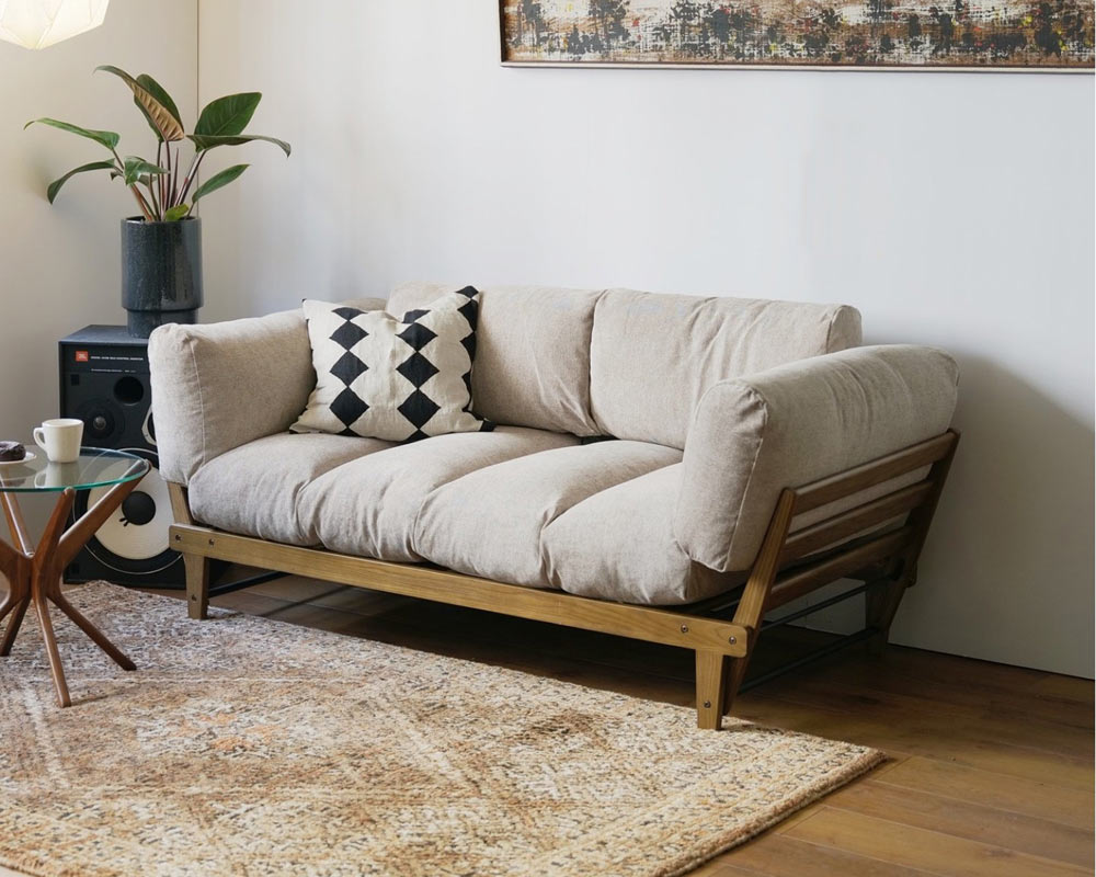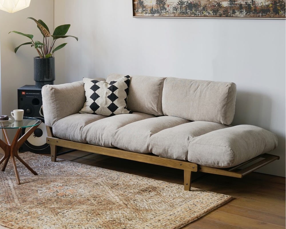 アームがリクライニングすることで様々な使い方の出来る、journal standard Furniture/ジャーナルスタンダードファニチャーの「ALVESTA SOFA/アルベスタソファ」です。アームがリクライニングするjournal standard Furniture/ジャーナルスタンダードファニチャーソファです。アームを起こした状態で通常W157cmですが、アームを広げるとW208cmになり、横になって寝転ぶことができるのでソファベッドのように使用できます。通常のソファベッドはワイド寸法はそのままで奥行きが広がるものが多いですが、このアルベスタソファは通常使用の場合W157cmとコンパクトなのが特徴です。片側のアームだけ起こして枕のようにしてくつろぐことも出来ます。またシートクッションは、程よく反発力があり、長時間座っても疲れません。クッションはカバーリング仕様、ドライクリーニングが可能です。※2024年4月入荷分よりフレームカラーが「新仕様」カラーへ変更になります。