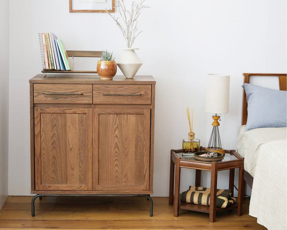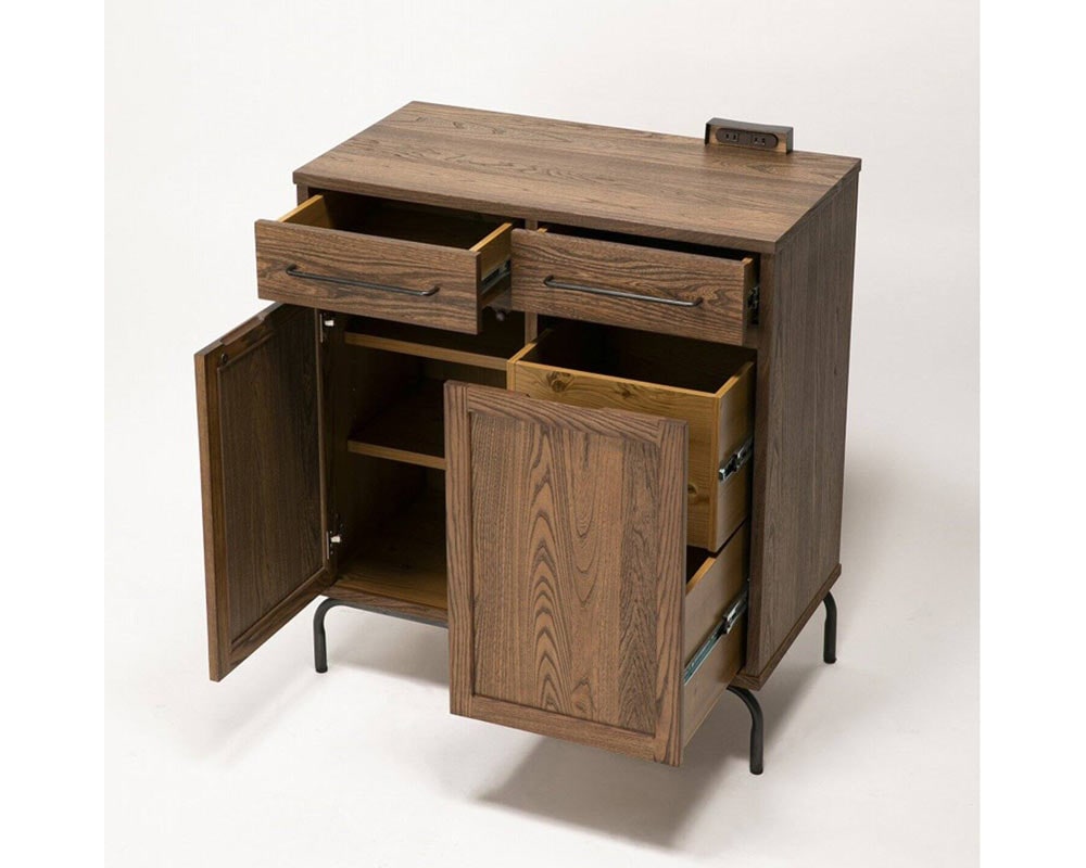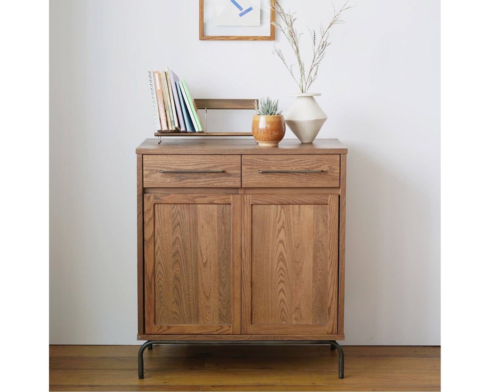 組み合わせてリビング、キッチン、寝室でご利用ができる、ヴィンテージテイストの「TIVERTON/ティバートン」シリーズのキッチンカウンターです。一般的な家庭のキッチンの広さは4.5帖程度と言われています。実質置ける収納アイテムの大きさは2m前後がおおよその一般的に置けるスペースと考えられます。そこにキッチンカウンターとボードを置く事を考慮してサイズを考えられています。もちろん1台のみでもある程度の機能と収納容量確保出来ますが、TIVERTON/ティバートンシリーズ4種類のサイズバリエーションの組み合わせ次第で、81cm / 121cm / 162cm / 202cm / 242cm と言った形で 40cm刻みで組合せを考えられるので設置スペースに合わせて自由に組み合わせることが可能です。また、出来るだけデザインを崩さないように引出を表に出し、引出が2杯あるので細かい収納が可能になっています。正面から見て右下引出は、ダブル引出になっています。下段は大皿や鍋等も収納する事が出来る目的として設けた深めの引出。上段は普段あまり使わない道具や乾物などのかさ張る物などの収納にお使いいただけます。正面から見て左下開き扉は、可動式の棚板ですので高さのあるものや普段は使わない調理家電、 カセットコンロ等、ユーティリティ性の高いスペースになります。炊飯器やコーヒーメーカー、電子レンジなど、調理家電を置く事を前提して考えた天板には2口コンセントが装着されています。この2口コンセントは、脱着式なので取り外しての使用も可能です。さらに、脚下の隙間は11cmで、ロボット掃除機の走行が可能な広さを確保しています。何かと下に物を落とす事の多い床をいつも清潔に保つ事が出来ます。また、キッチン以外のリビングスペースで使えるスモールチェストとしてご使用頂いても。その際はコンセントを外して頂いても良いですし、テーブルランプや、携帯電話等の電源供給下として使って頂けます。