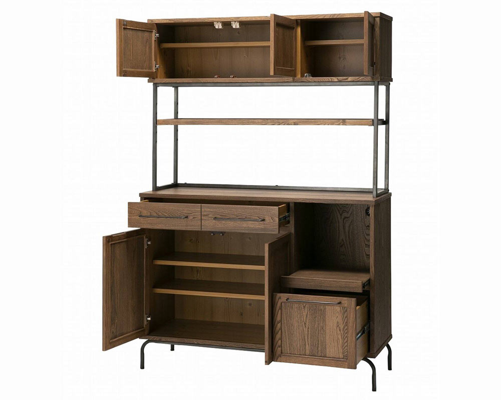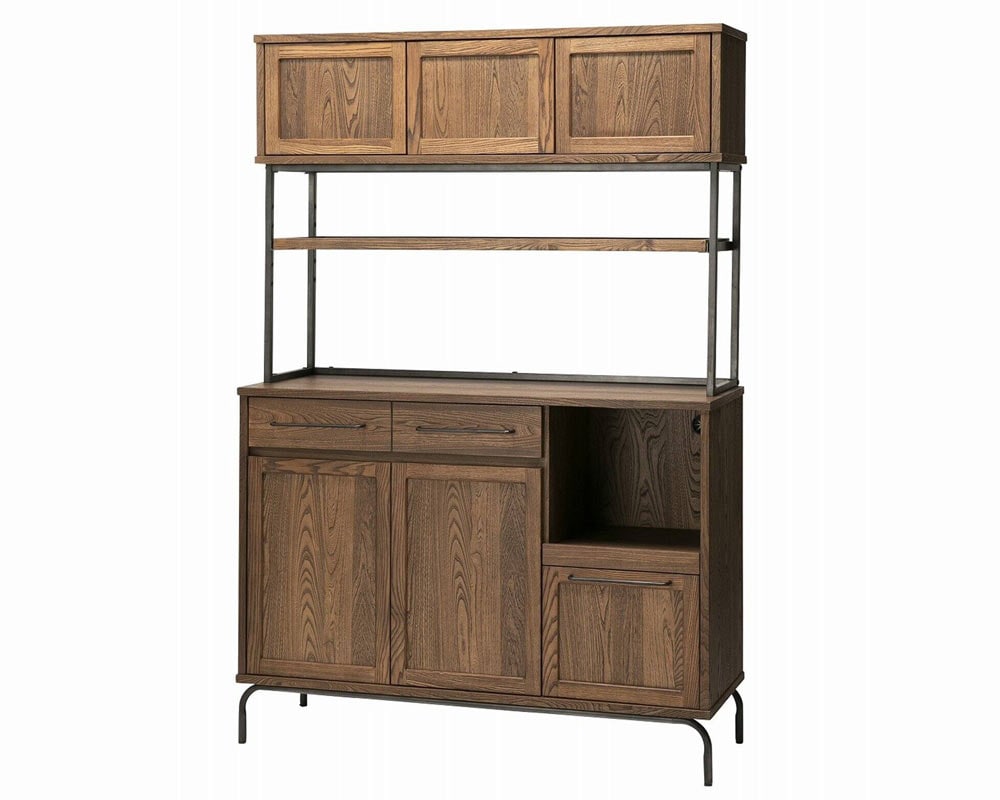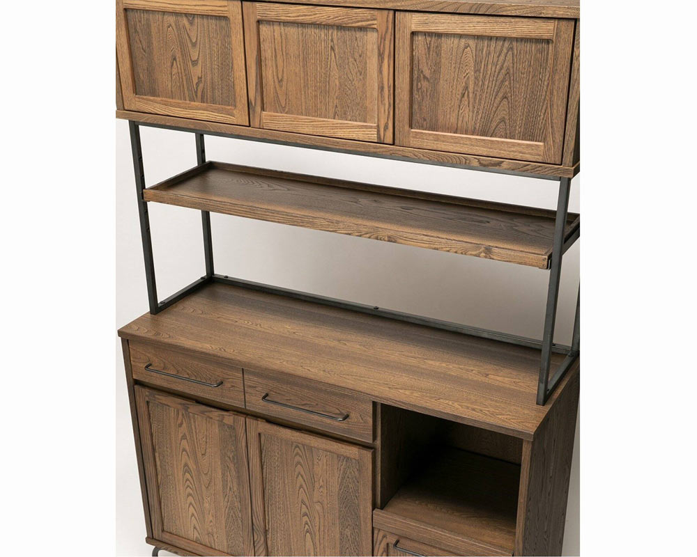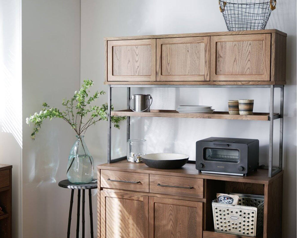組み合わせてリビング、キッチン、寝室でご利用ができる、ヴィンテージテイストの「TIVERTON/ティバートン」シリーズのキッチンボードです。一般的な家庭のキッチンの広さは4.5帖程度と言われています。実質置ける収納アイテムの大きさは2m前後がおおよその一般的に置けるスペースと考えられます。そこにキッチンカウンターとボードを置く事を考慮してサイズを考えられています。もちろん1台のみでもある程度の機能と収納容量確保出来ますが、TIVERTON/ティバートンシリーズ4種類のサイズバリエーションの組み合わせ次第で、81cm / 121cm / 162cm / 202cm / 242cm と言った形で 40cm刻みで組合せを考えられるので設置スペースに合わせて自由に組み合わせることが可能です。左上引出は浅めのためカトラリーなど細かい収納が可能になっています。左下開き戸手が掛けやすい様に取手を大きくしています。感覚的に手が届き開閉出来る用に気を配っています。右上引出は炊飯器やコーヒーメーカーを置く事を前提して考えた引出式トレーは中にコンセントが装着されています。天板上に調理家電を置いた際も背面に通線口がありますのでここから電源を確保する事が可能です。右下引出は大皿や鍋等も収納する事が出来る目的として設けた深めの引出。乾物などのかさ張る物などの収納にも良さそうです。中段棚板は5ヶ所の高さ調整を行えるようになっています。また、棚板は4方が立ち上がっているので割れ物等を置く際も安心して置く事が出来ます。棚板の下にはマグネットを装着していますので棚板のズレ防止の役割をしています。上段の扉は耐震ラッチになっています。地震等の振動によって内容物が滑り出てこないようにロックが掛かるようになっています。また、タッチラッチ式で押すと開く仕様にしています。キッチンでの作業時は何かと急ぐ事も多いです。少ないアクションで開け閉めが出来る仕様です。さらに、脚下の隙間は11cmで、ロボット掃除機の走行が可能な広さを確保しています。何かと下に物を落とす事の多い床をいつも清潔に保つ事が出来ます。