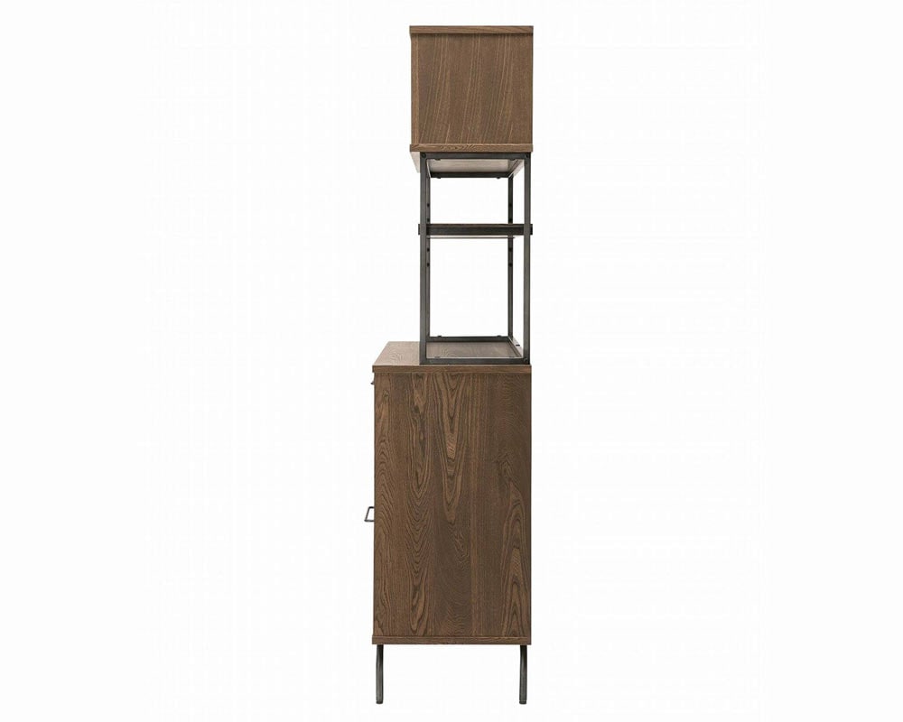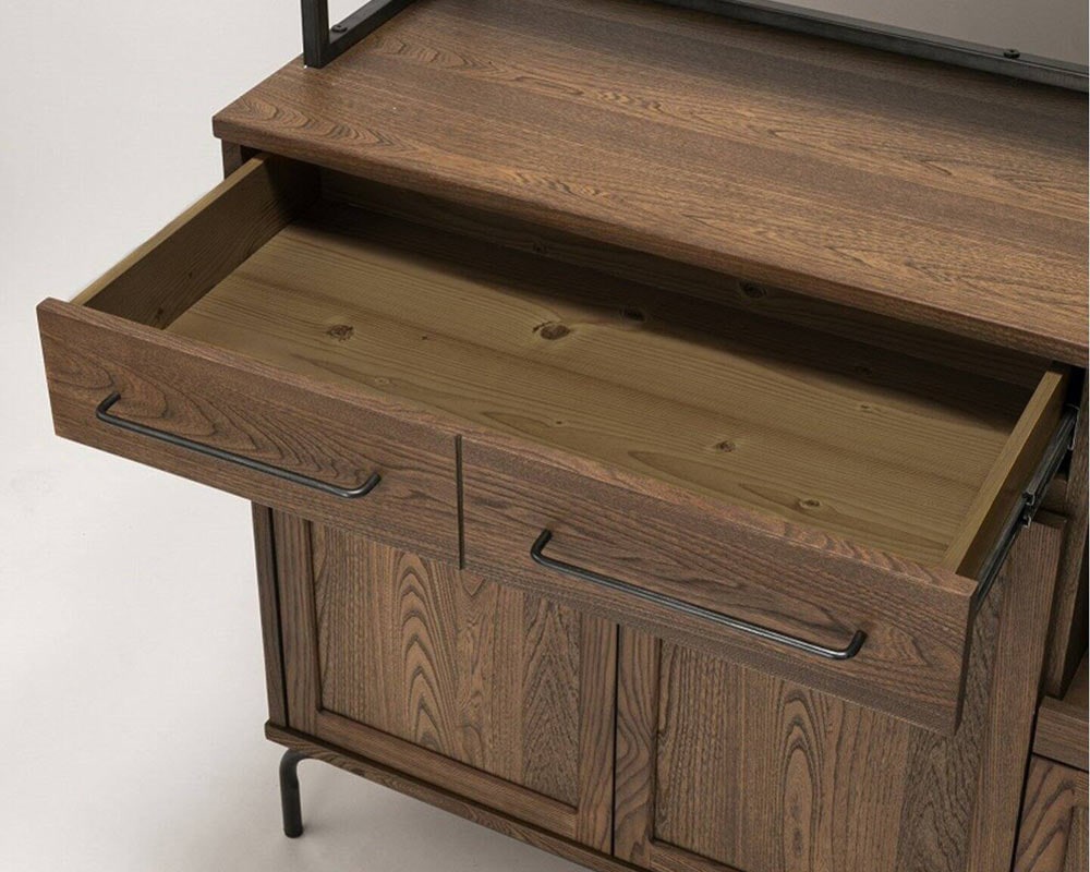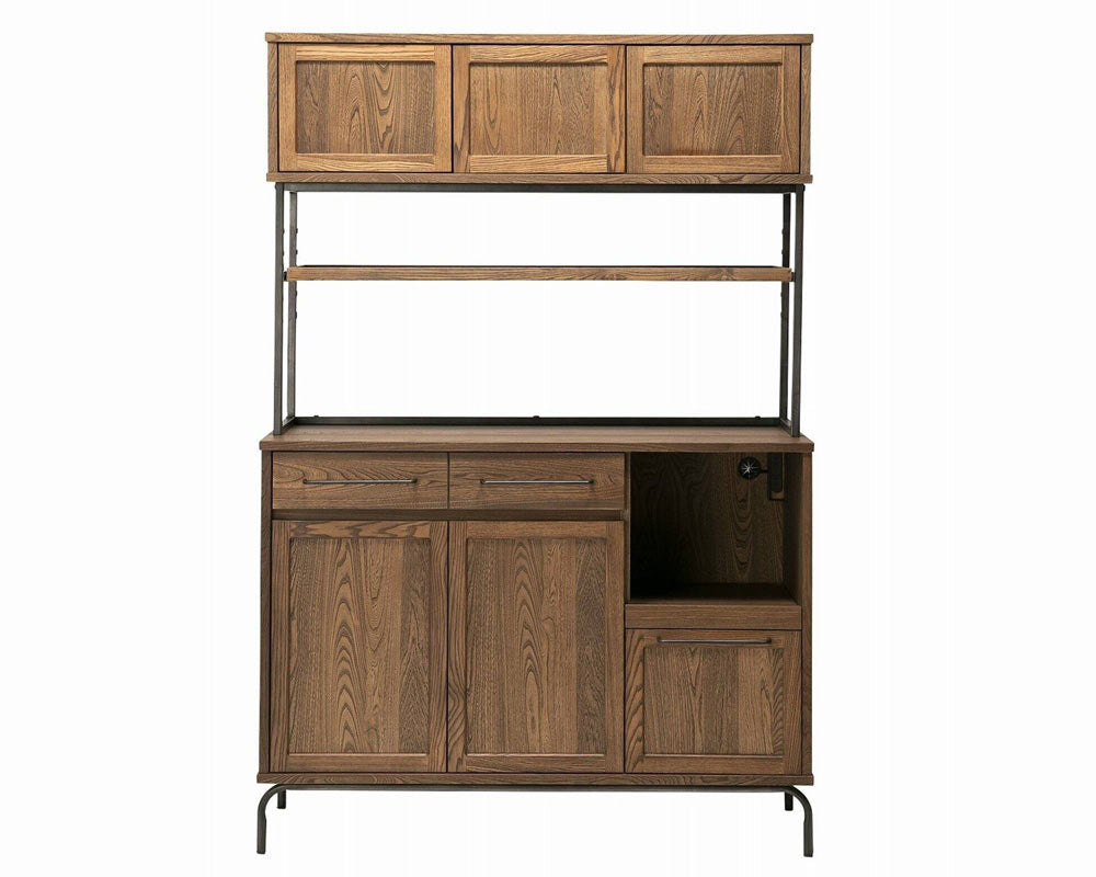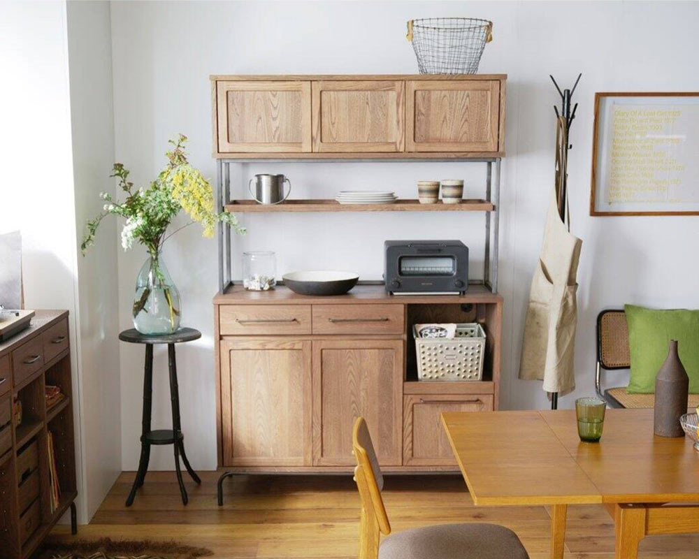 組み合わせてリビング、キッチン、寝室でご利用ができる、ヴィンテージテイストの「TIVERTON/ティバートン」シリーズのキッチンボードです。一般的な家庭のキッチンの広さは4.5帖程度と言われています。実質置ける収納アイテムの大きさは2m前後がおおよその一般的に置けるスペースと考えられます。そこにキッチンカウンターとボードを置く事を考慮してサイズを考えられています。もちろん1台のみでもある程度の機能と収納容量確保出来ますが、TIVERTON/ティバートンシリーズ4種類のサイズバリエーションの組み合わせ次第で、81cm / 121cm / 162cm / 202cm / 242cm と言った形で 40cm刻みで組合せを考えられるので設置スペースに合わせて自由に組み合わせることが可能です。左上引出は浅めのためカトラリーなど細かい収納が可能になっています。左下開き戸手が掛けやすい様に取手を大きくしています。感覚的に手が届き開閉出来る用に気を配っています。右上引出は炊飯器やコーヒーメーカーを置く事を前提して考えた引出式トレーは中にコンセントが装着されています。天板上に調理家電を置いた際も背面に通線口がありますのでここから電源を確保する事が可能です。右下引出は大皿や鍋等も収納する事が出来る目的として設けた深めの引出。乾物などのかさ張る物などの収納にも良さそうです。中段棚板は5ヶ所の高さ調整を行えるようになっています。また、棚板は4方が立ち上がっているので割れ物等を置く際も安心して置く事が出来ます。棚板の下にはマグネットを装着していますので棚板のズレ防止の役割をしています。上段の扉は耐震ラッチになっています。地震等の振動によって内容物が滑り出てこないようにロックが掛かるようになっています。また、タッチラッチ式で押すと開く仕様にしています。キッチンでの作業時は何かと急ぐ事も多いです。少ないアクションで開け閉めが出来る仕様です。さらに、脚下の隙間は11cmで、ロボット掃除機の走行が可能な広さを確保しています。何かと下に物を落とす事の多い床をいつも清潔に保つ事が出来ます。