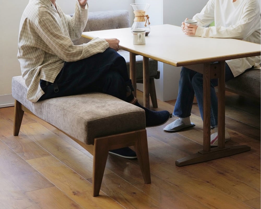 リビングとダイニングをコンパクトに兼用できる、journal standard Furniture(ジャーナルスタンダードファニチャー)の「ALVESTA LD FLAT BENCH/アルベスタ エルディ フラットベンチ」です。実は新築のマンションの専有面積は年々減少してきているのをご存知でしたか? 置ける家具も限られてくるし、けど広さは欲しいけど・・・ そのお悩みを解決するアイテムを企画、新しいライン「ALVESTA/アルベスタ」シリーズになります。アルベスタ LDセットの背無しベンチとして企画され、同シリーズの「アルベスタダイニングテーブル」や「アルベスタLDシート2P/1P」と組み合わせることで、リビング・ダイニングを兼用できるアイテムとなっており、省スペースでソファのようにくつろぐこともダイニングチェアとしてお食事することもできます。よりソファに近い見た目と座り心地を意識し作られており、食事をした後そのままこのチェアに座ってTVなどを見てくつろげる座面の大きさ、背の弾力などを形にしています。コンパクトなサイズ感ですので、ソファが置けない狭小住宅でもリビングダイニング/LDでの使用が可能です。