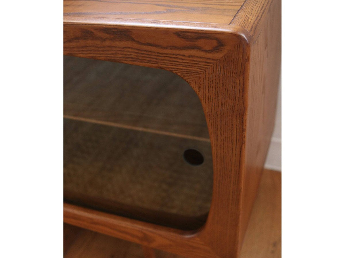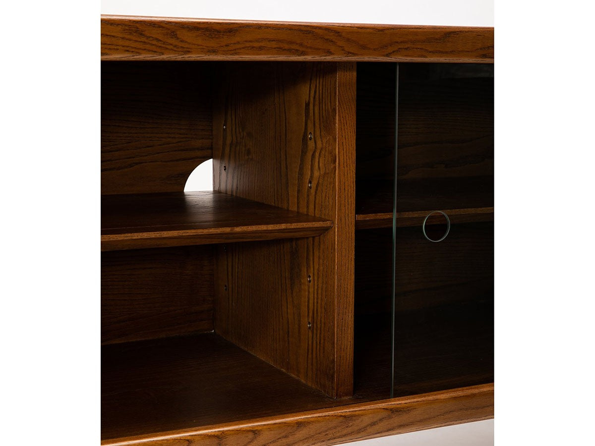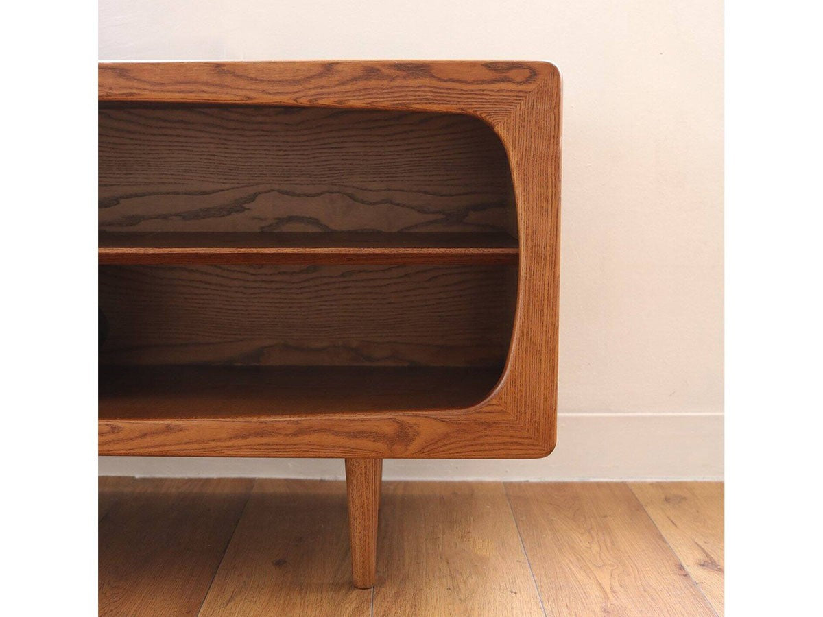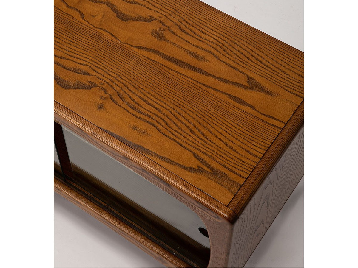 デンマークのヴィンテージのキャビネットをモチーフにデザインされたテレビボード。全体的に丸みを帯びたシェイプで、中の棚板にも丸みを持たせ、薄い板を使用することで、圧迫感のない印象に仕上げられています。前面の縁周りには、木目が美しいアッシュ無垢材を贅沢に使用しています。引き戸には軽やかな印象になるようにガラスを採用しているため、リモコンの使用も可能です。棚板は可動式で取り外すこともできるので、高さのあるものの収納に重宝します。背面中心には配線孔が開いています。デンマークのオーフスにある美術館、「Aros(アロス)」から名づけられており、古き良き北欧に想いを馳せたデザインです。