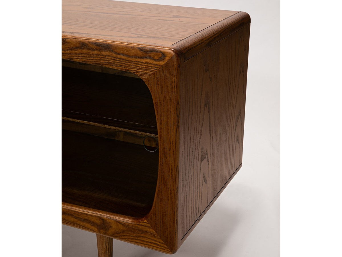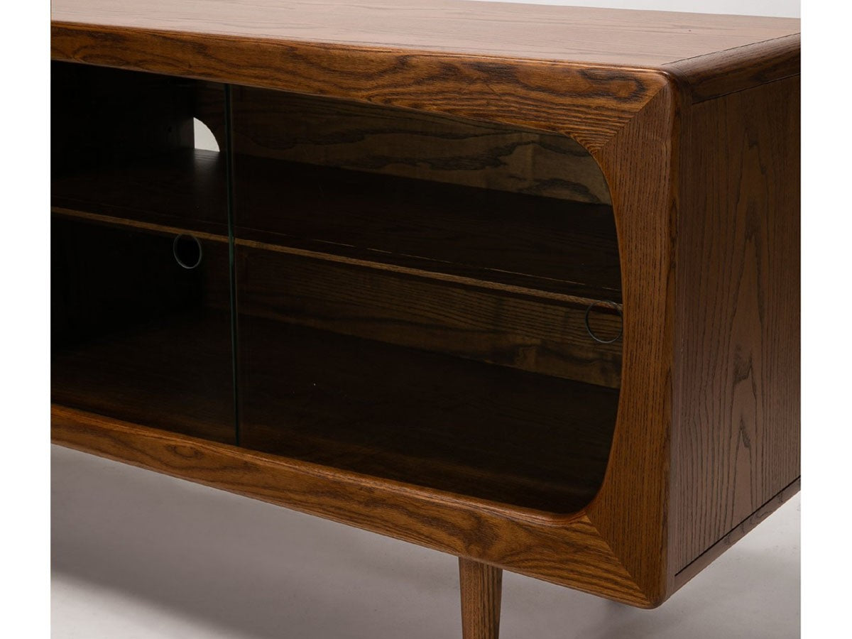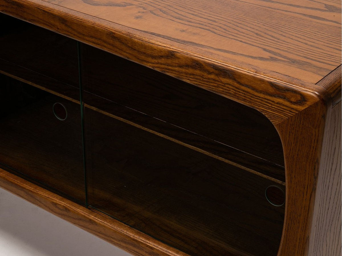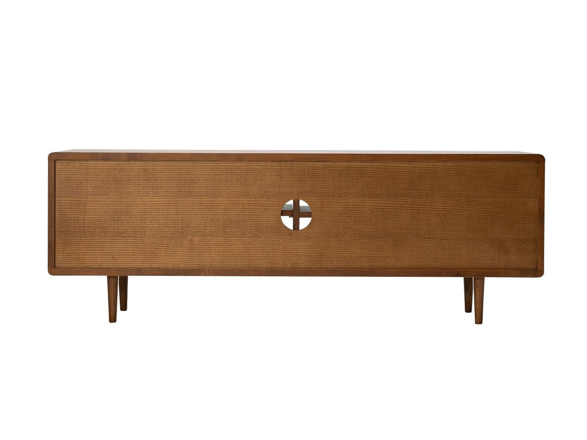 デンマークのヴィンテージのキャビネットをモチーフにデザインされたテレビボード。全体的に丸みを帯びたシェイプで、中の棚板にも丸みを持たせ、薄い板を使用することで、圧迫感のない印象に仕上げられています。前面の縁周りには、木目が美しいアッシュ無垢材を贅沢に使用しています。引き戸には軽やかな印象になるようにガラスを採用しているため、リモコンの使用も可能です。棚板は可動式で取り外すこともできるので、高さのあるものの収納に重宝します。背面中心には配線孔が開いています。デンマークのオーフスにある美術館、「Aros(アロス)」から名づけられており、古き良き北欧に想いを馳せたデザインです。