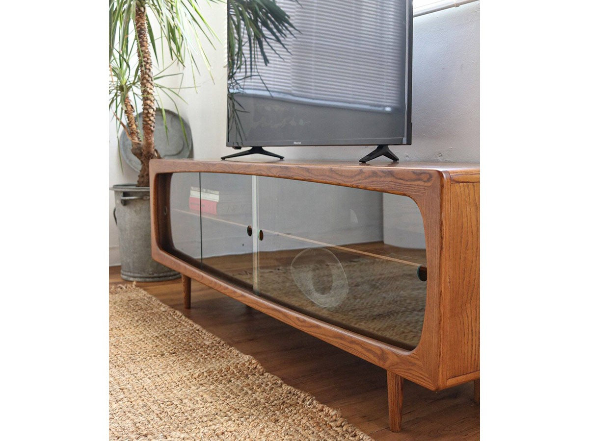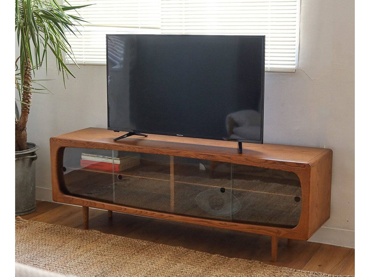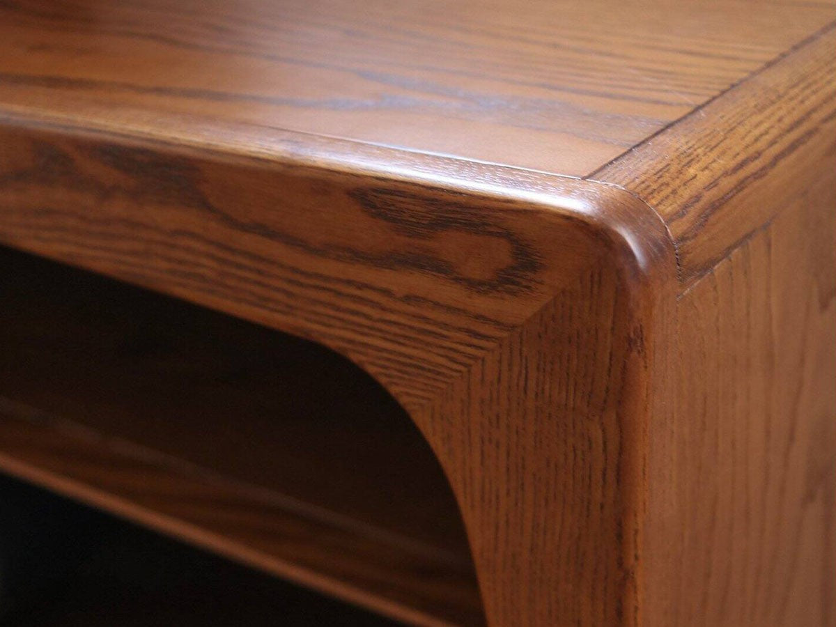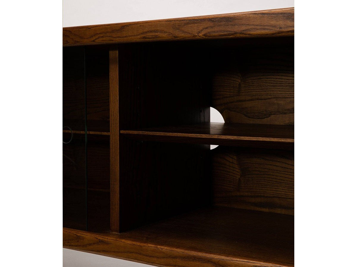 デンマークのヴィンテージのキャビネットをモチーフにデザインされたテレビボード。全体的に丸みを帯びたシェイプで、中の棚板にも丸みを持たせ、薄い板を使用することで、圧迫感のない印象に仕上げられています。前面の縁周りには、木目が美しいアッシュ無垢材を贅沢に使用しています。引き戸には軽やかな印象になるようにガラスを採用しているため、リモコンの使用も可能です。棚板は可動式で取り外すこともできるので、高さのあるものの収納に重宝します。背面中心には配線孔が開いています。デンマークのオーフスにある美術館、「Aros(アロス)」から名づけられており、古き良き北欧に想いを馳せたデザインです。