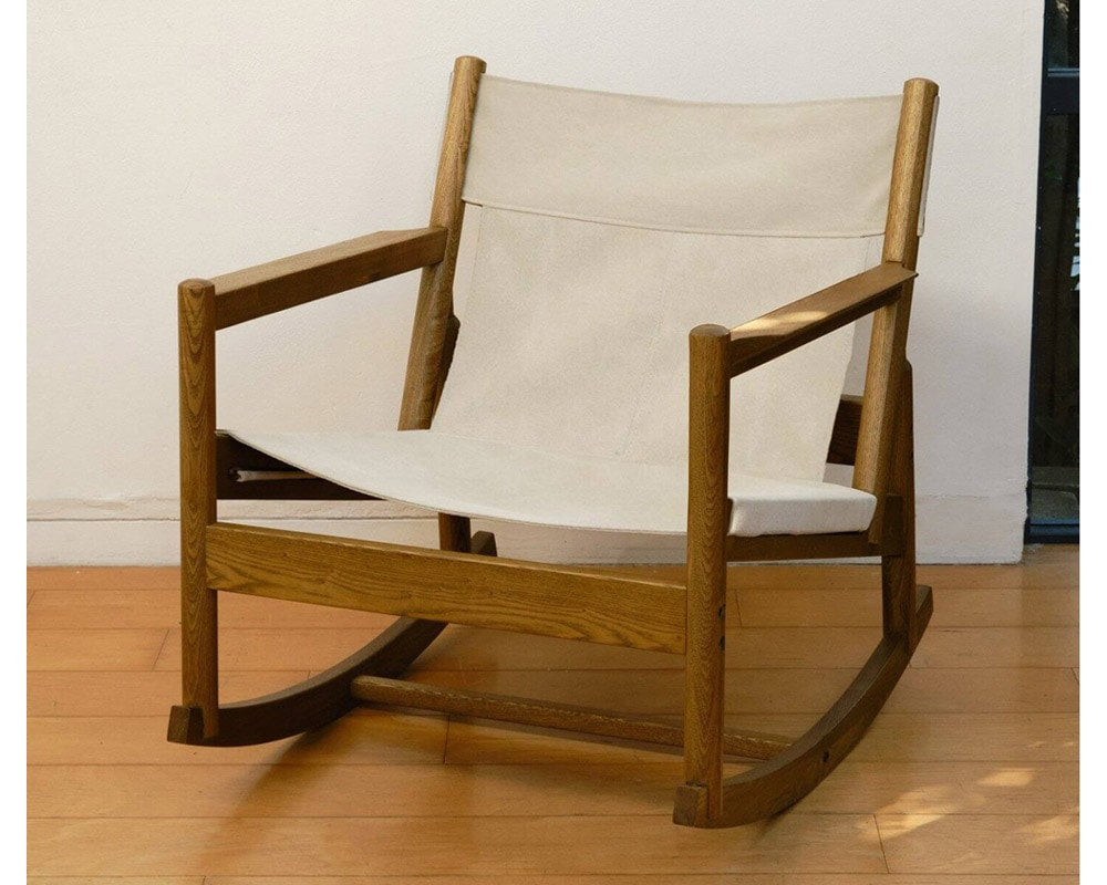 ヴィンテージのサファリチェアからインスパイアを受けてデザインした、journal standard Furniture(ジャーナルスタンダードファニチャー)の「COLTONROCKING CHAIR/コルトンロッキングチェア」です。ヴィンテージのサファリチェアからインスパイアを受けてデザインしたダイニングチェアです。張地はコットンキャンバス生地と、スプリットレザー使用したレザータイプとの2種類でご用意しております。同シリーズの中でも、ロッキングタイプはまさにハンモックに座っているような感覚を味わえる仕上がりになっています。一人掛けのラウンジチェアはどうしても大きく見えがちですが、見た目がスッキリしていることもあり、圧迫感を与えずにお部屋に置くことができます。また、丸みを帯びながらストレートなソリッド感も併せ持っているので、様々なテイストの家具にも合わせやすくなっております。サイズに対して比較的軽量に仕上がっていますので、晴れた気持ちの良い日にはテラスに持ち出して外で食事をとっていただくのもおすすめです。自宅で過ごす時間も増え、一人でゆったりと腰をかけたい、という方におすすめの一脚です。こちらの商品はボルトで組上げた商品になりますので、解体することで生地を取り外すことが可能です。
