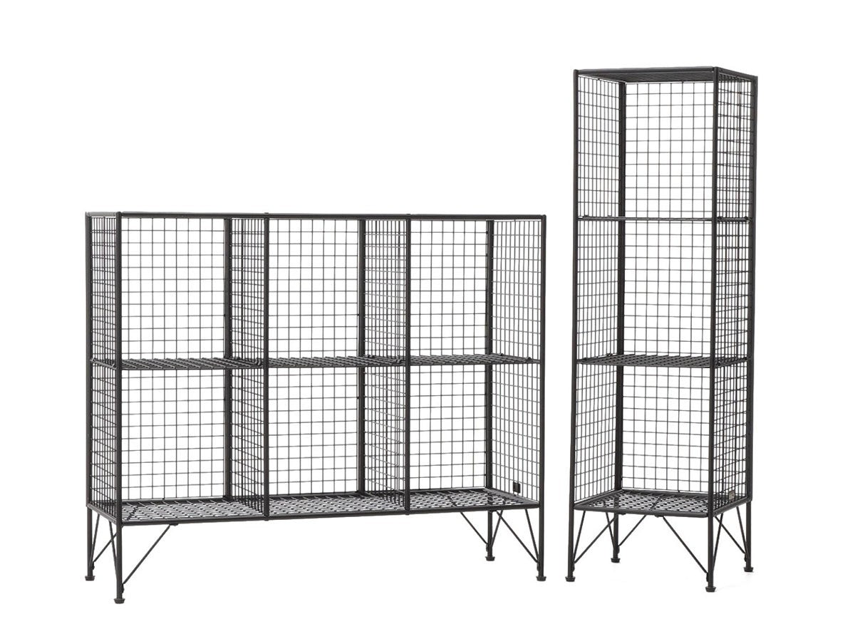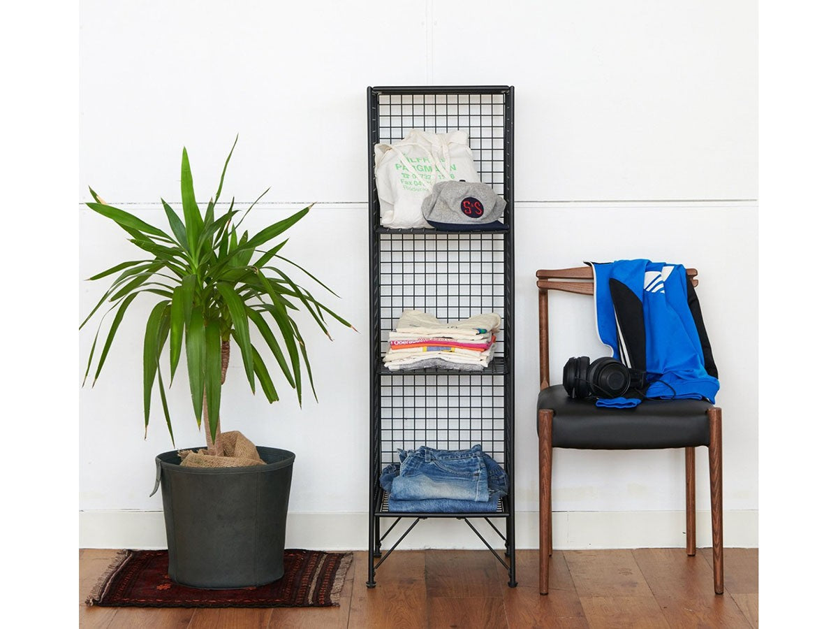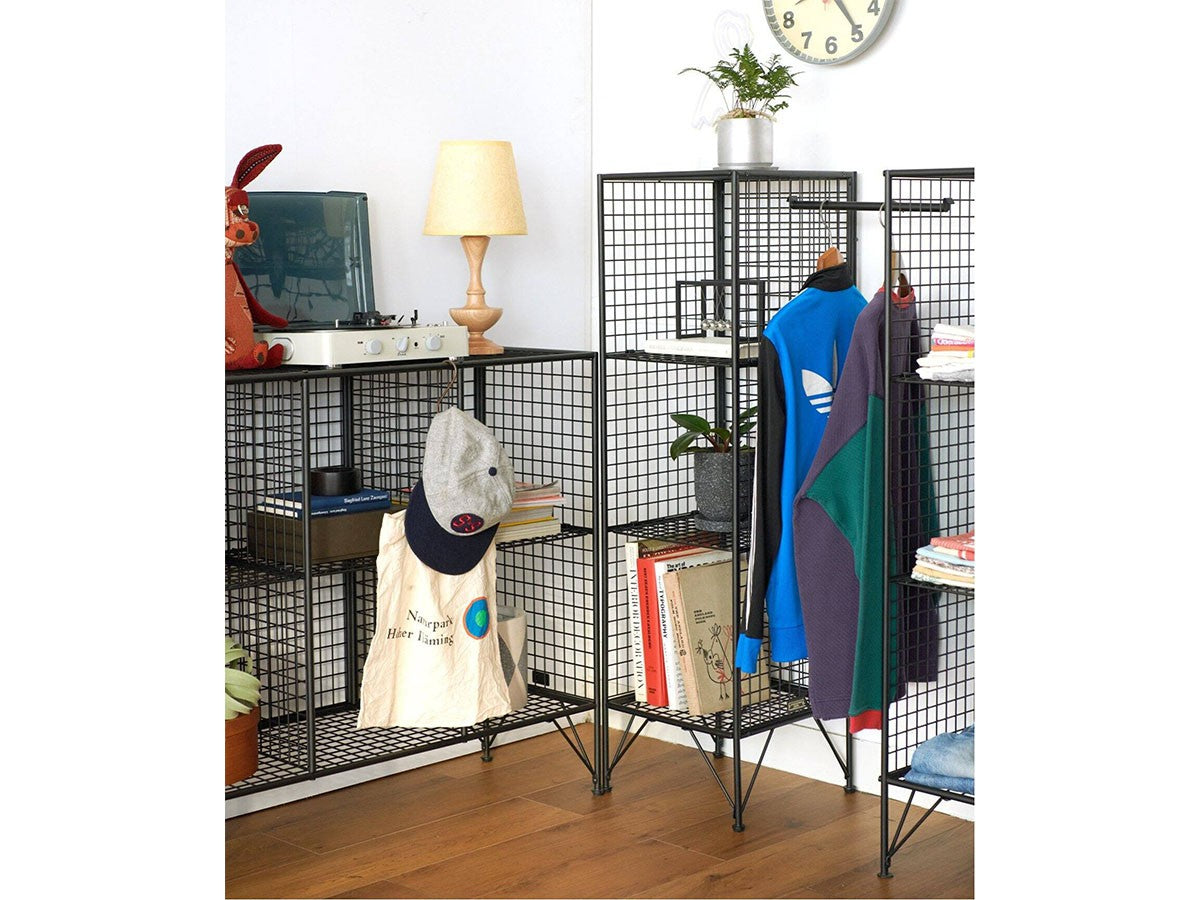ヴィンテージ家具で見かけるメッシュ仕様のラックを、現代の生活スタイルに合わせてリデザイン。全面がメッシュなので圧迫感を与えず、モダンな空間を演出することができます。お気に入りの雑貨や洋服、本、レコードなどを飾って楽しめる、アパレル什器のような収納家具です。1〜4列までサイズバリエーションがあり、複数台組み合わせて、用途やスペースに合った壁面収納をレイアウトできます。棚板を外してハンガーバーを取付ければ、ハンガーラックとしてシャツやジャケットを掛けることができます。また、同シリーズのメッシュボックスを収納箱として使用することも可能です。