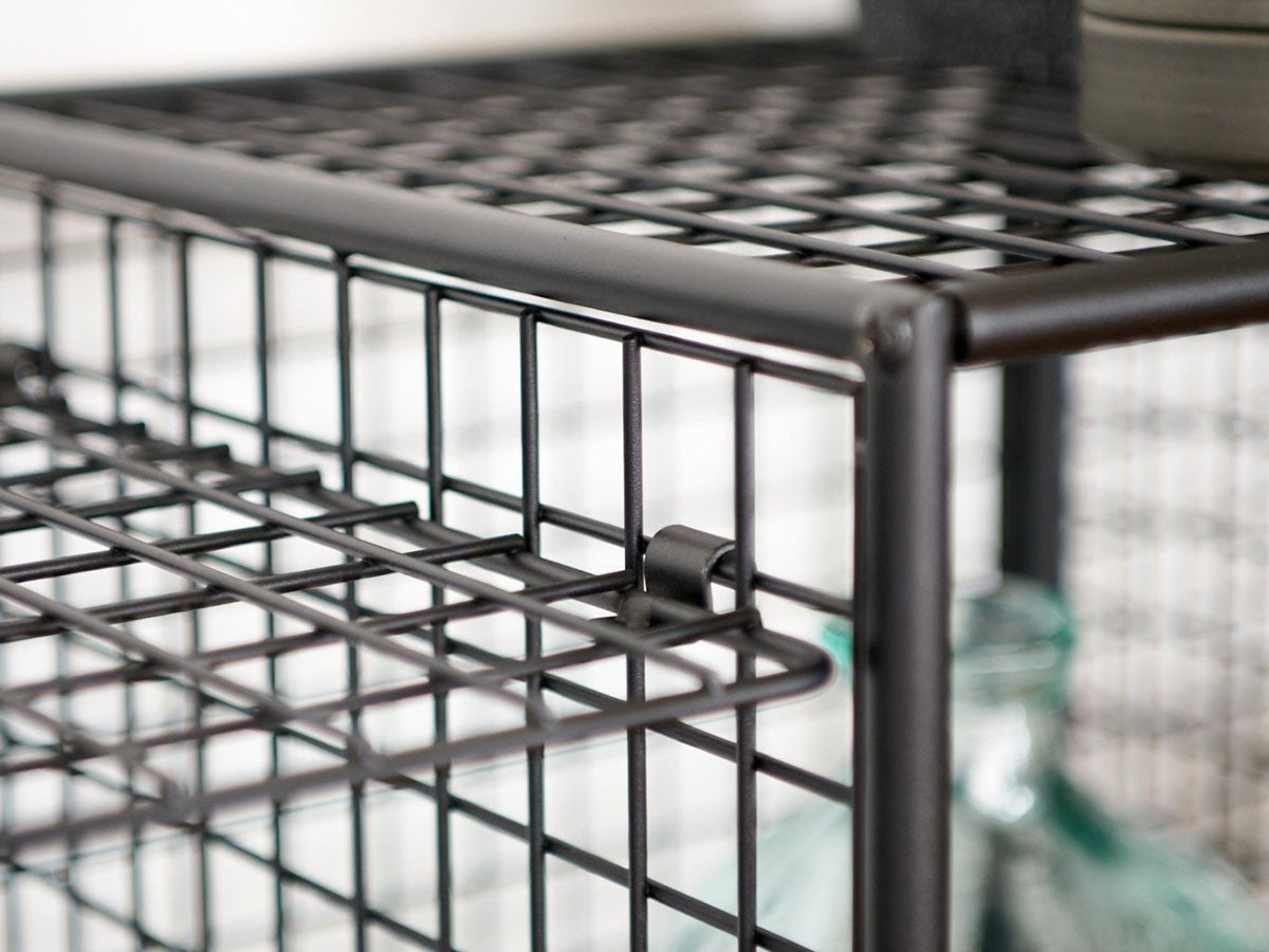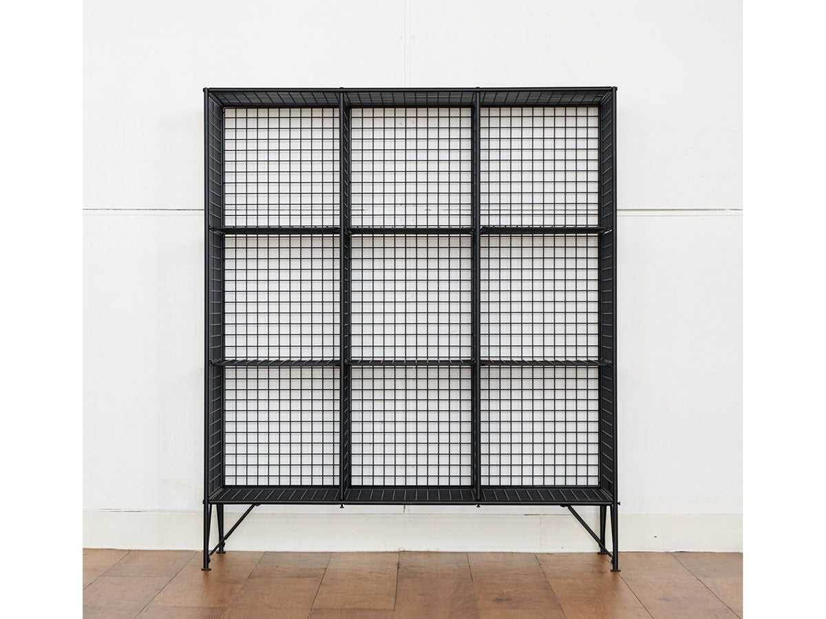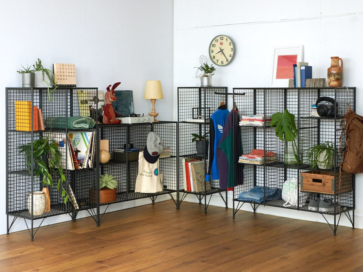 ヴィンテージ家具で見かけるメッシュ仕様のラックを、現代の生活スタイルに合わせてリデザイン。全面がメッシュなので圧迫感を与えず、モダンな空間を演出することができます。お気に入りの雑貨や洋服、本、レコードなどを飾って楽しめる、アパレル什器のような収納家具です。1〜4列までサイズバリエーションがあり、複数台組み合わせて、用途やスペースに合った壁面収納をレイアウトできます。棚板を外してハンガーバーを取付ければ、ハンガーラックとしてシャツやジャケットを掛けることができます。また、同シリーズのメッシュボックスを収納箱として使用することも可能です。