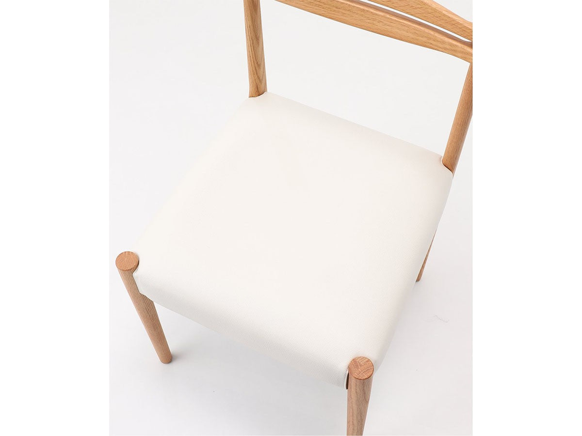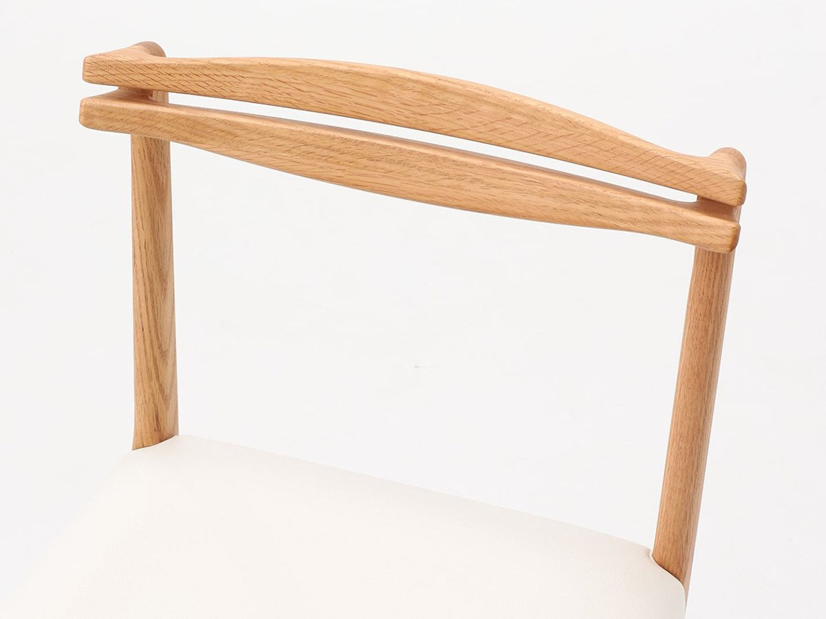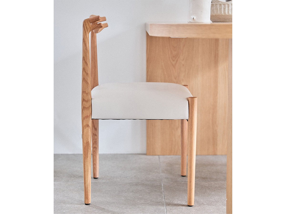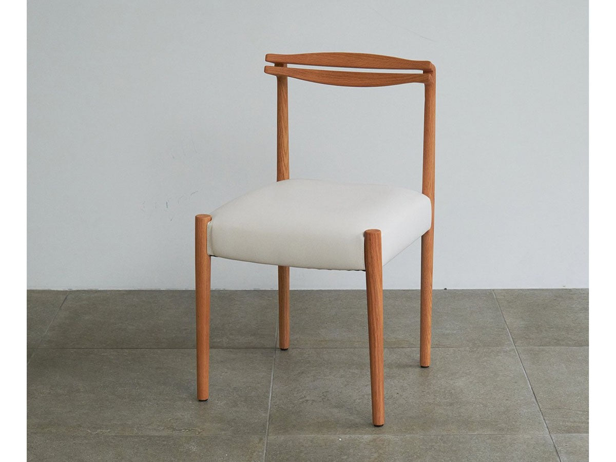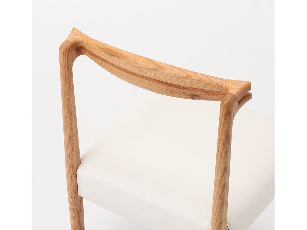 後ろ脚から背もたれへの接合部の意匠が美しいダイニングチェア。木目がきれいなレッドオーク材、強度が高く頑丈なビーチ材の無垢材を使用しています。脚の貫をなくしてすっきりしたデザインにすることで、軽量化を実現しています。座面にはお手入れのしやすいPVC素材を採用。オプションでグレー色のファブリック製カバーがあり、気分や季節に応じて付け替えてお楽しみいただけます。