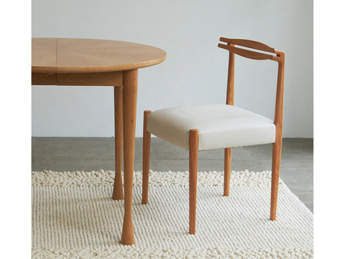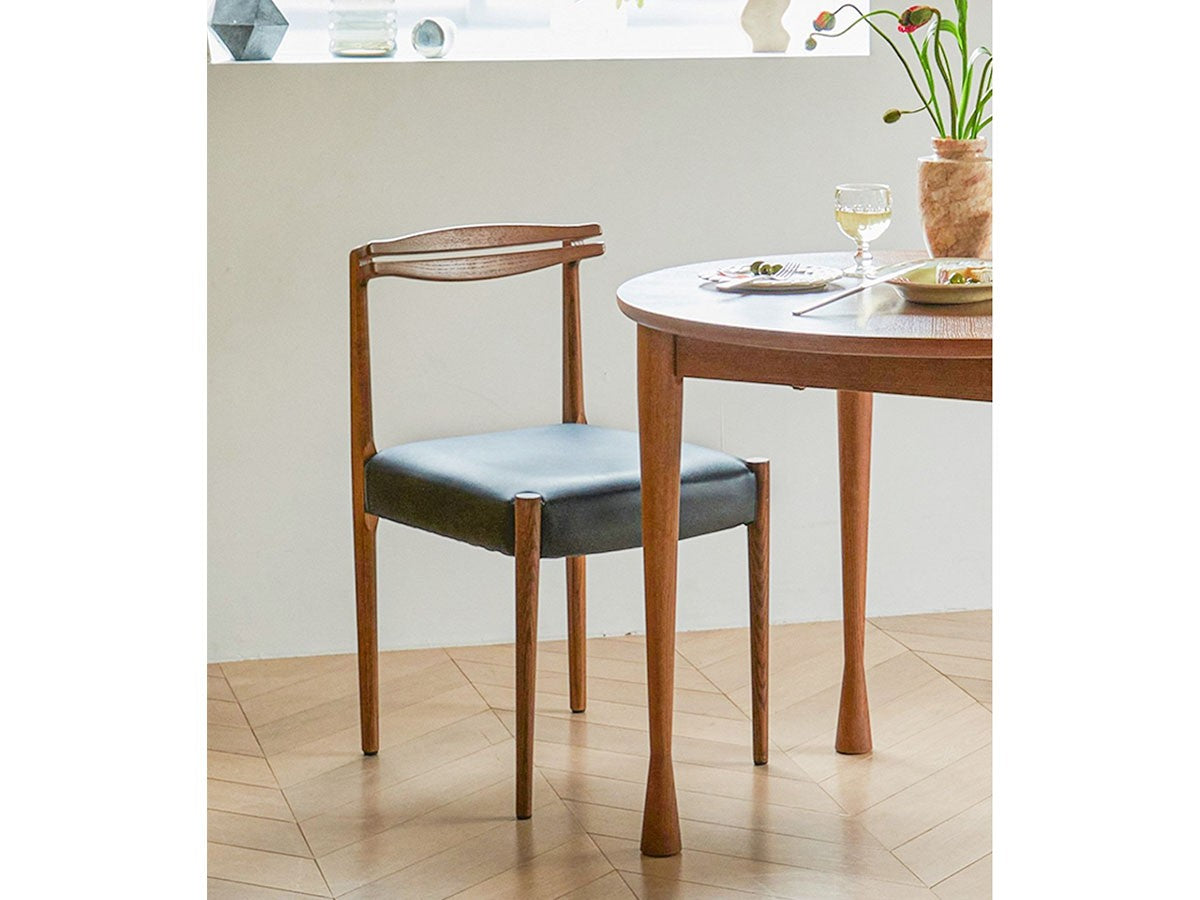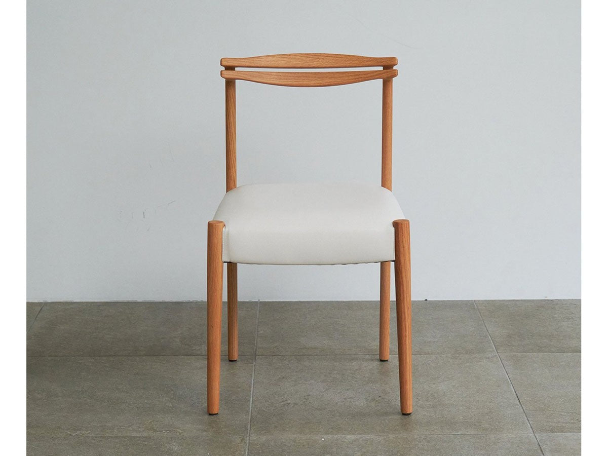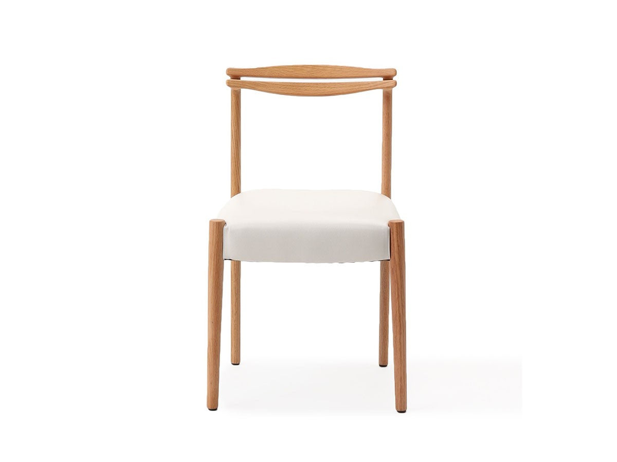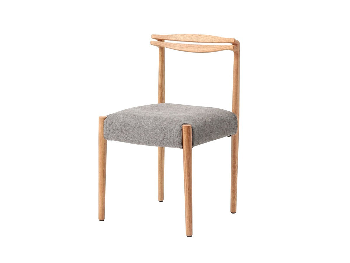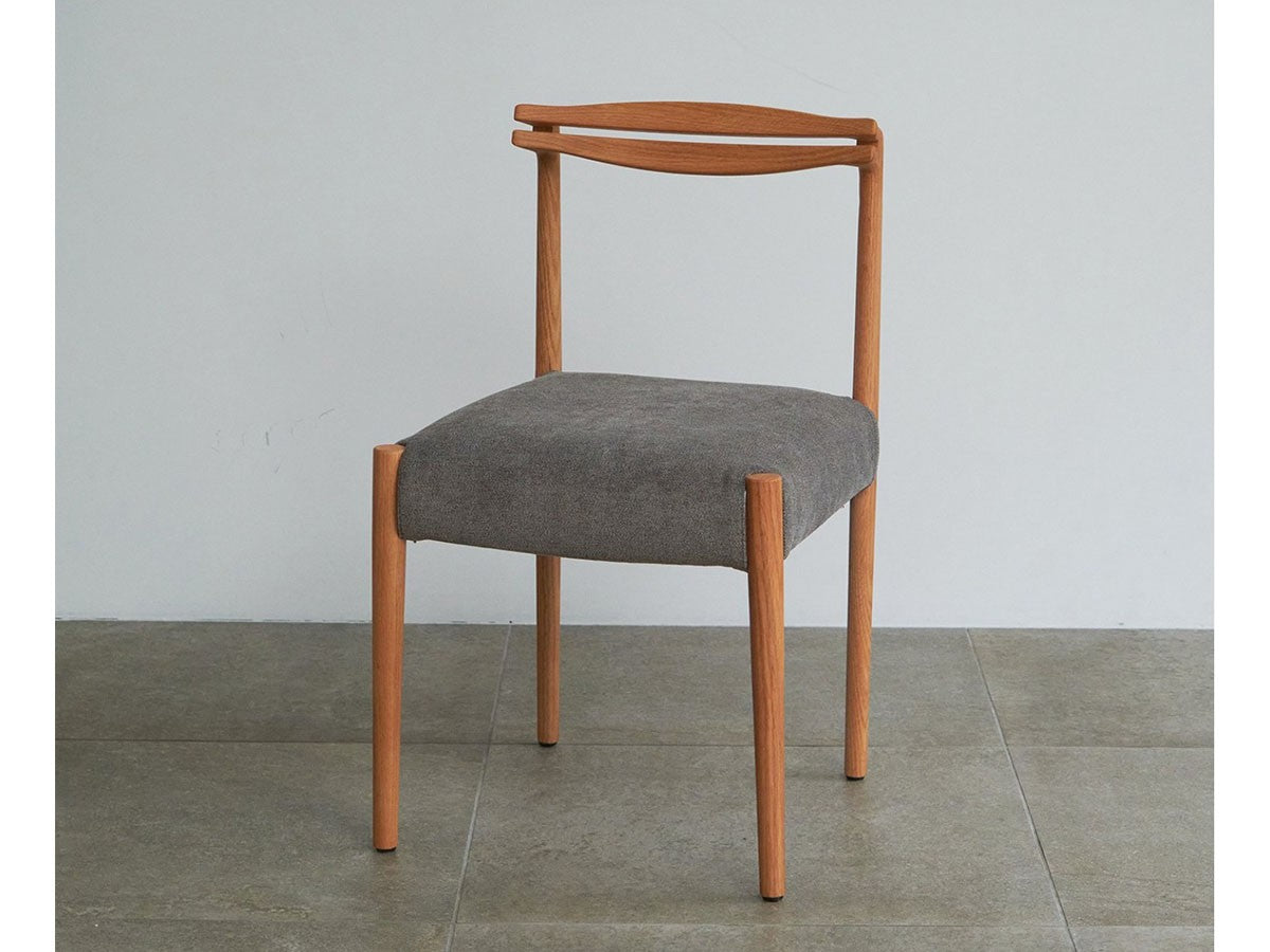 後ろ脚から背もたれへの接合部の意匠が美しいダイニングチェア。木目がきれいなレッドオーク材、強度が高く頑丈なビーチ材の無垢材を使用しています。脚の貫をなくしてすっきりしたデザインにすることで、軽量化を実現しています。座面にはお手入れのしやすいPVC素材を採用。オプションでグレー色のファブリック製カバーがあり、気分や季節に応じて付け替えてお楽しみいただけます。