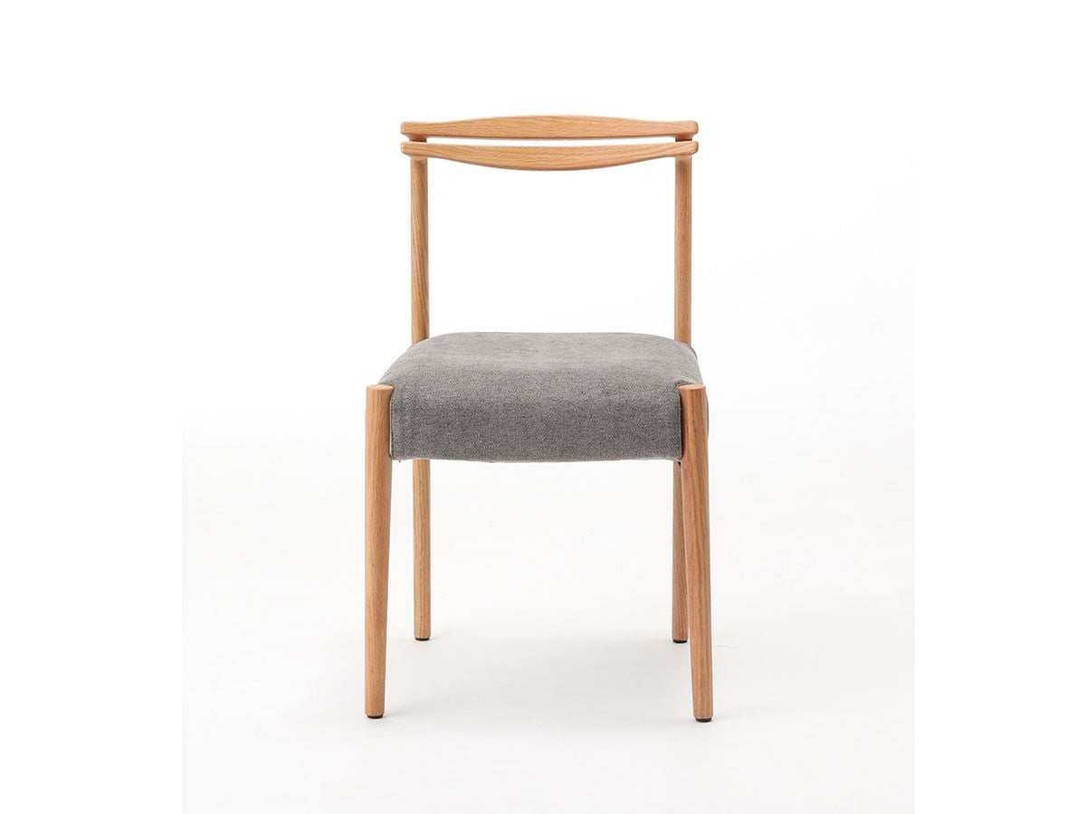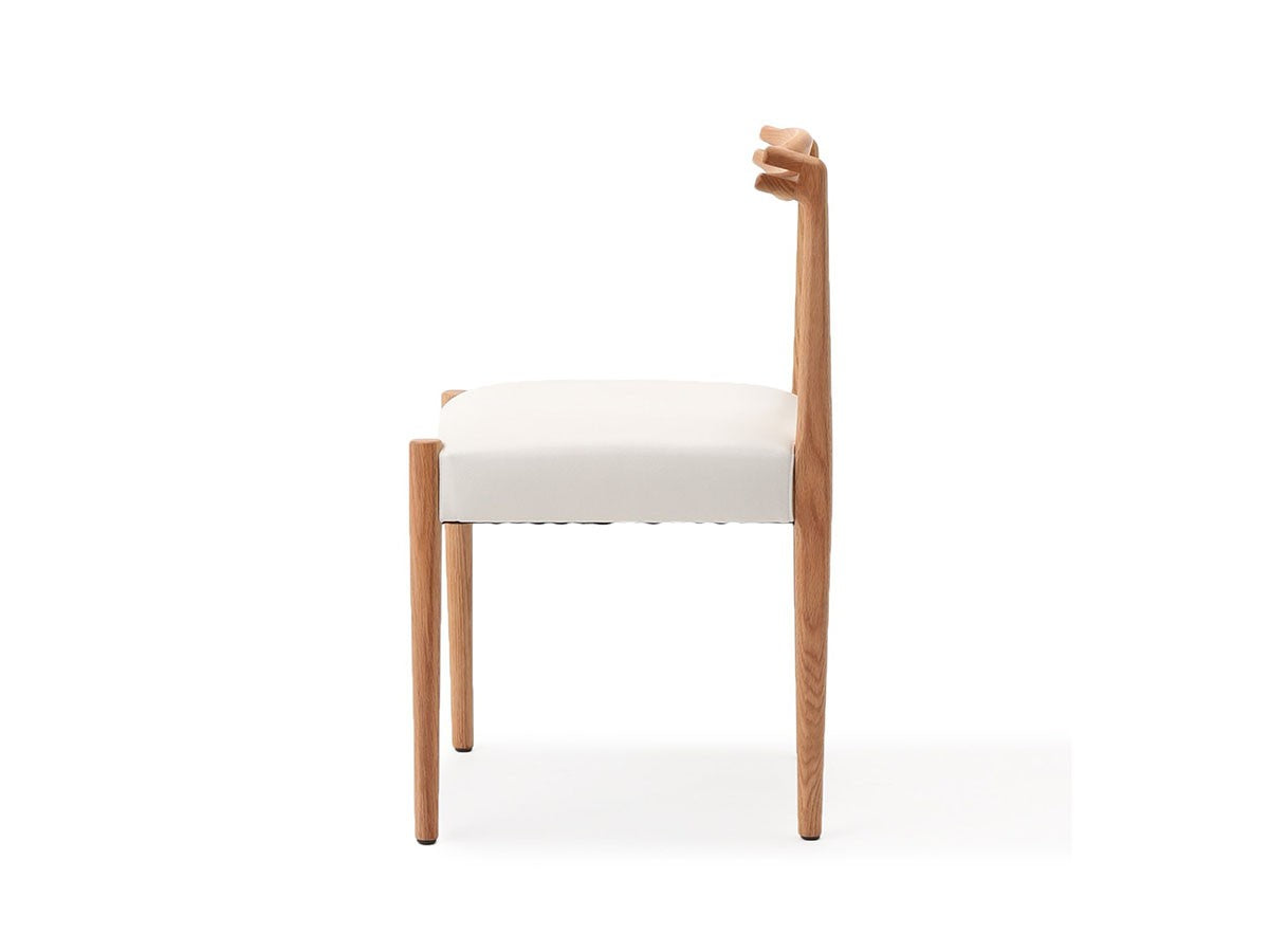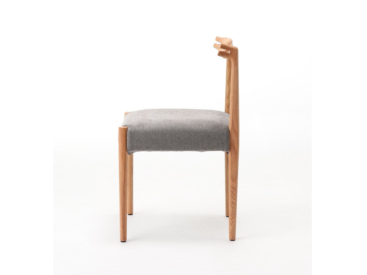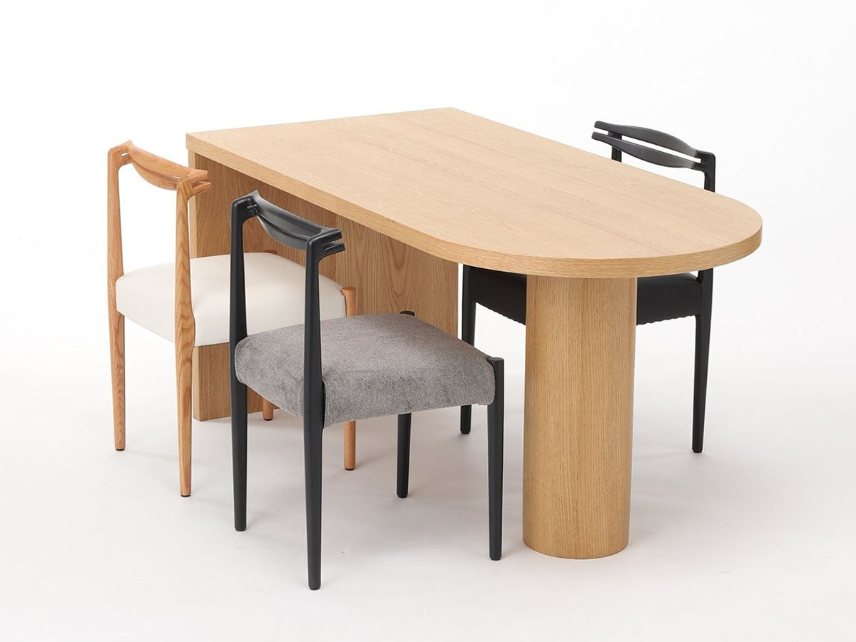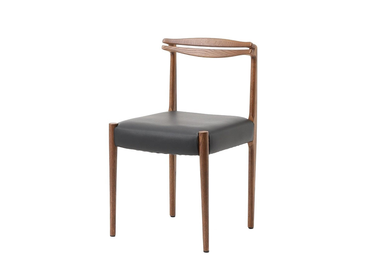 後ろ脚から背もたれへの接合部の意匠が美しいダイニングチェア。木目がきれいなレッドオーク材、強度が高く頑丈なビーチ材の無垢材を使用しています。脚の貫をなくしてすっきりしたデザインにすることで、軽量化を実現しています。座面にはお手入れのしやすいPVC素材を採用。オプションでグレー色のファブリック製カバーがあり、気分や季節に応じて付け替えてお楽しみいただけます。