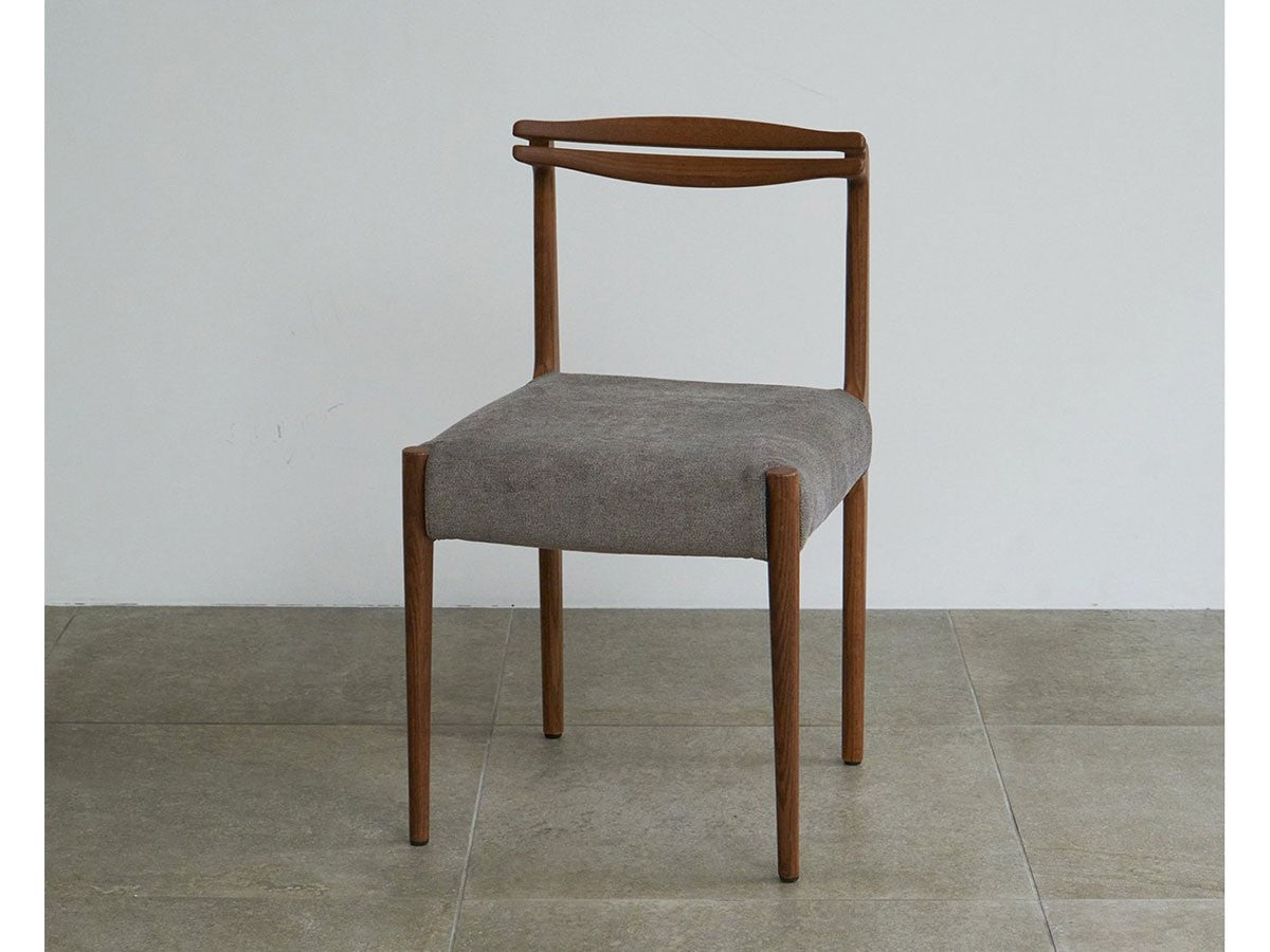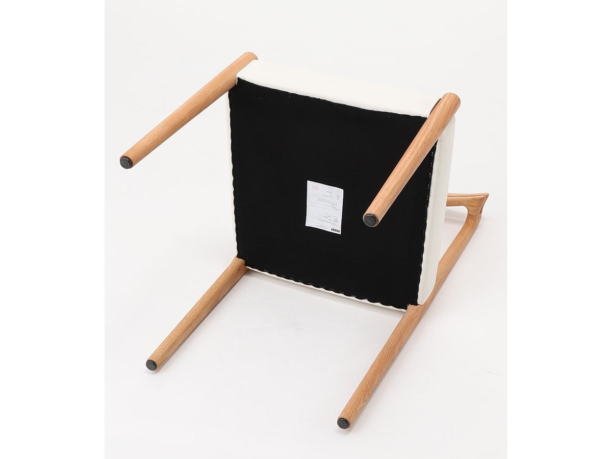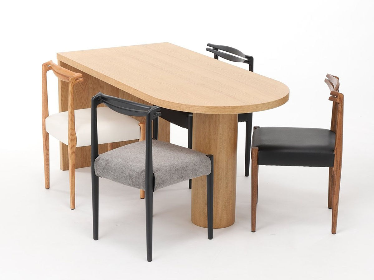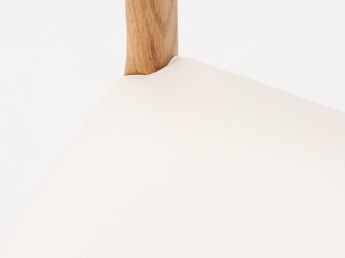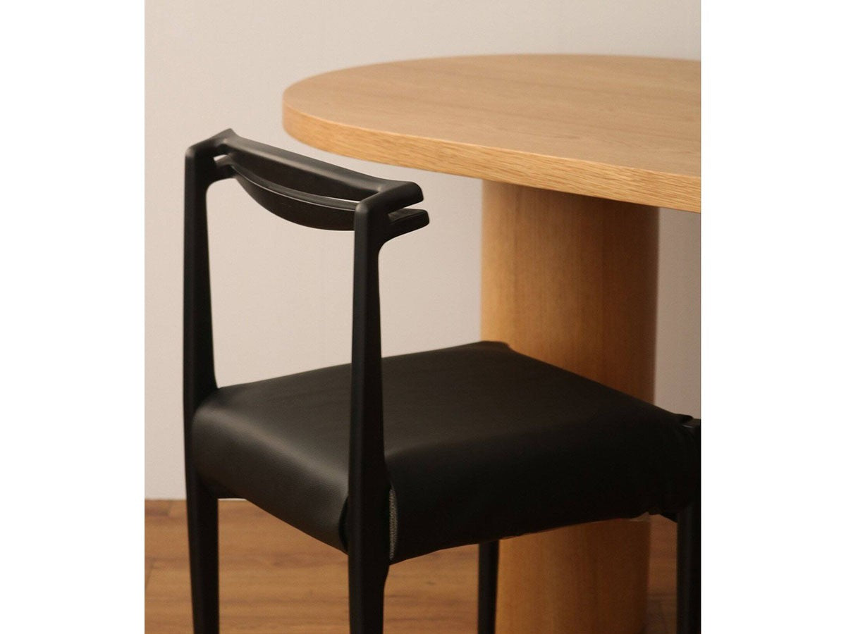 後ろ脚から背もたれへの接合部の意匠が美しいダイニングチェア。木目がきれいなレッドオーク材、強度が高く頑丈なビーチ材の無垢材を使用しています。脚の貫をなくしてすっきりしたデザインにすることで、軽量化を実現しています。座面にはお手入れのしやすいPVC素材を採用。オプションでグレー色のファブリック製カバーがあり、気分や季節に応じて付け替えてお楽しみいただけます。
