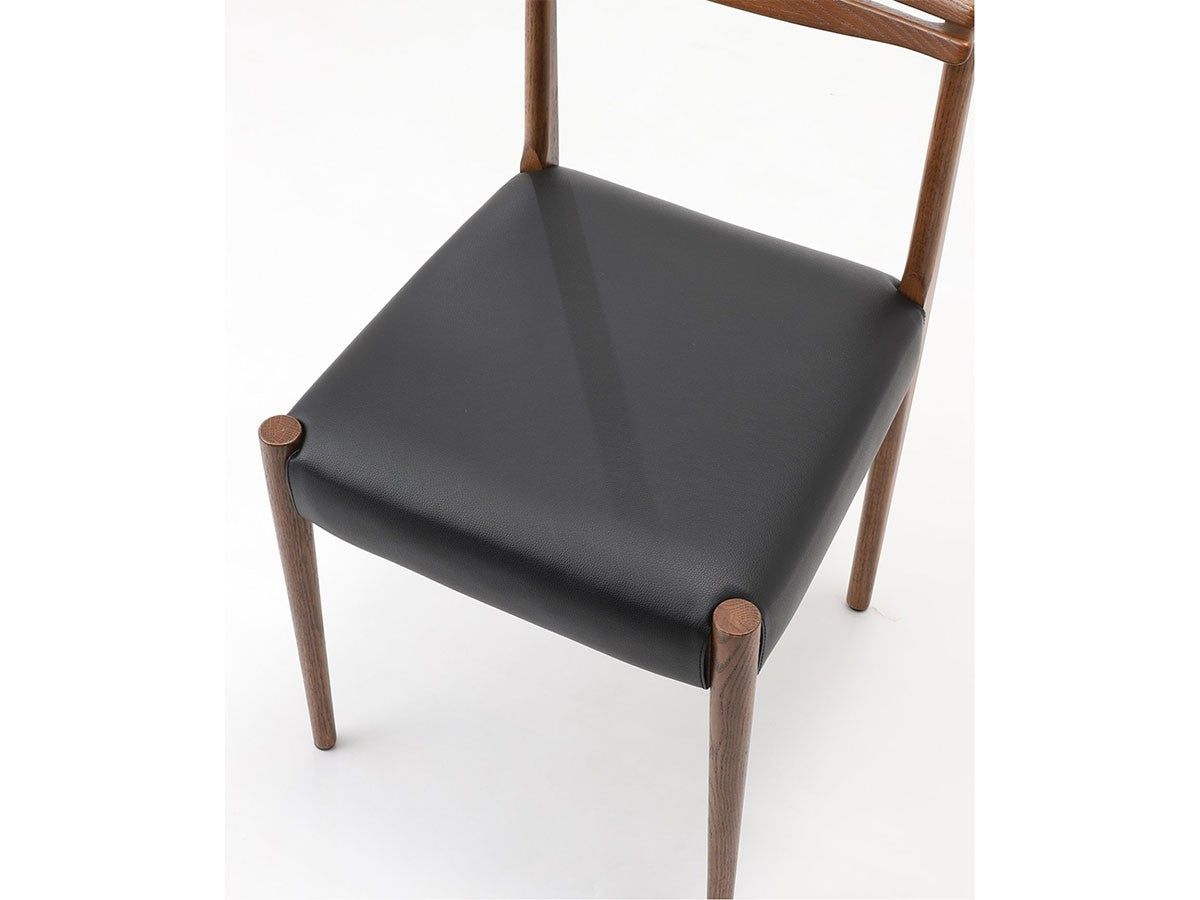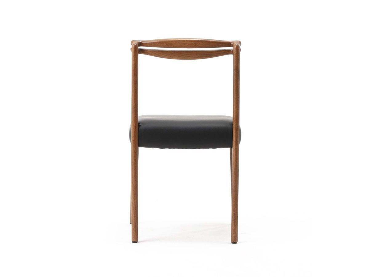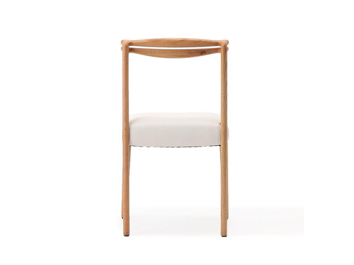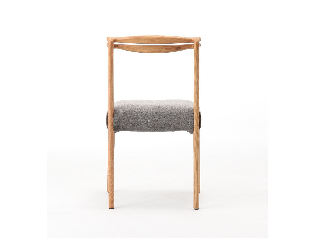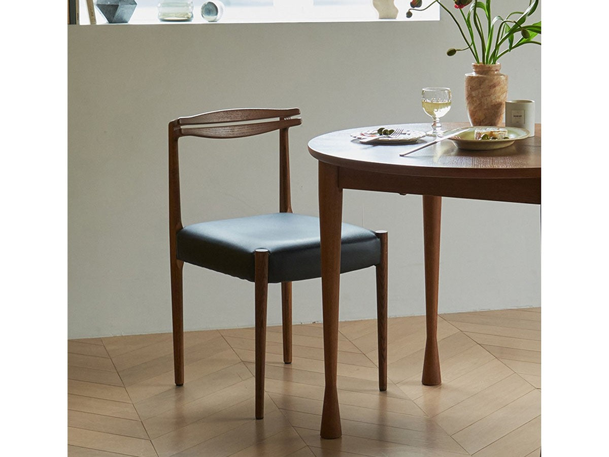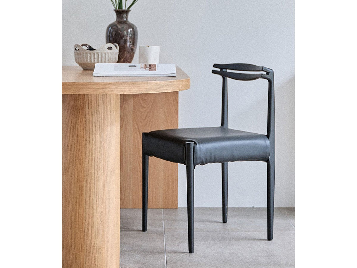 後ろ脚から背もたれへの接合部の意匠が美しいダイニングチェア。木目がきれいなレッドオーク材、強度が高く頑丈なビーチ材の無垢材を使用しています。脚の貫をなくしてすっきりしたデザインにすることで、軽量化を実現しています。座面にはお手入れのしやすいPVC素材を採用。オプションでグレー色のファブリック製カバーがあり、気分や季節に応じて付け替えてお楽しみいただけます。