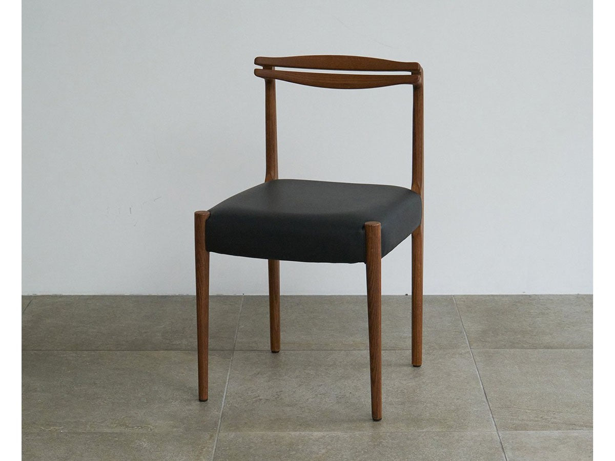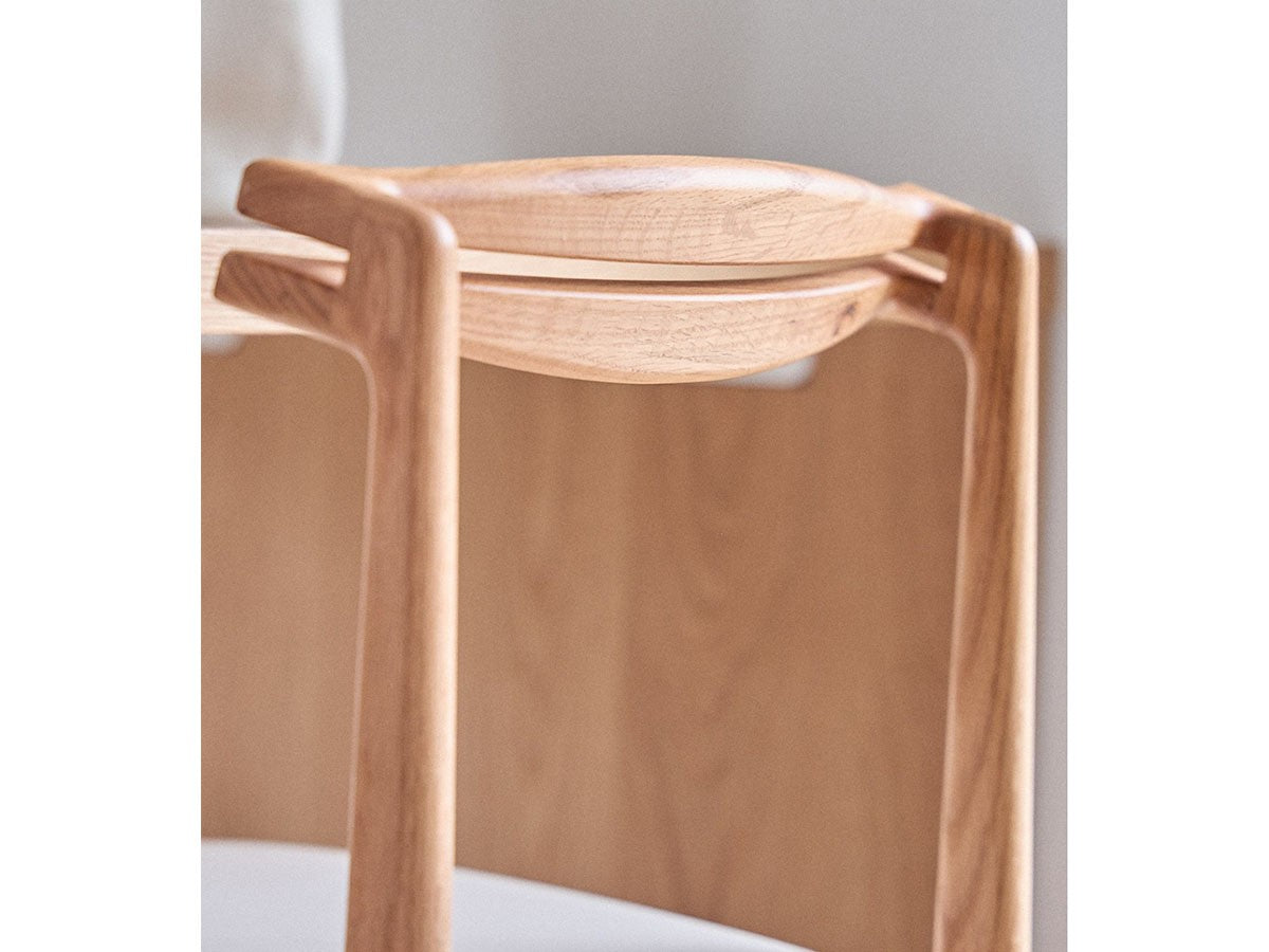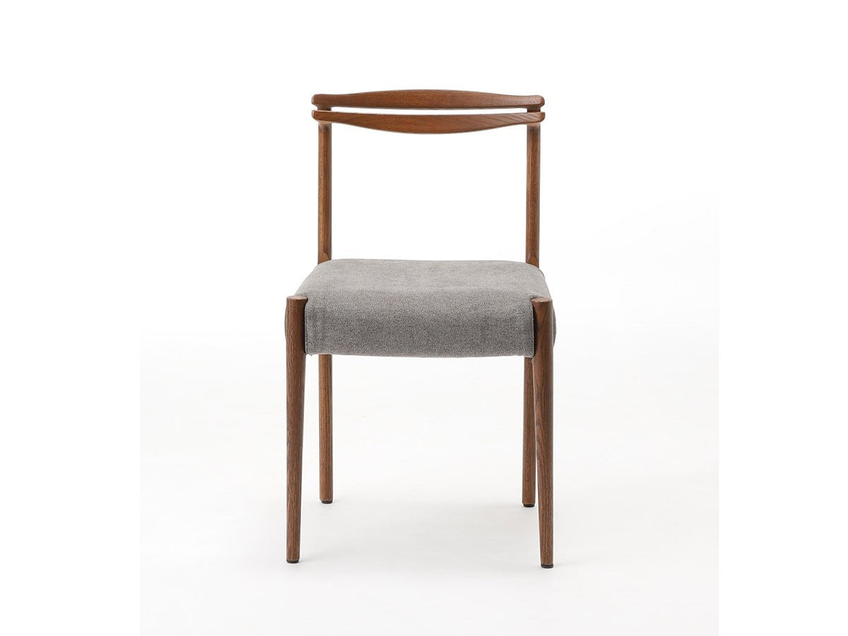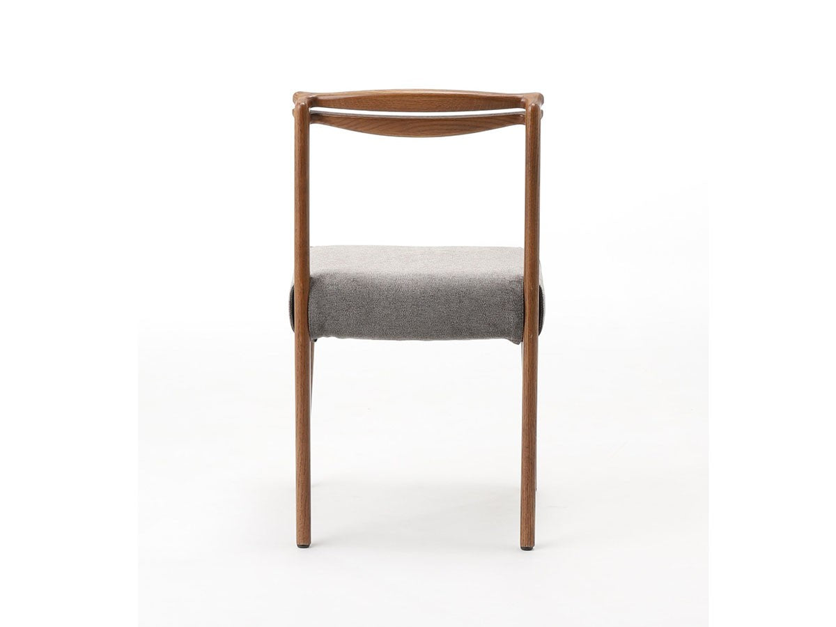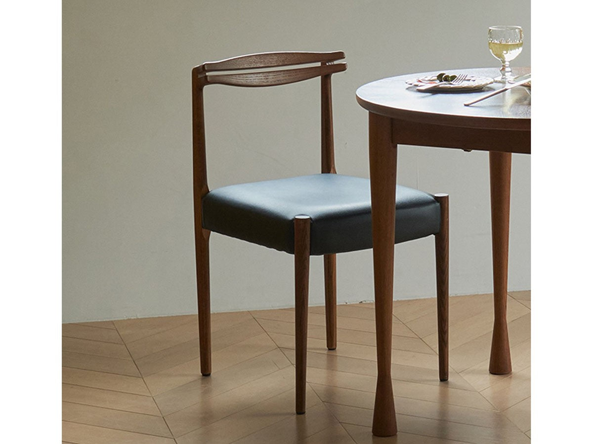 後ろ脚から背もたれへの接合部の意匠が美しいダイニングチェア。木目がきれいなレッドオーク材、強度が高く頑丈なビーチ材の無垢材を使用しています。脚の貫をなくしてすっきりしたデザインにすることで、軽量化を実現しています。座面にはお手入れのしやすいPVC素材を採用。オプションでグレー色のファブリック製カバーがあり、気分や季節に応じて付け替えてお楽しみいただけます。