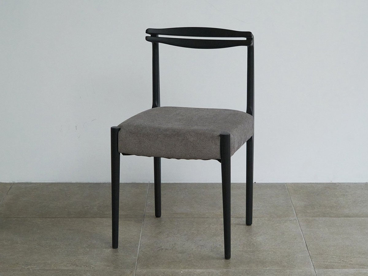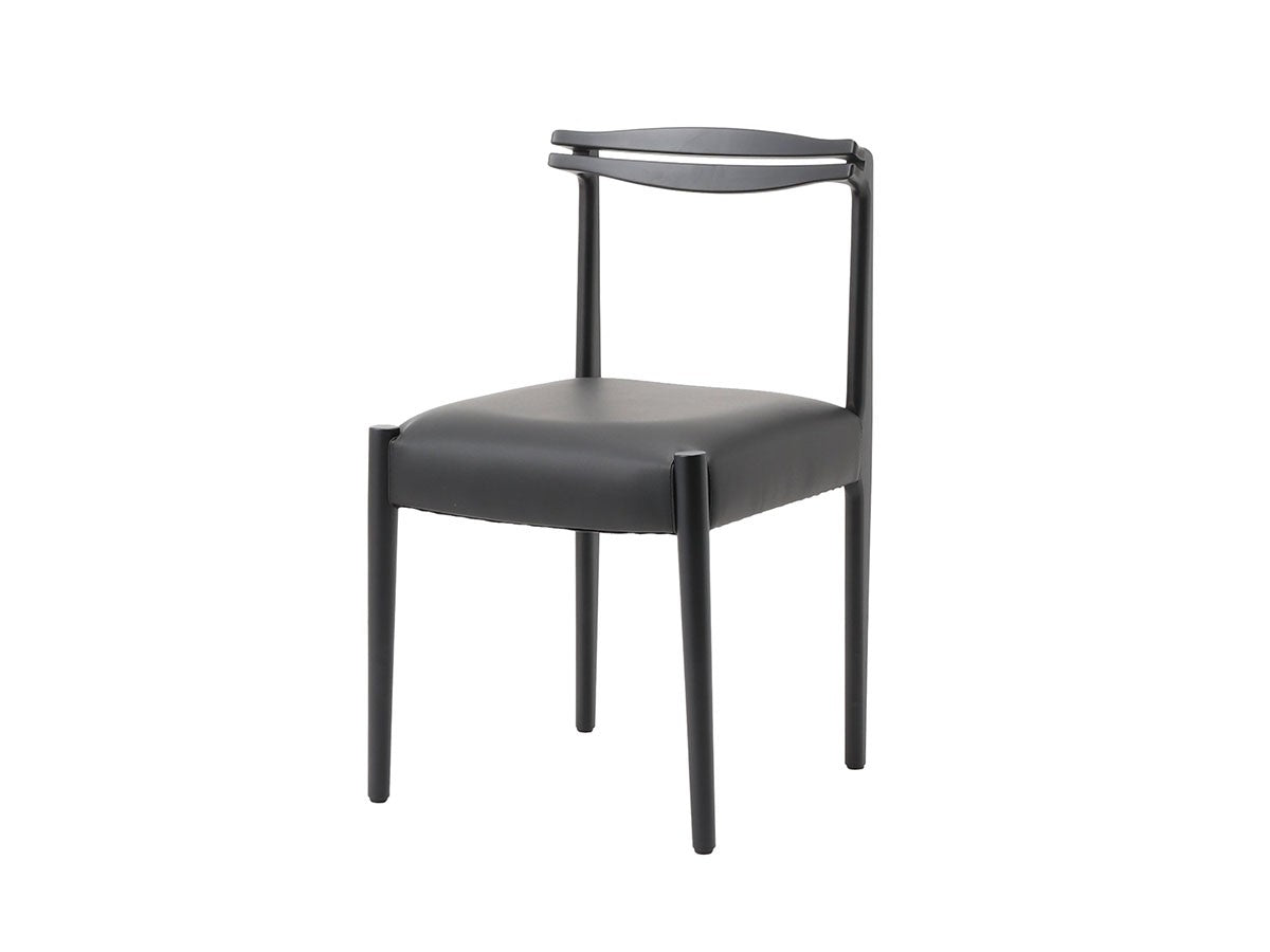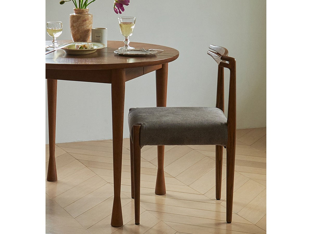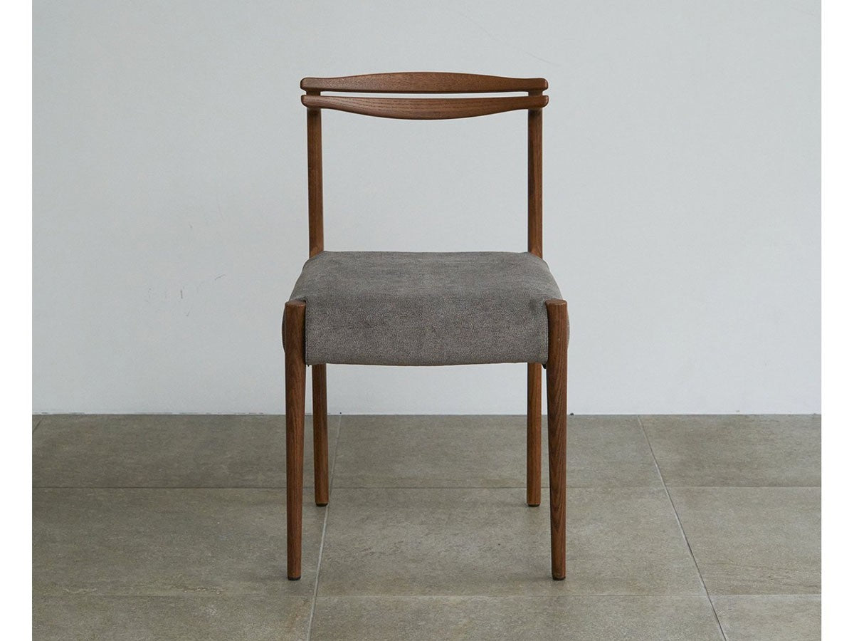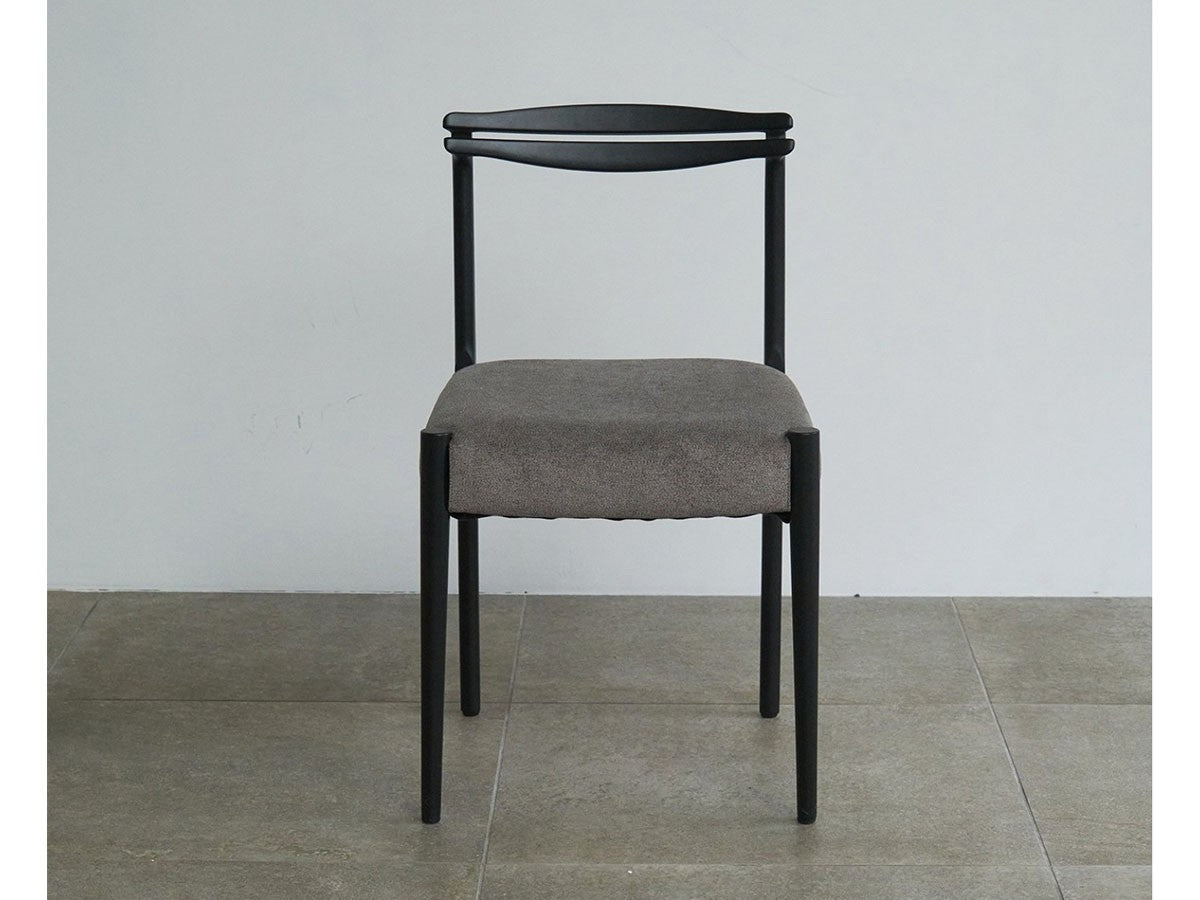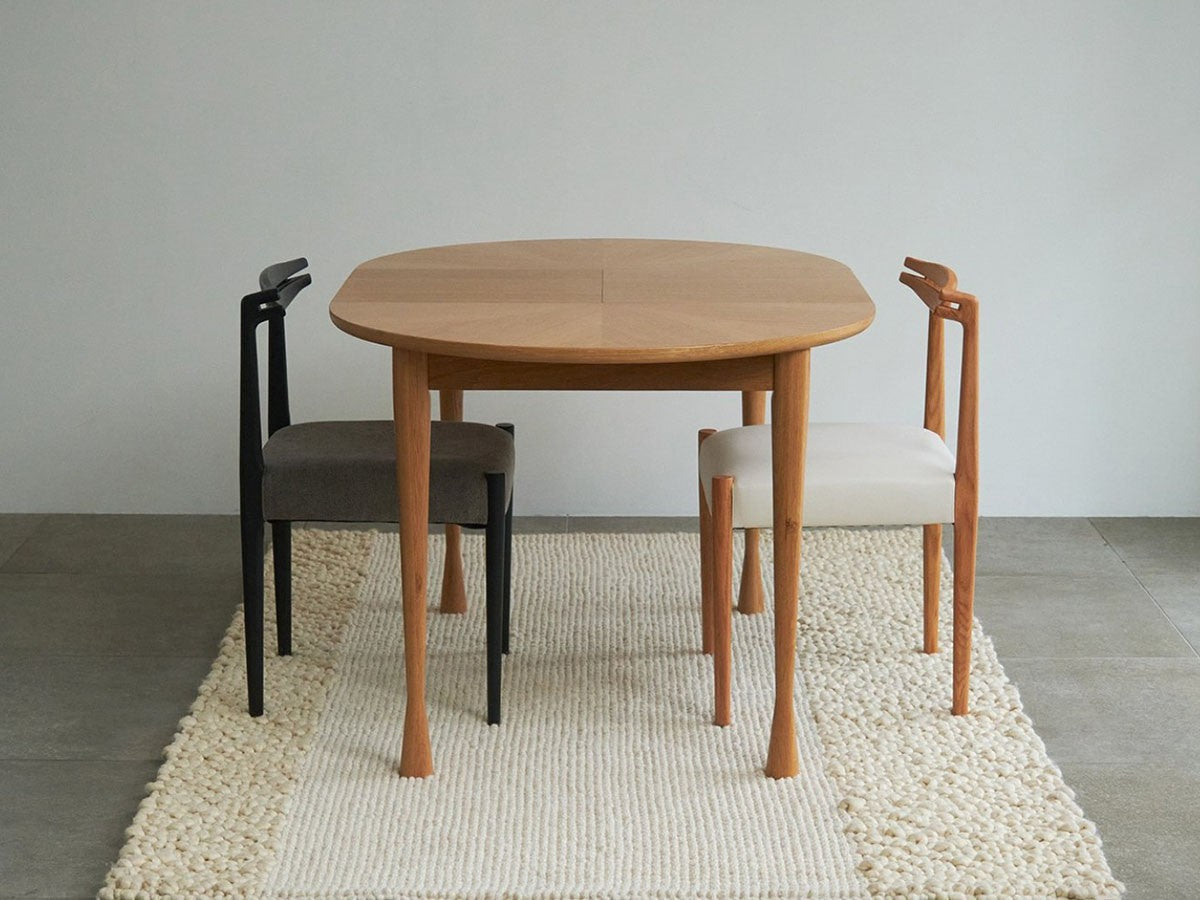 後ろ脚から背もたれへの接合部の意匠が美しいダイニングチェア。木目がきれいなレッドオーク材、強度が高く頑丈なビーチ材の無垢材を使用しています。脚の貫をなくしてすっきりしたデザインにすることで、軽量化を実現しています。座面にはお手入れのしやすいPVC素材を採用。オプションでグレー色のファブリック製カバーがあり、気分や季節に応じて付け替えてお楽しみいただけます。