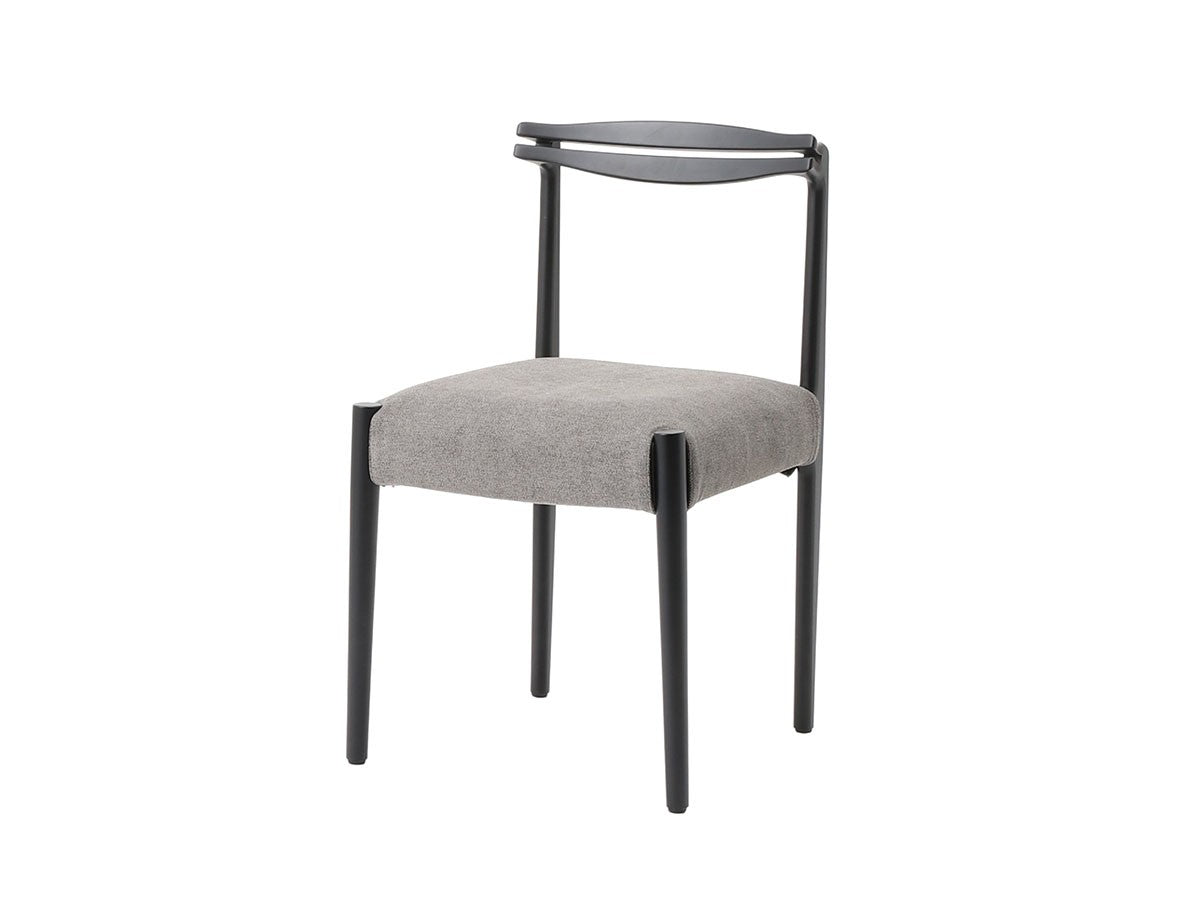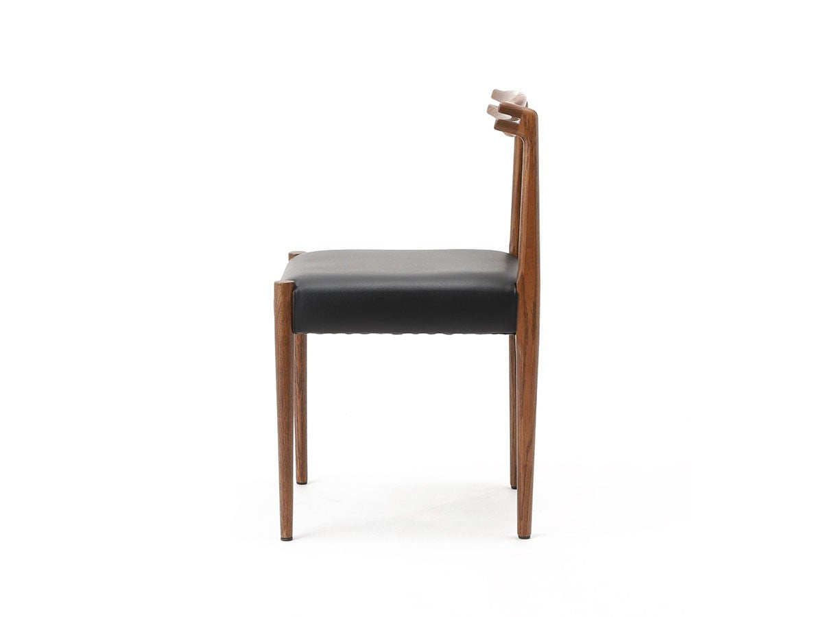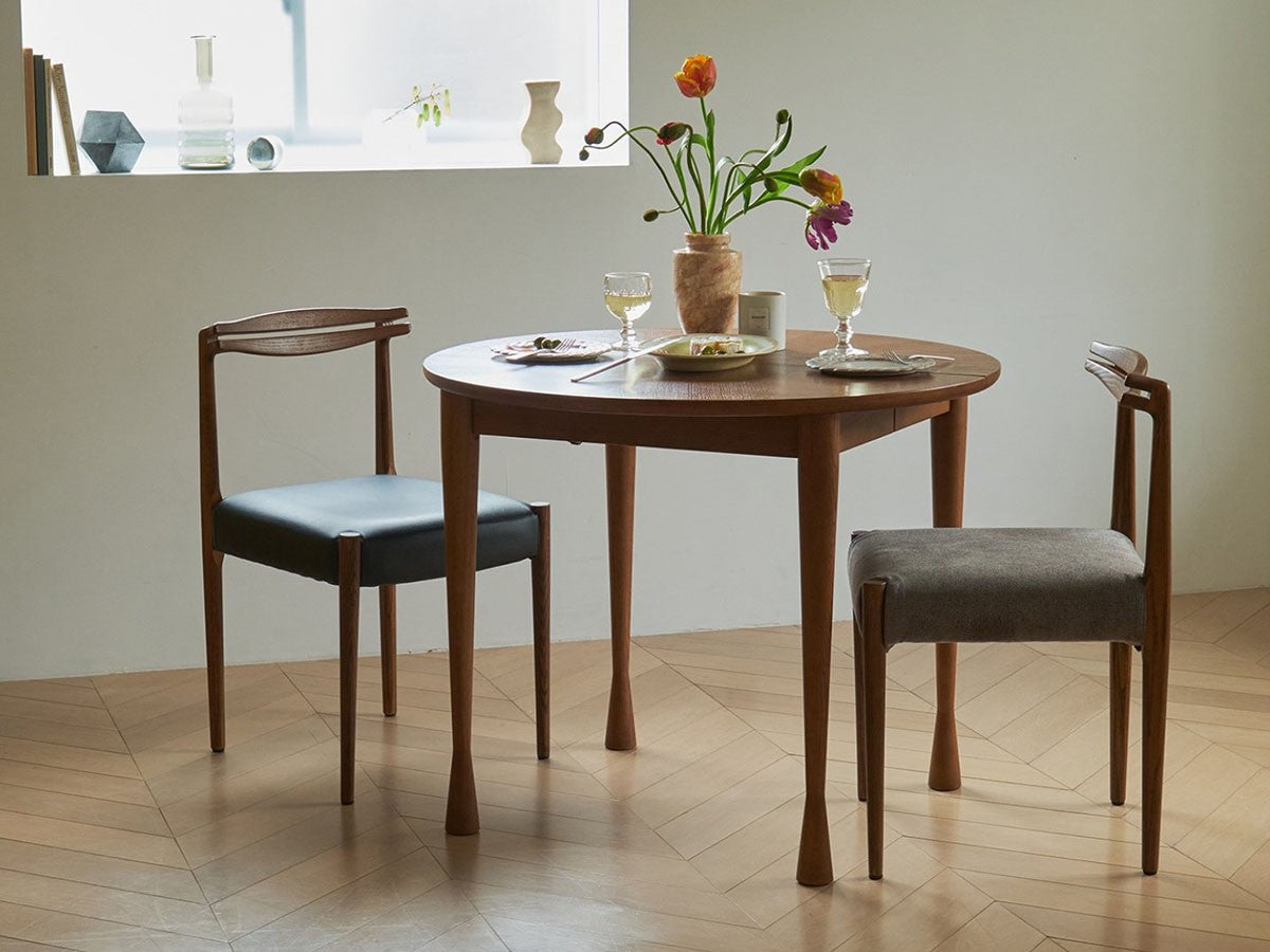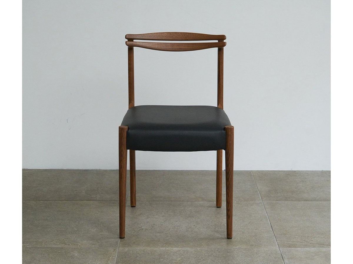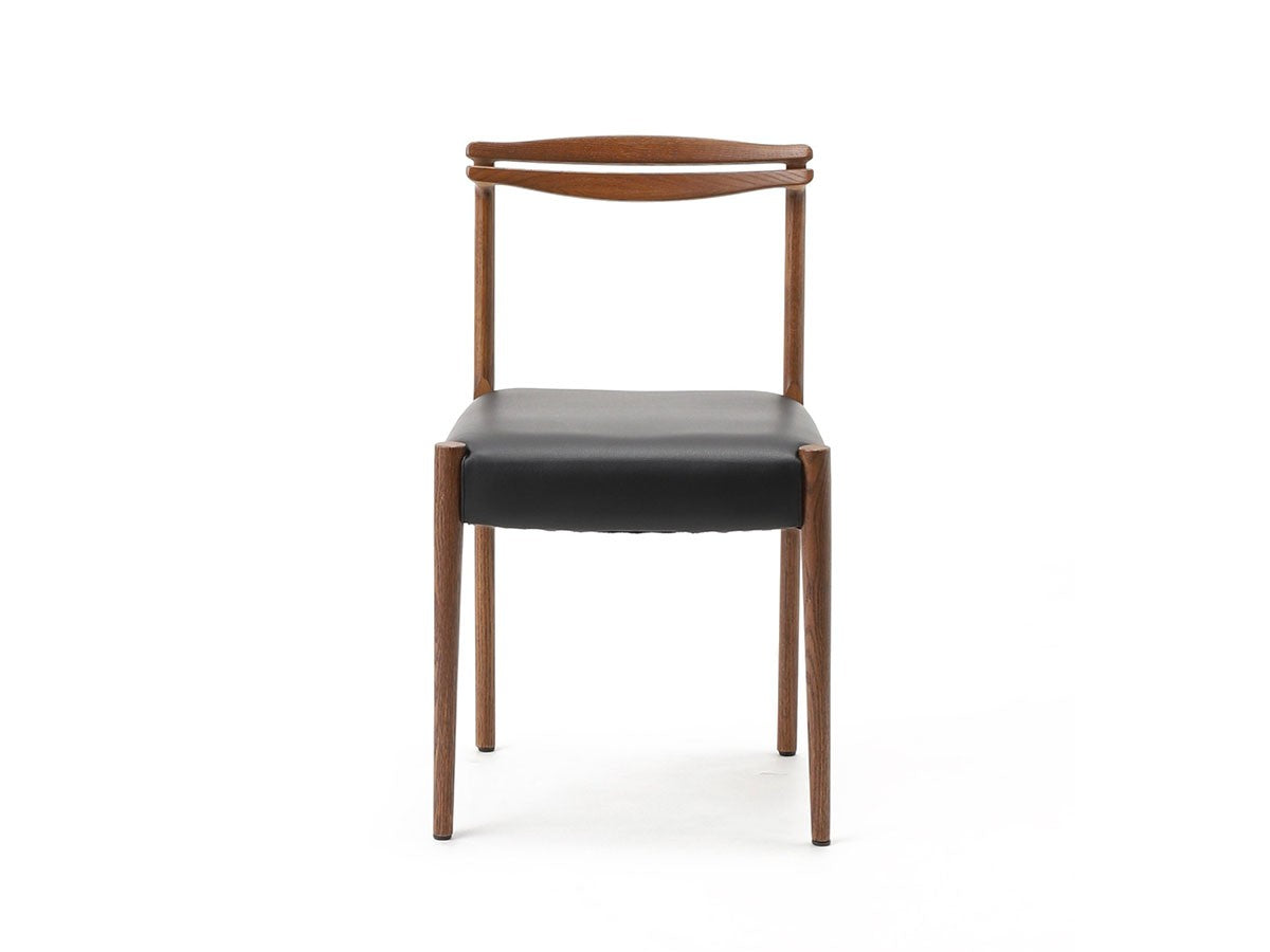 後ろ脚から背もたれへの接合部の意匠が美しいダイニングチェア。木目がきれいなレッドオーク材、強度が高く頑丈なビーチ材の無垢材を使用しています。脚の貫をなくしてすっきりしたデザインにすることで、軽量化を実現しています。座面にはお手入れのしやすいPVC素材を採用。オプションでグレー色のファブリック製カバーがあり、気分や季節に応じて付け替えてお楽しみいただけます。