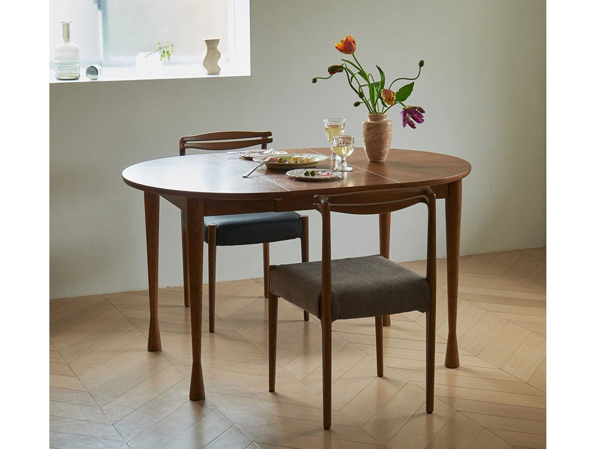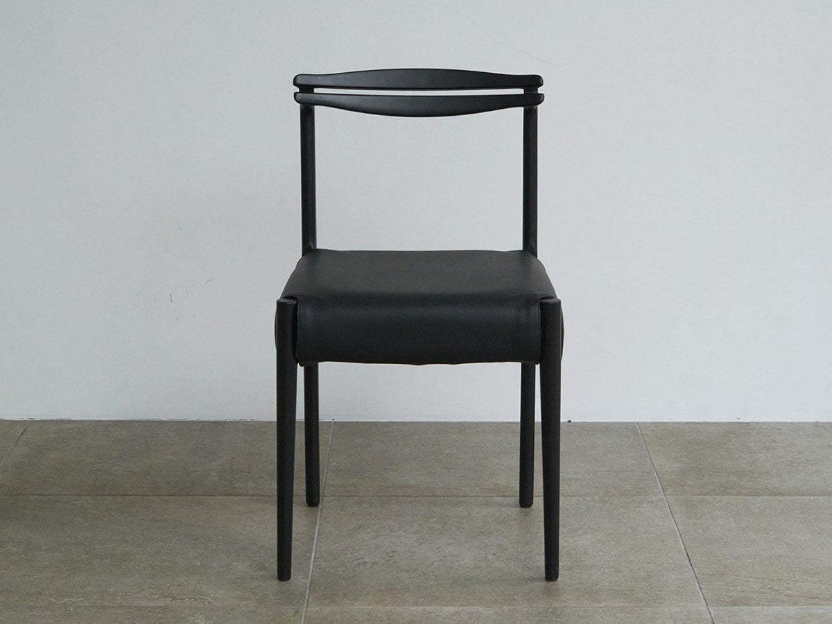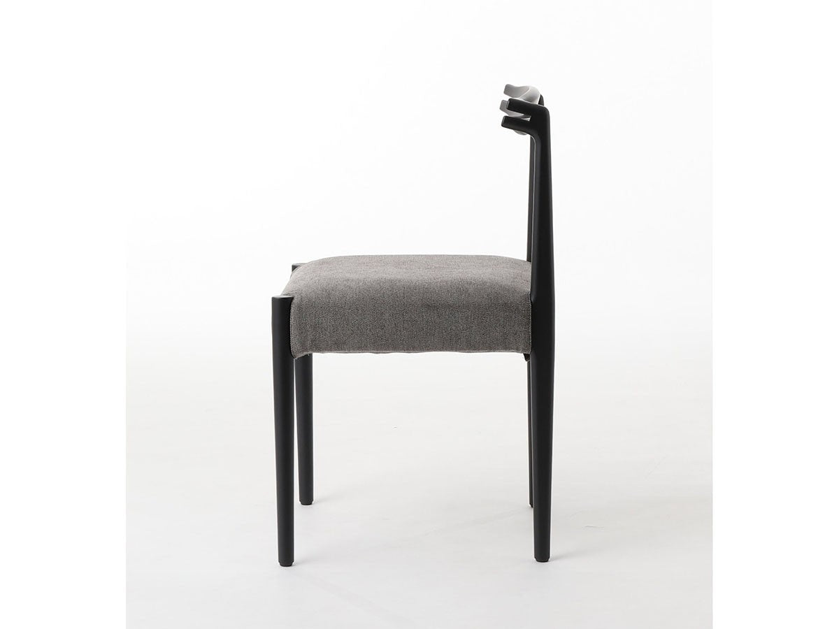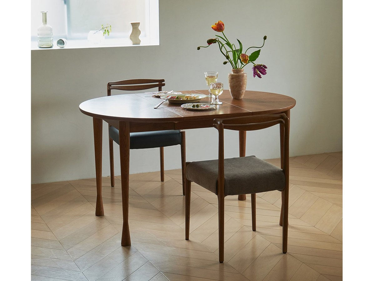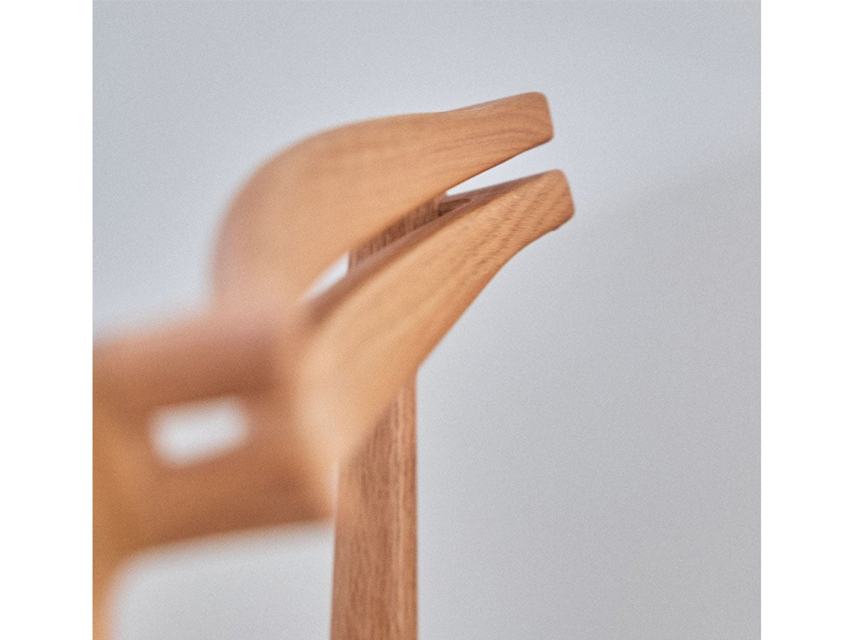 後ろ脚から背もたれへの接合部の意匠が美しいダイニングチェア。木目がきれいなレッドオーク材、強度が高く頑丈なビーチ材の無垢材を使用しています。脚の貫をなくしてすっきりしたデザインにすることで、軽量化を実現しています。座面にはお手入れのしやすいPVC素材を採用。オプションでグレー色のファブリック製カバーがあり、気分や季節に応じて付け替えてお楽しみいただけます。