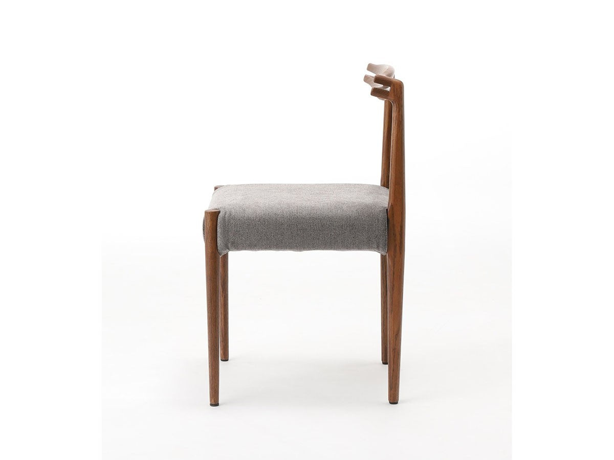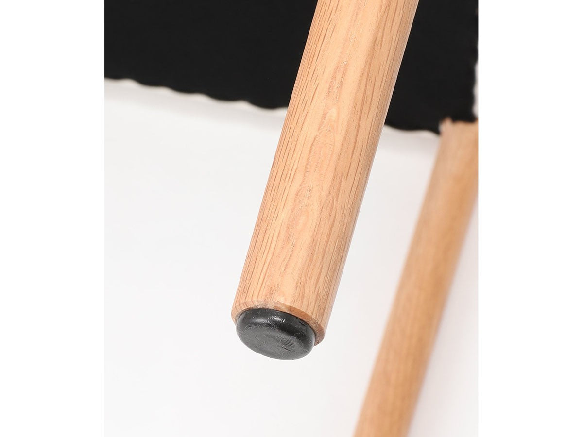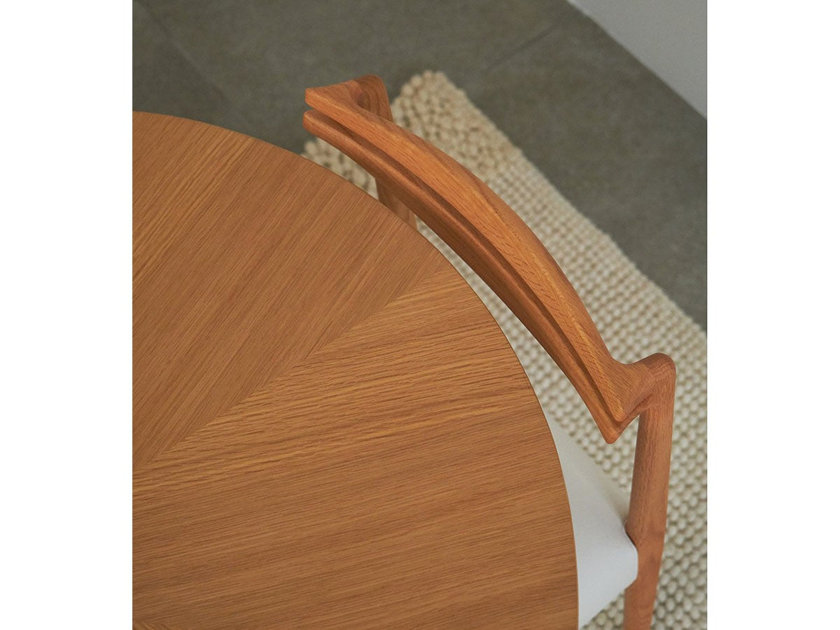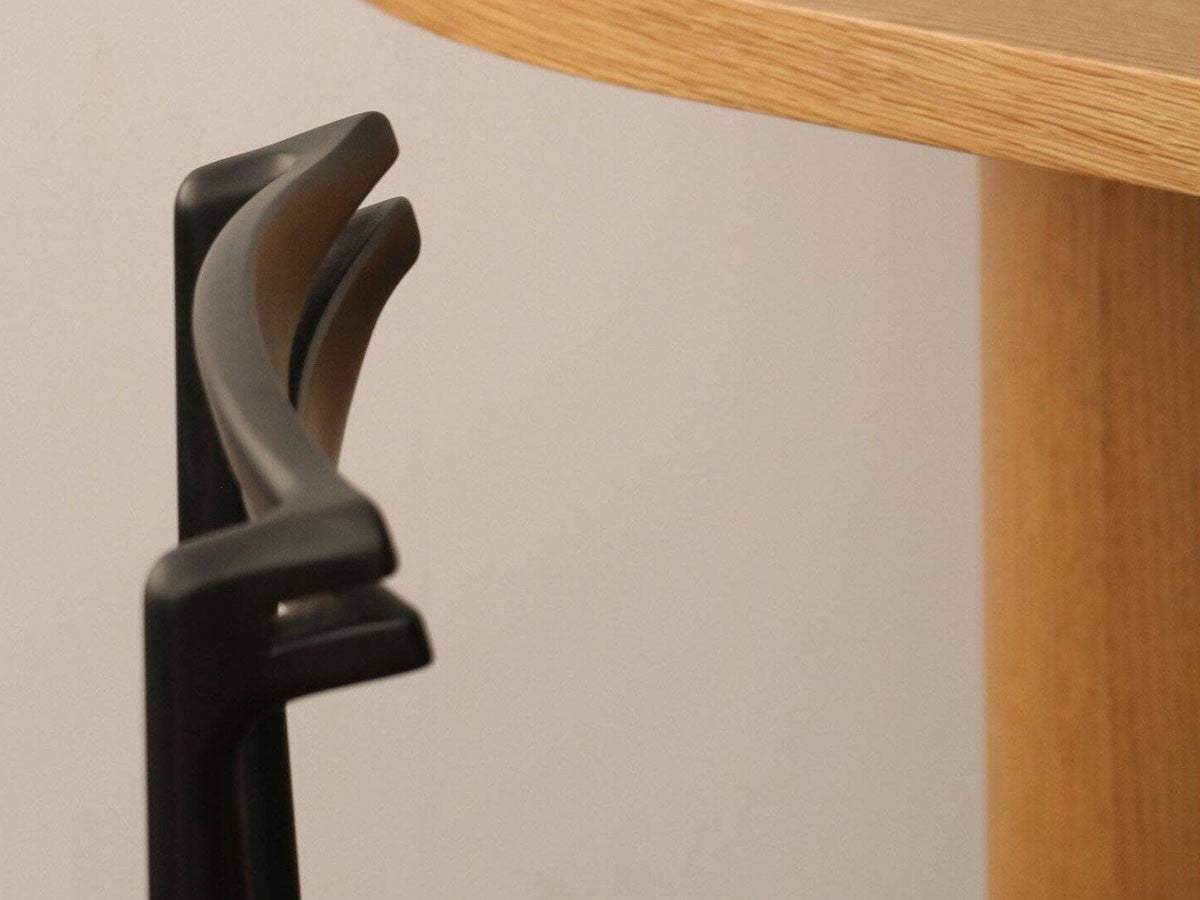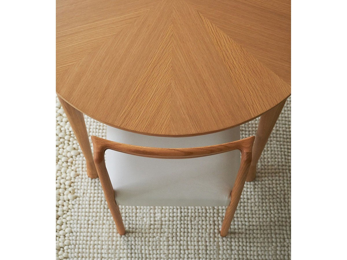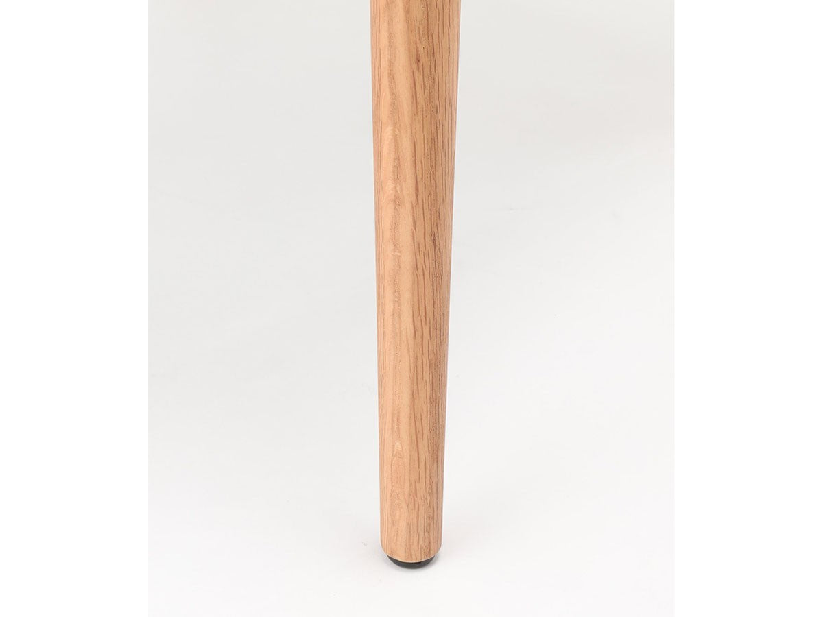 後ろ脚から背もたれへの接合部の意匠が美しいダイニングチェア。木目がきれいなレッドオーク材、強度が高く頑丈なビーチ材の無垢材を使用しています。脚の貫をなくしてすっきりしたデザインにすることで、軽量化を実現しています。座面にはお手入れのしやすいPVC素材を採用。オプションでグレー色のファブリック製カバーがあり、気分や季節に応じて付け替えてお楽しみいただけます。