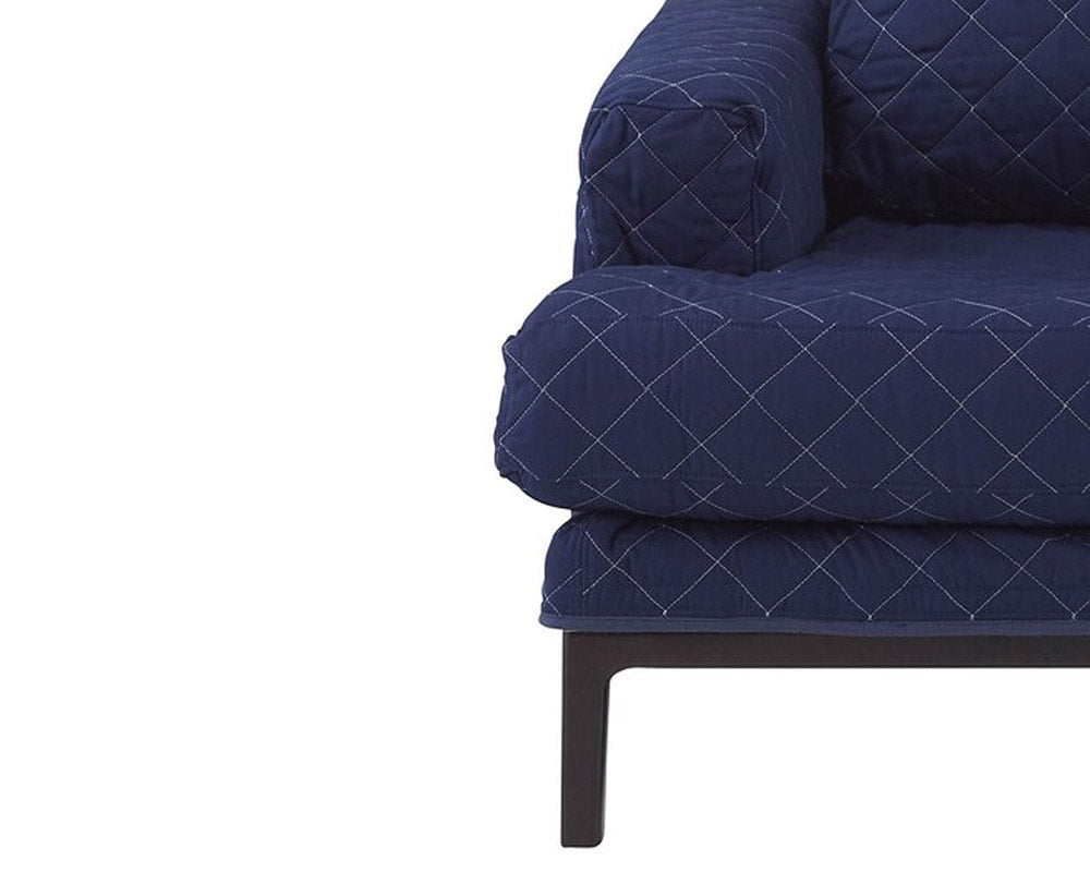 カバーリングを変えることで表情が一変するjournal standard Furniture のカバーリングソファ「JFK SOFA(ジェーエフケー ソファ)」。「UTILITY canvas(ユーティリティキャンバス)」の定番ファブリックであるキルトブランケットをカバーに仕立てたコラボレーションソファです。「UTILITY canvas」は、1990年にニューヨークで Classic Field Bag を製作して以来、キャンバスのありとあらゆる可能性を探究しているキャンバス一筋の老舗ブランド。今回のカバーは商品化までに2年の歳月を要し、このネイビーはオリジナルカラー仕上げで、「UTILITY canvas」のキルトブランケットをソファカバーに用いたのは世界初になります。その「JFK SOFA 」は、journal standard Furnitureが新しいスタンダードな形としてデザインしたソファです。ゆったりめの2シータサイズは、3人まで座れる座面の広さと、あぐらがかけるほどの奥行きの広さを持っていて、リラックスして座ることができます。こだわりのシートクッションには厚みと堅さの異なるウレタンを6層構造に重ね、クッション下には耐久性の高いSバネを仕込み、絶妙な座り心地に仕上がっています。その座り心地は、ゆっくりと一定まで沈み込み、そこで体をやさしくホールドしてくれるような感じで、また、決して柔らかすぎないので長時間座っていても疲れないシートです。背もたれ部分のクッションにはたっぷりの羽毛を使用し、ウレタンキューブを混合することでへたりにくくしています。脚部には木目の美しいタモ材を使用。カバーリングタイプのソファのため、日々のお手入れや、汚れてしまった場合のクリーニングのメンテにも優れます。