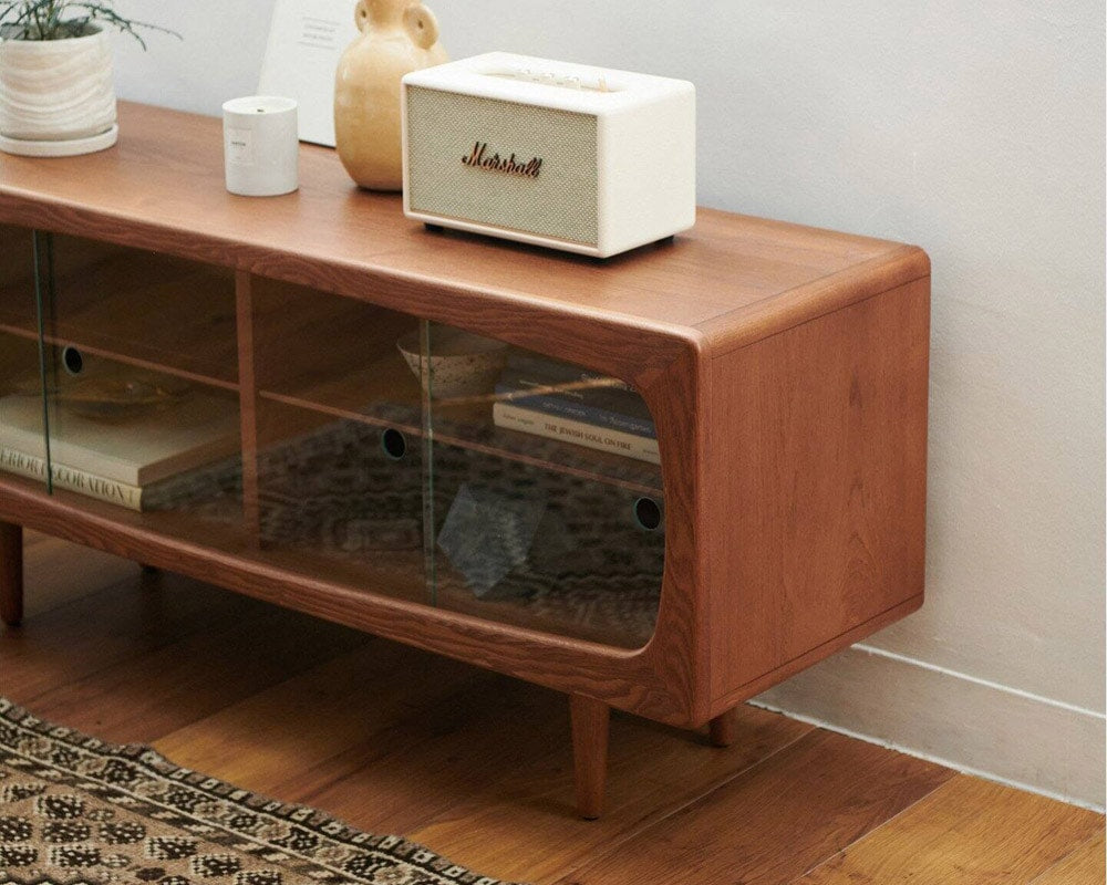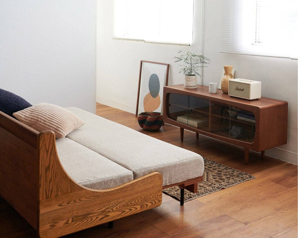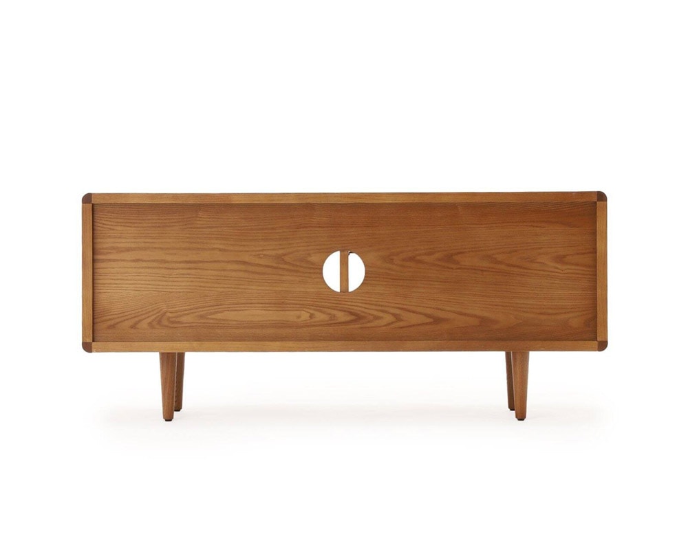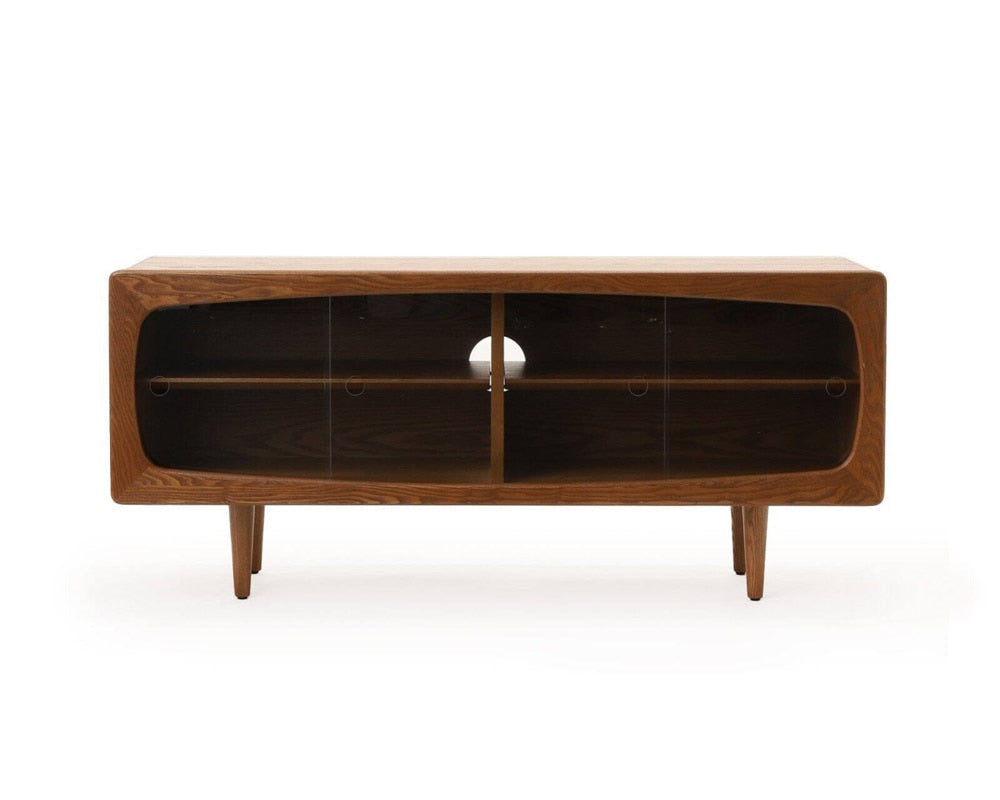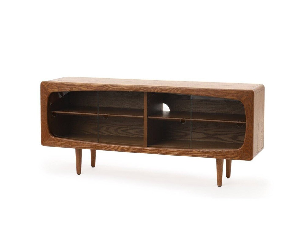 正面のガラス部分のデザインが柔らかく特徴的な、journal standard Furniture(ジャーナルスタンダードファニチャー)のテレビボード「AROS TV BOARD /アロス テレビボード」です。北欧デンマークのヴィンテージキャビネットをモチーフにしたTVボードで、前面の縁周りには大胆な無垢材を使用しています。引き戸はスッキリと軽やかな印象になるように、ガラスを使用しているため、リモコン操作もストレスを感じません。中の棚板も丸みを持たせ、薄い板で圧迫感を削ぎ落しています。名称の「Aros(アロス)」はデンマークのオーフスにある美術館で、古き良き北欧に想いを馳せた拘りが詰まったデザインです。