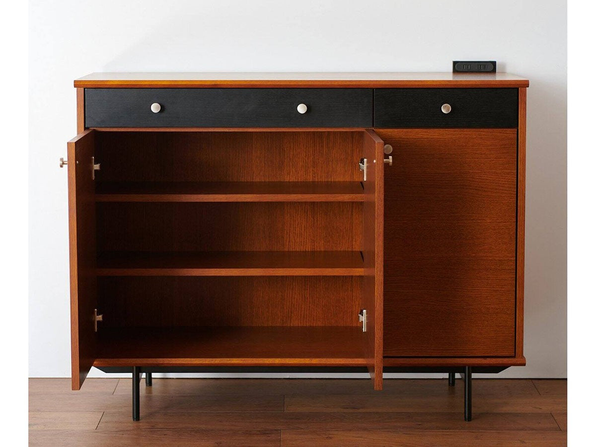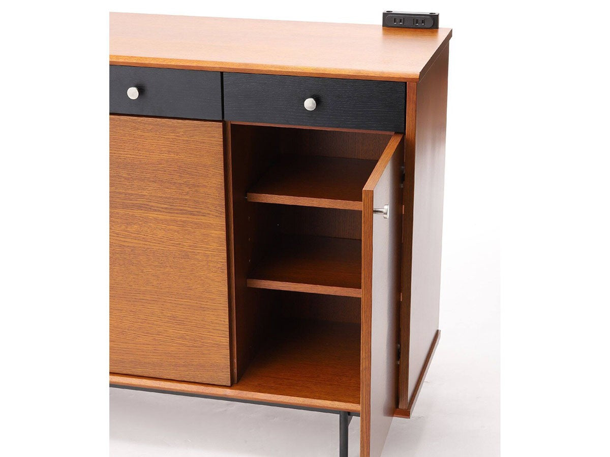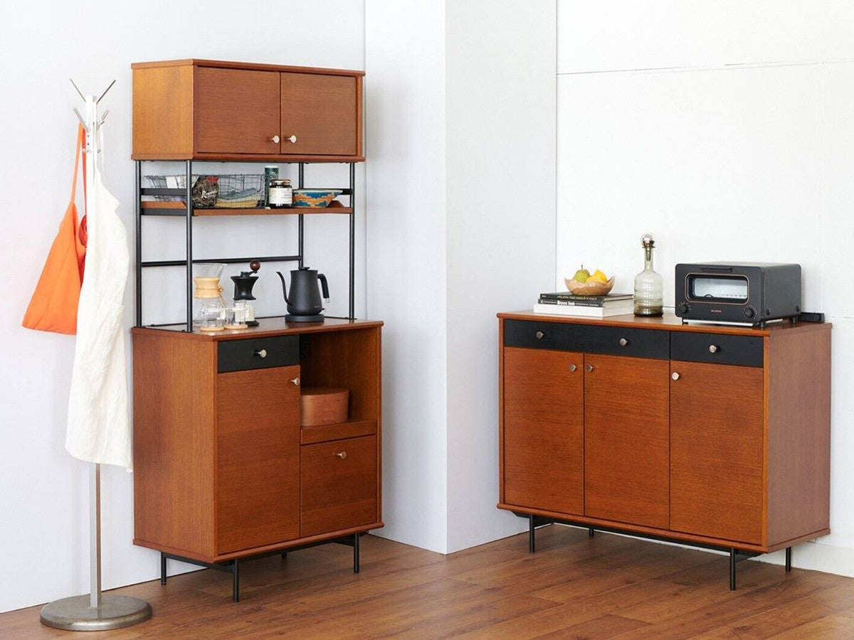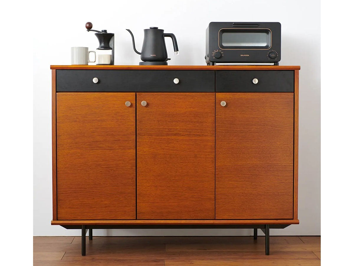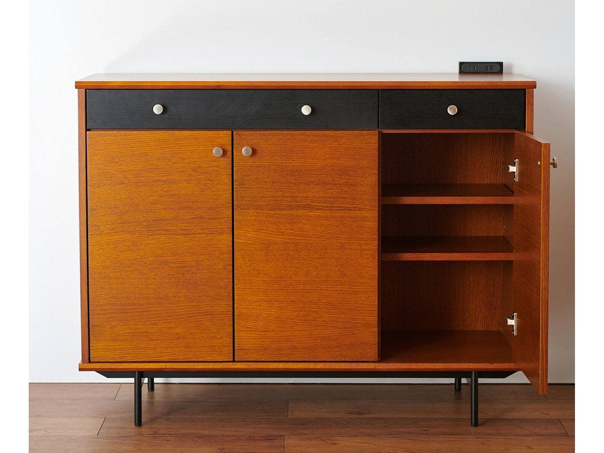収納力に優れ、作業台として使用できるキッチンカウンター。天板には調理家電の使用に便利なコンセントが付いています。浅型の引出しとたっぷりとした開き戸に、食器やストック食品などを整理しながら収納できます。引出しの前板を黒く塗装することで、北欧ヴィンテージの雰囲気にモダンな印象を添えています。ナチュラルテイストのインテリアにも差し色として取り入れやすいデザインです。サイズや形状が異なるモデルがあり、組み合わせてお使いいただくことで、収納量や用途の幅が広がります。天板のコンセントは取り外しが可能なため、リビングルームではチェストとしてご活用いただけます。脚部は一般的なロボット掃除機が使用できる高さになっています。