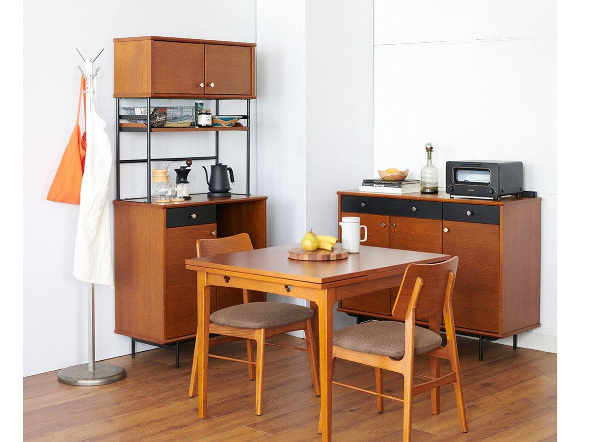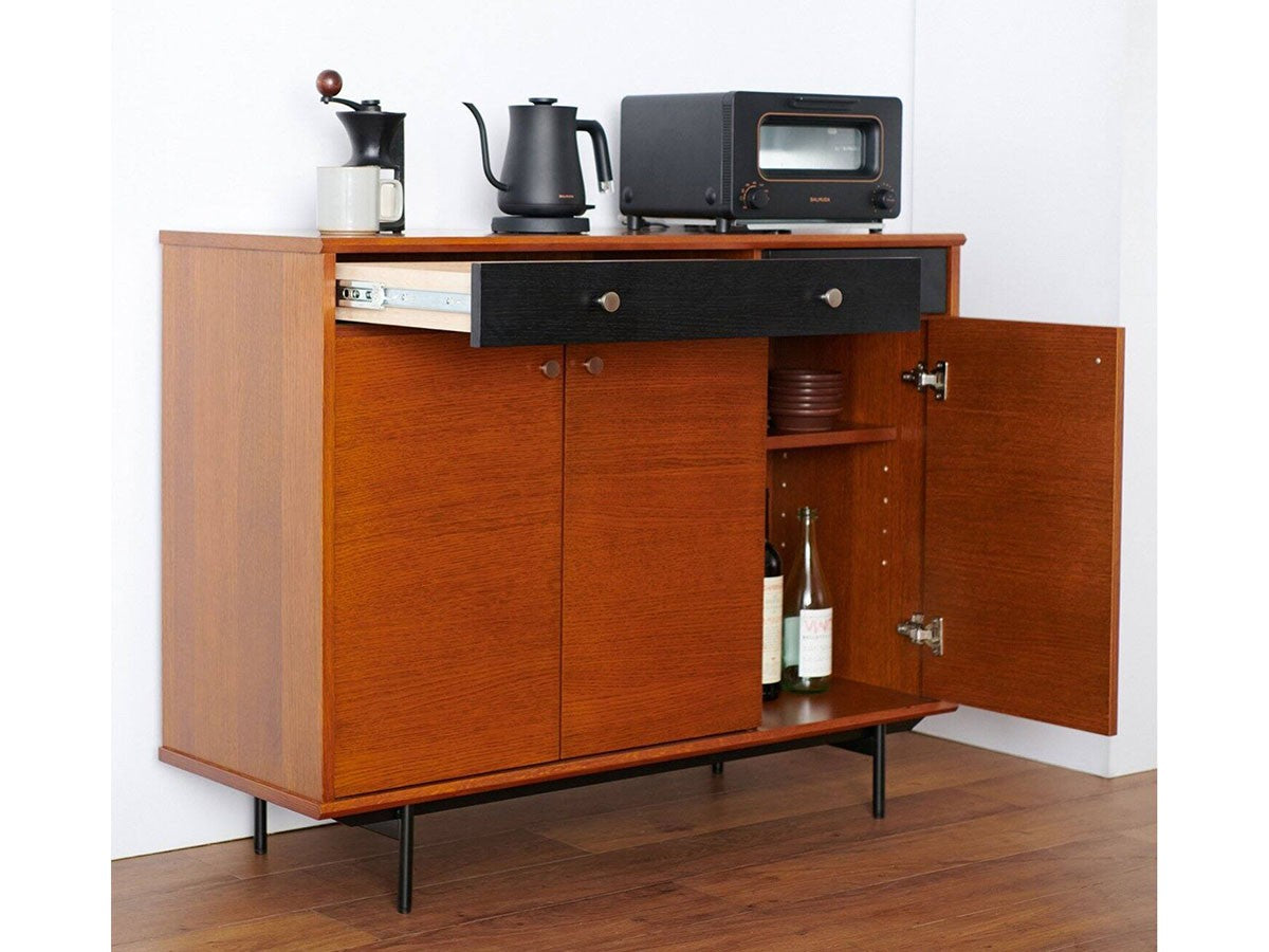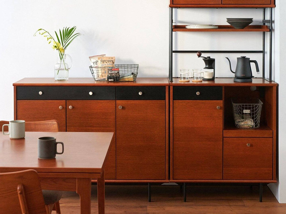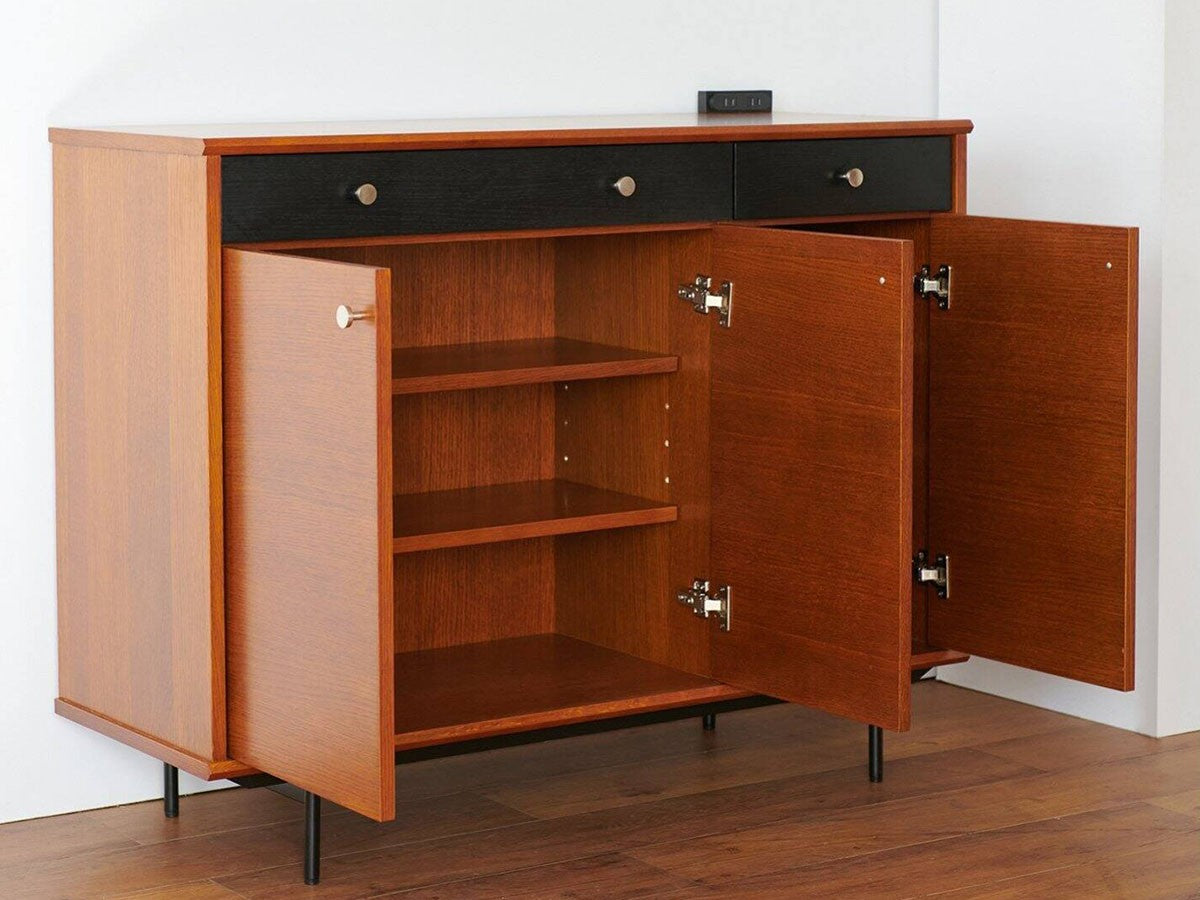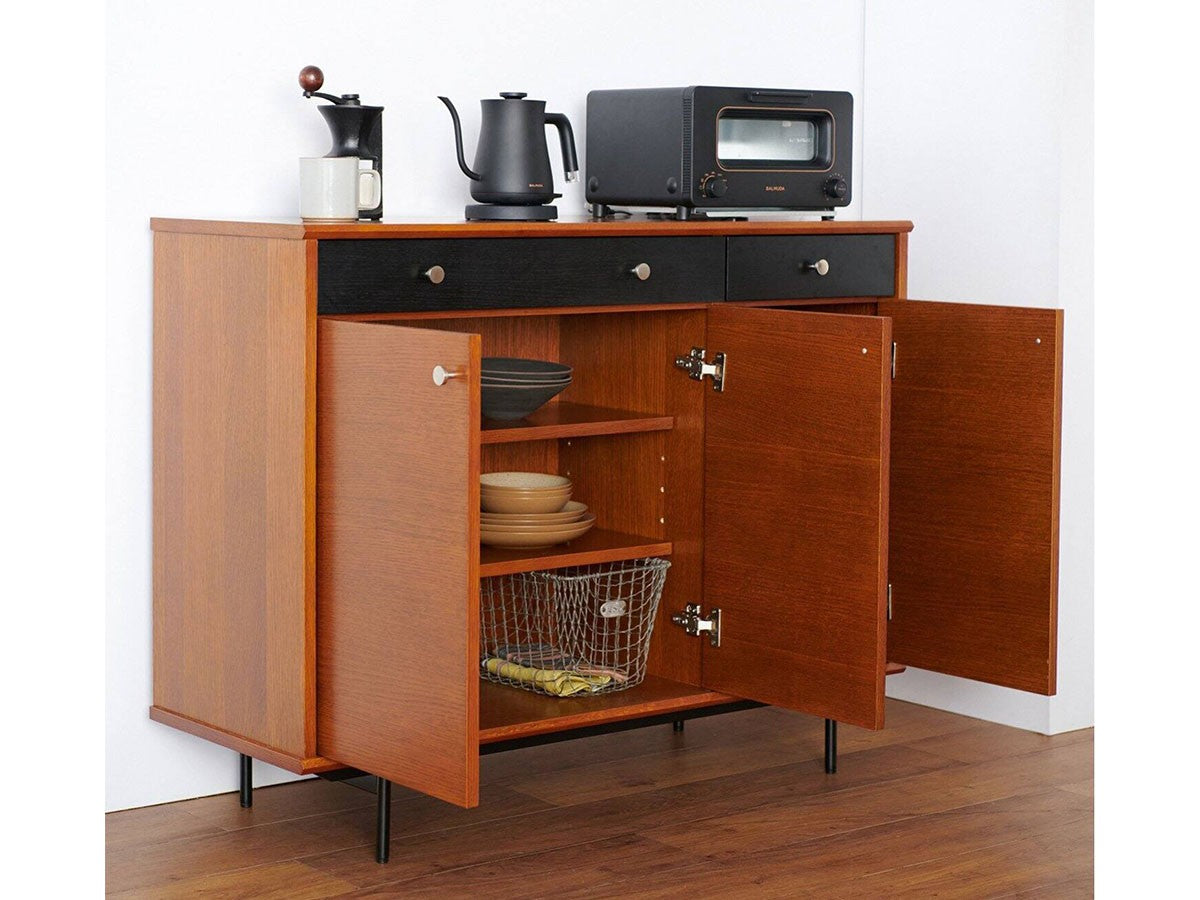 収納力に優れ、作業台として使用できるキッチンカウンター。天板には調理家電の使用に便利なコンセントが付いています。浅型の引出しとたっぷりとした開き戸に、食器やストック食品などを整理しながら収納できます。引出しの前板を黒く塗装することで、北欧ヴィンテージの雰囲気にモダンな印象を添えています。ナチュラルテイストのインテリアにも差し色として取り入れやすいデザインです。サイズや形状が異なるモデルがあり、組み合わせてお使いいただくことで、収納量や用途の幅が広がります。天板のコンセントは取り外しが可能なため、リビングルームではチェストとしてご活用いただけます。脚部は一般的なロボット掃除機が使用できる高さになっています。