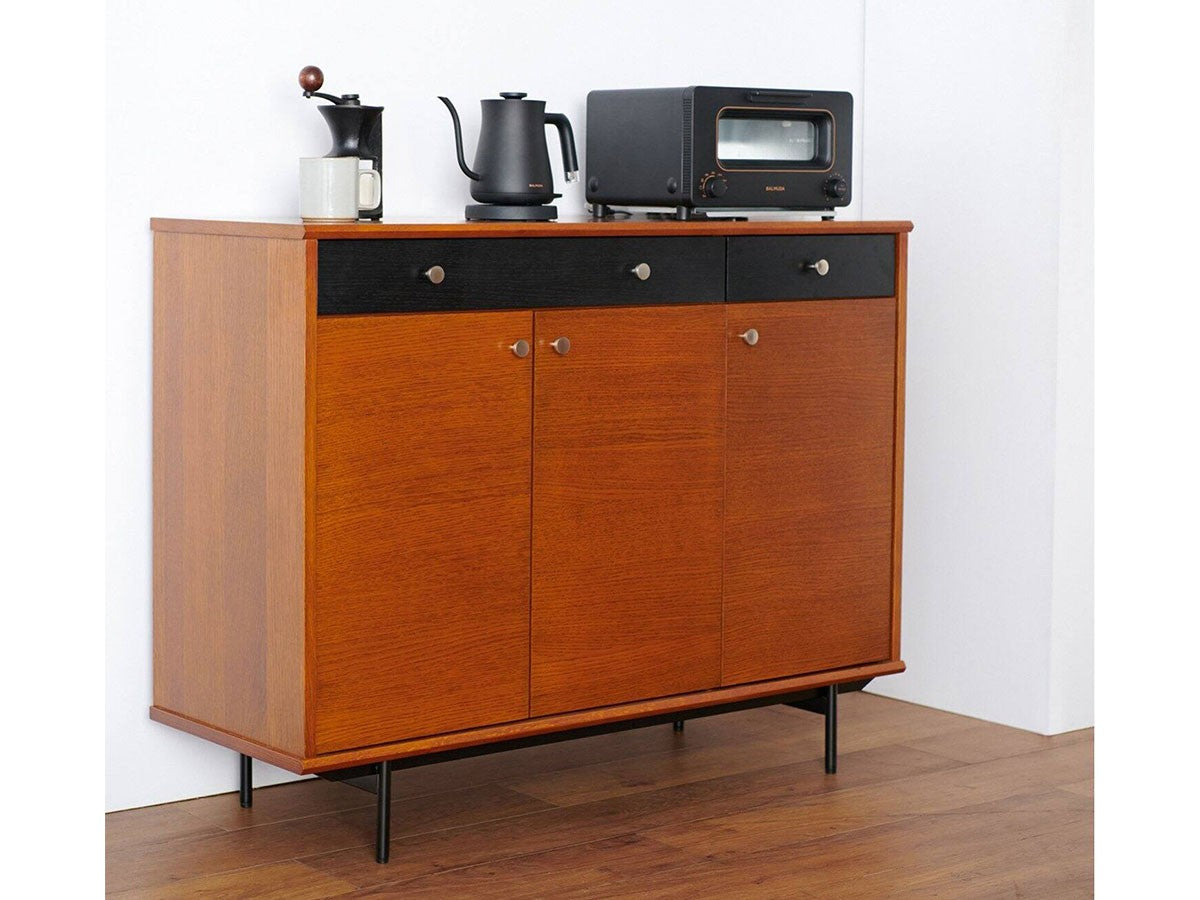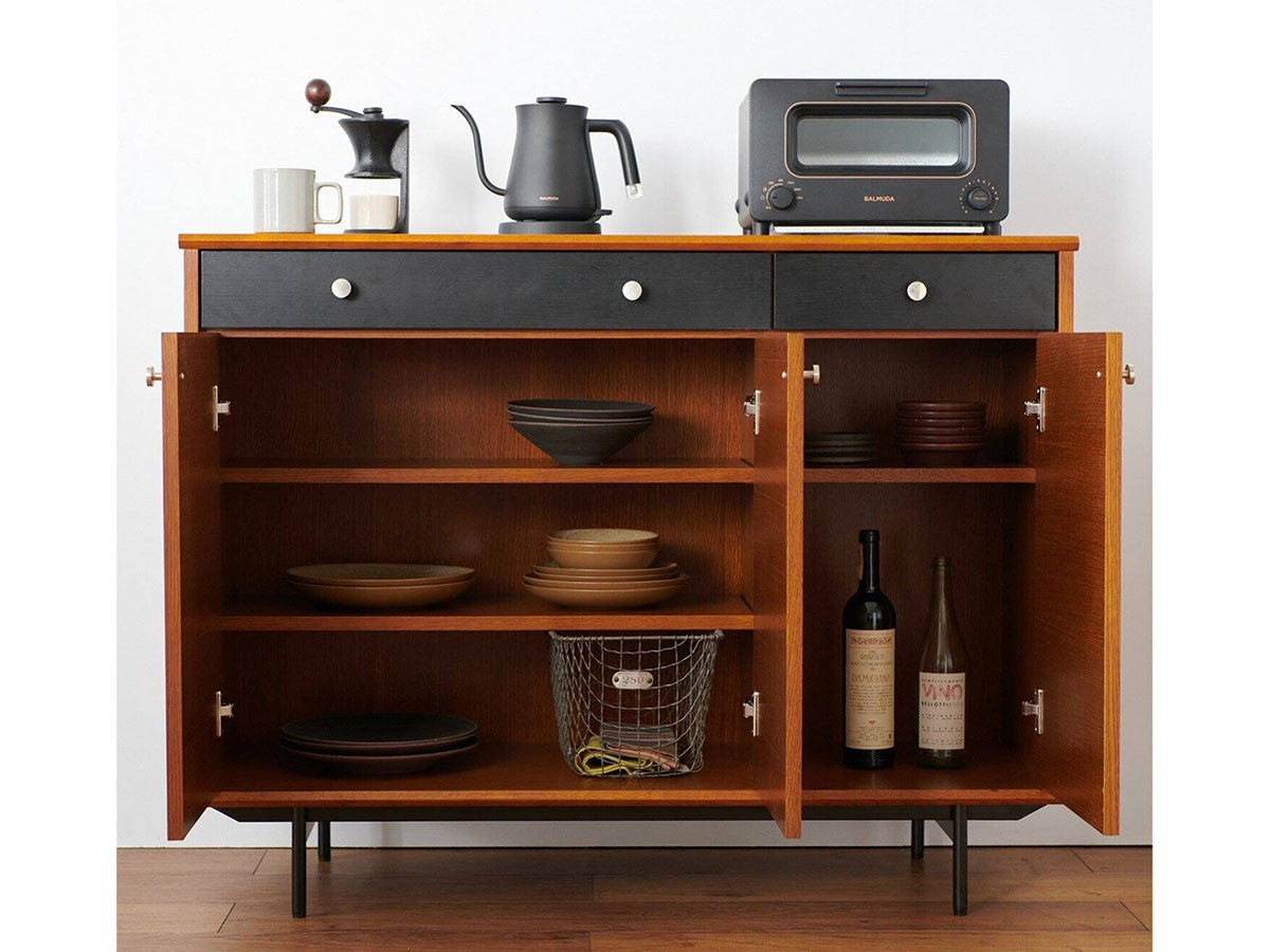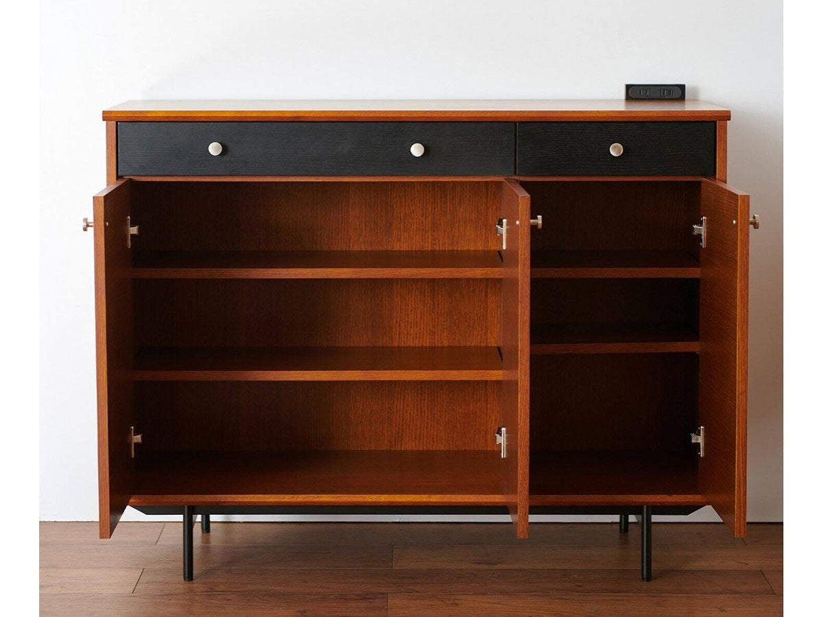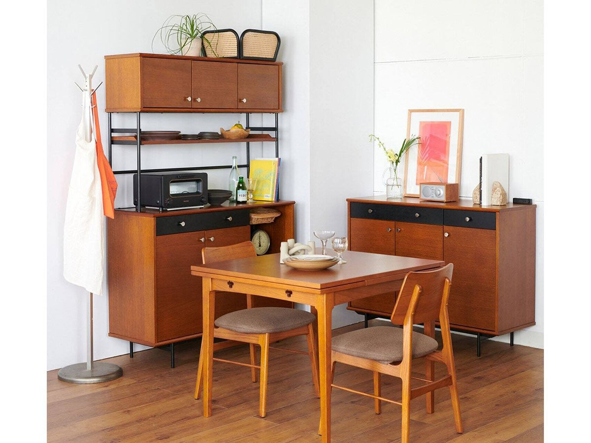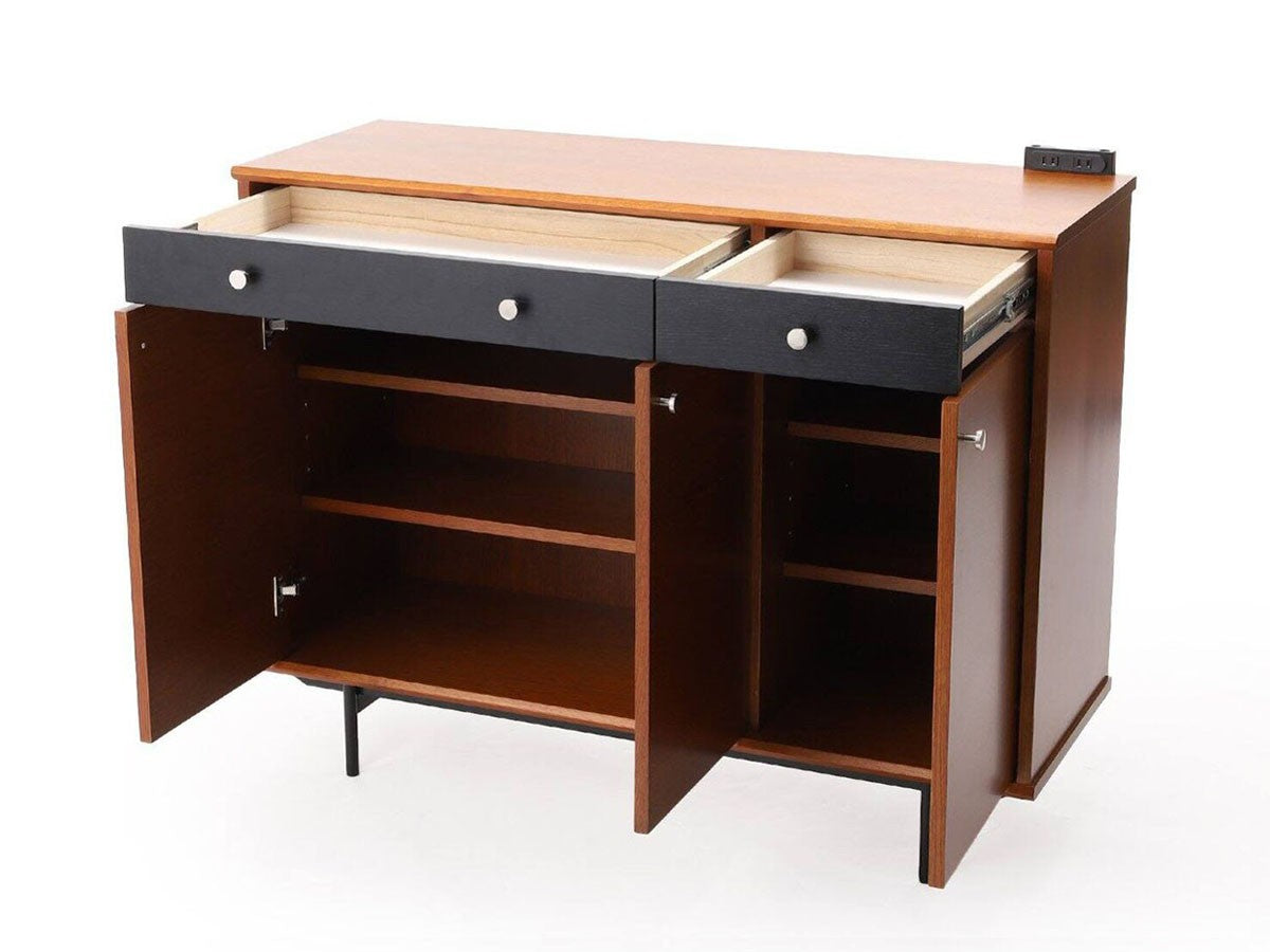 収納力に優れ、作業台として使用できるキッチンカウンター。天板には調理家電の使用に便利なコンセントが付いています。浅型の引出しとたっぷりとした開き戸に、食器やストック食品などを整理しながら収納できます。引出しの前板を黒く塗装することで、北欧ヴィンテージの雰囲気にモダンな印象を添えています。ナチュラルテイストのインテリアにも差し色として取り入れやすいデザインです。サイズや形状が異なるモデルがあり、組み合わせてお使いいただくことで、収納量や用途の幅が広がります。天板のコンセントは取り外しが可能なため、リビングルームではチェストとしてご活用いただけます。脚部は一般的なロボット掃除機が使用できる高さになっています。