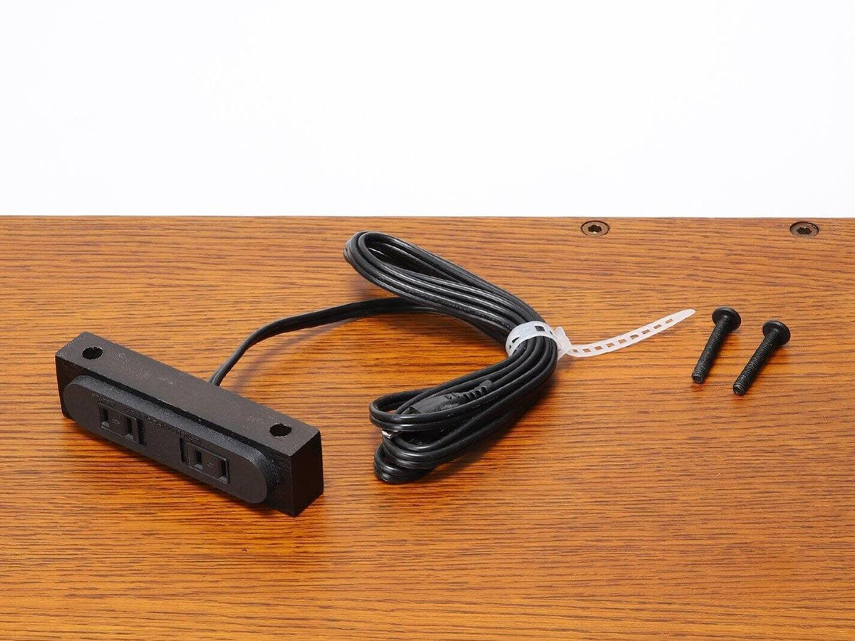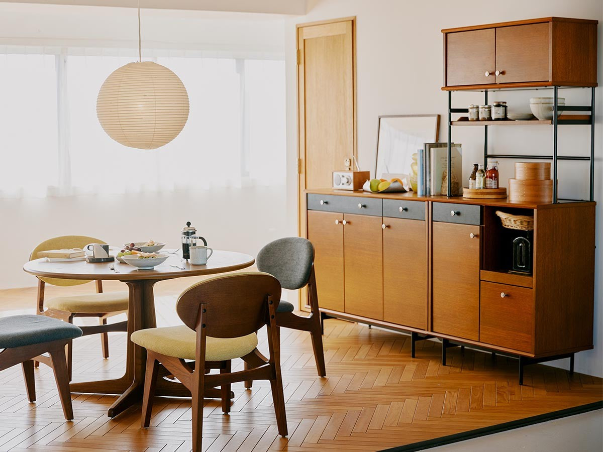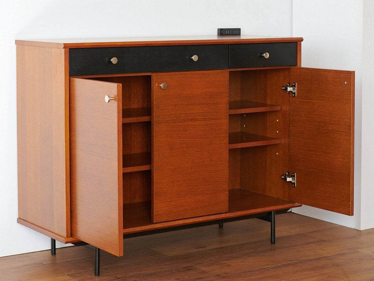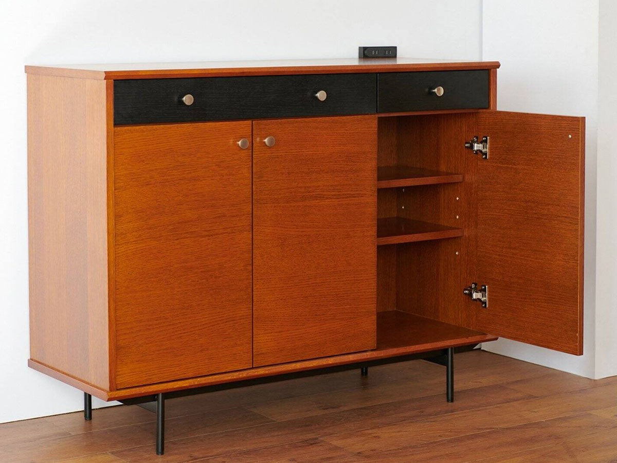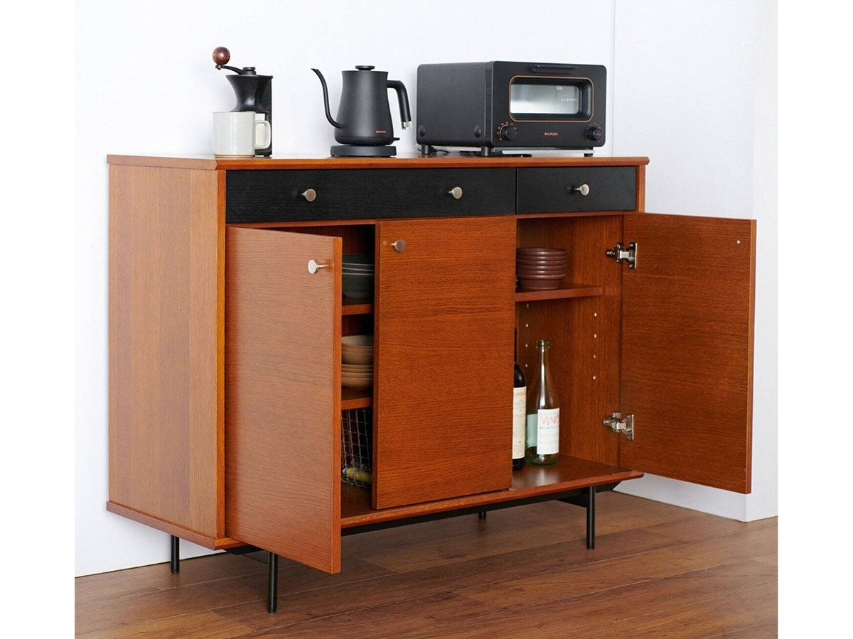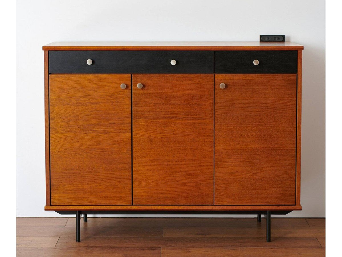 収納力に優れ、作業台として使用できるキッチンカウンター。天板には調理家電の使用に便利なコンセントが付いています。浅型の引出しとたっぷりとした開き戸に、食器やストック食品などを整理しながら収納できます。引出しの前板を黒く塗装することで、北欧ヴィンテージの雰囲気にモダンな印象を添えています。ナチュラルテイストのインテリアにも差し色として取り入れやすいデザインです。サイズや形状が異なるモデルがあり、組み合わせてお使いいただくことで、収納量や用途の幅が広がります。天板のコンセントは取り外しが可能なため、リビングルームではチェストとしてご活用いただけます。脚部は一般的なロボット掃除機が使用できる高さになっています。