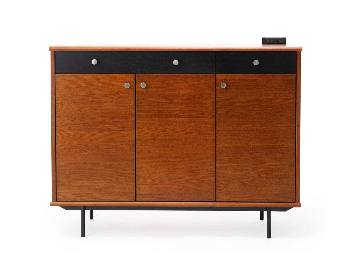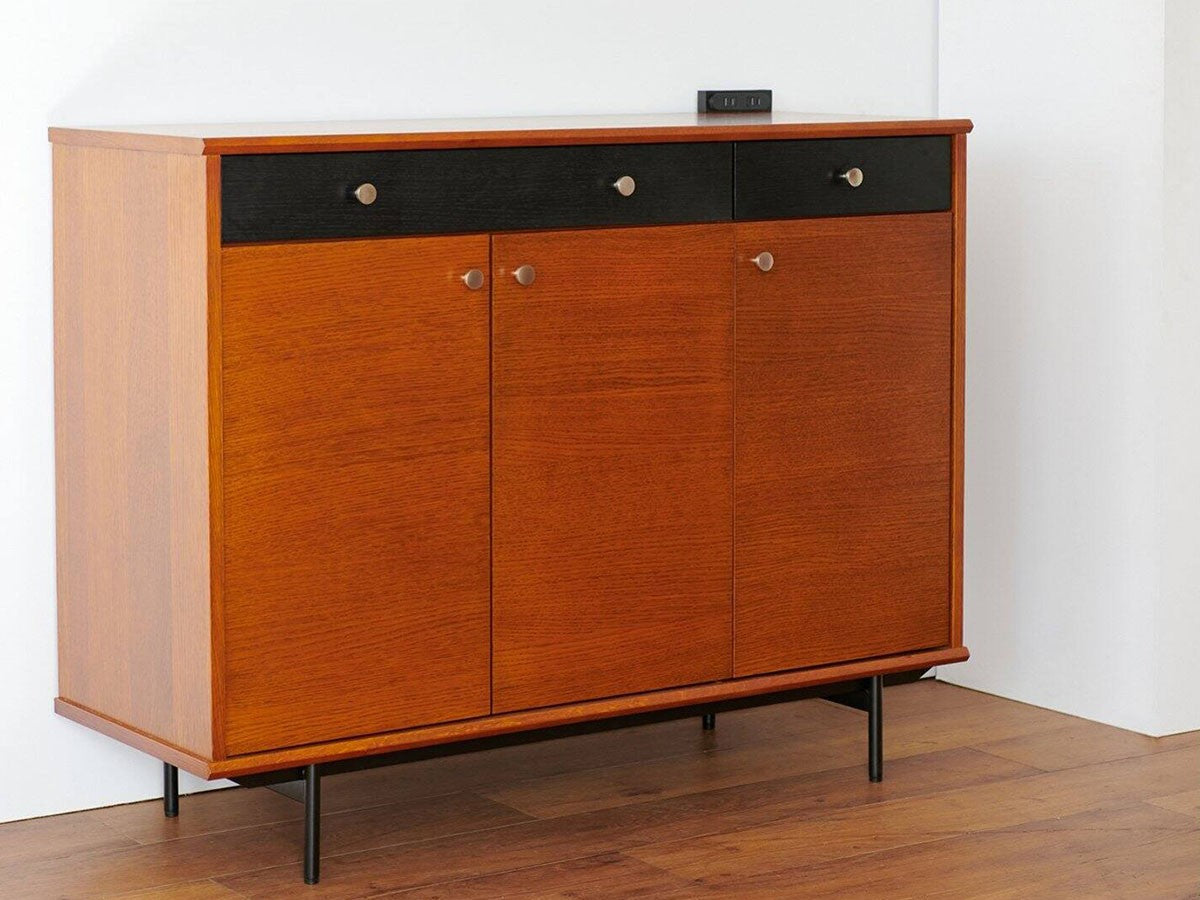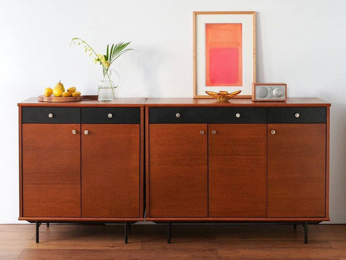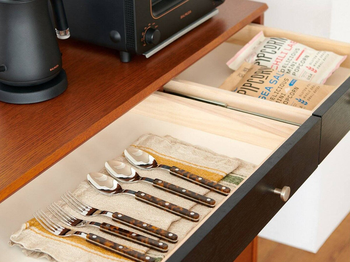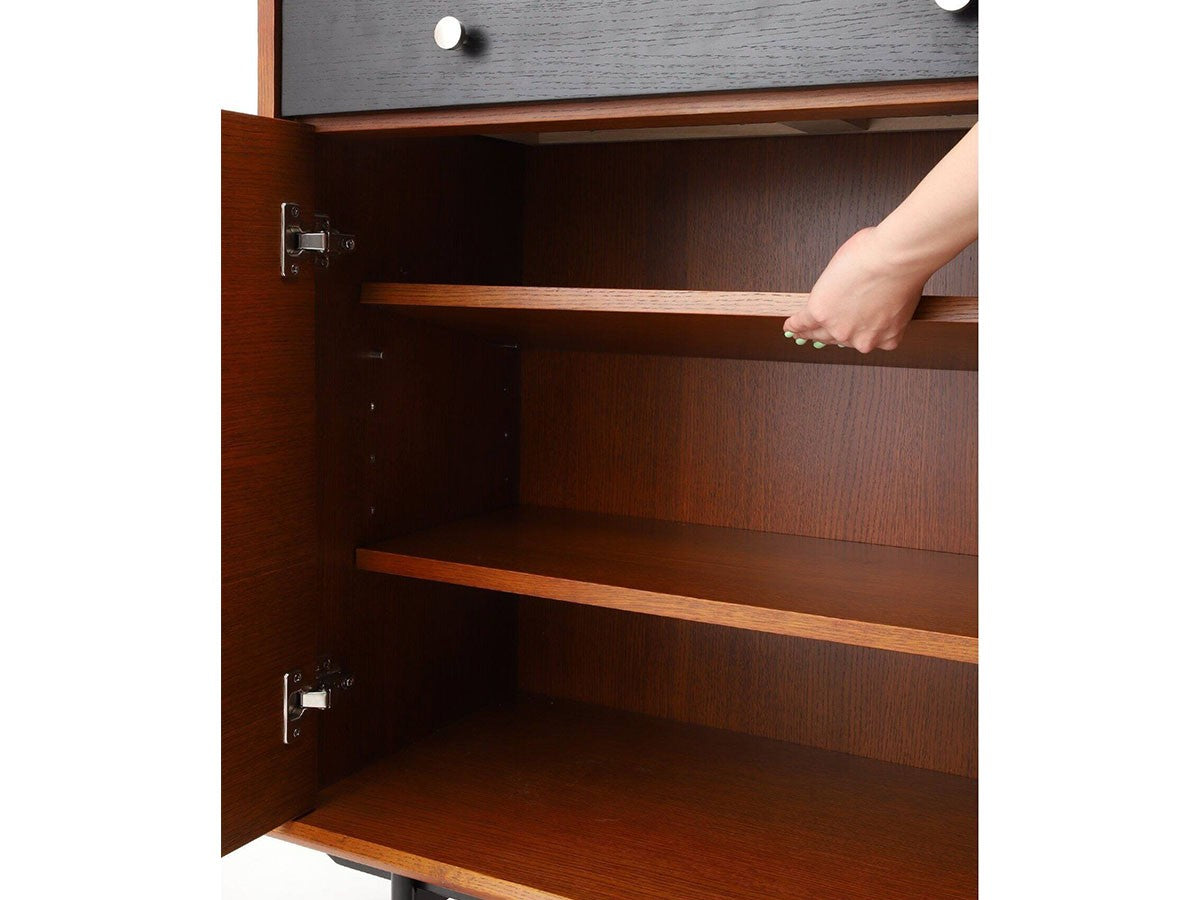 収納力に優れ、作業台として使用できるキッチンカウンター。天板には調理家電の使用に便利なコンセントが付いています。浅型の引出しとたっぷりとした開き戸に、食器やストック食品などを整理しながら収納できます。引出しの前板を黒く塗装することで、北欧ヴィンテージの雰囲気にモダンな印象を添えています。ナチュラルテイストのインテリアにも差し色として取り入れやすいデザインです。サイズや形状が異なるモデルがあり、組み合わせてお使いいただくことで、収納量や用途の幅が広がります。天板のコンセントは取り外しが可能なため、リビングルームではチェストとしてご活用いただけます。脚部は一般的なロボット掃除機が使用できる高さになっています。