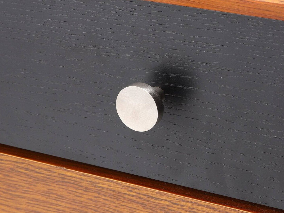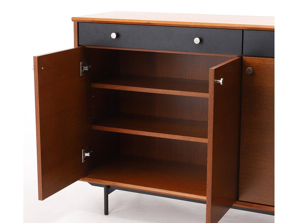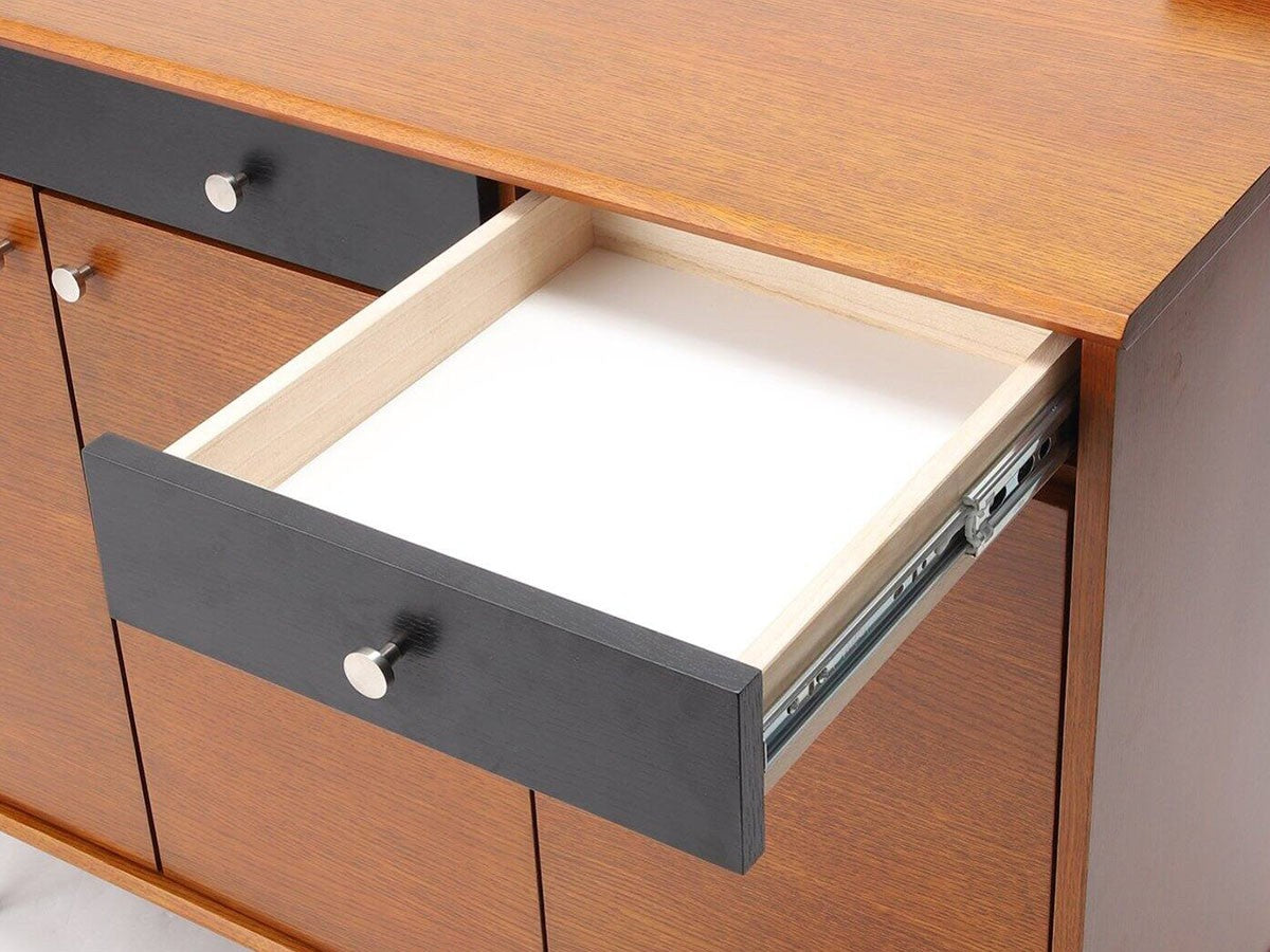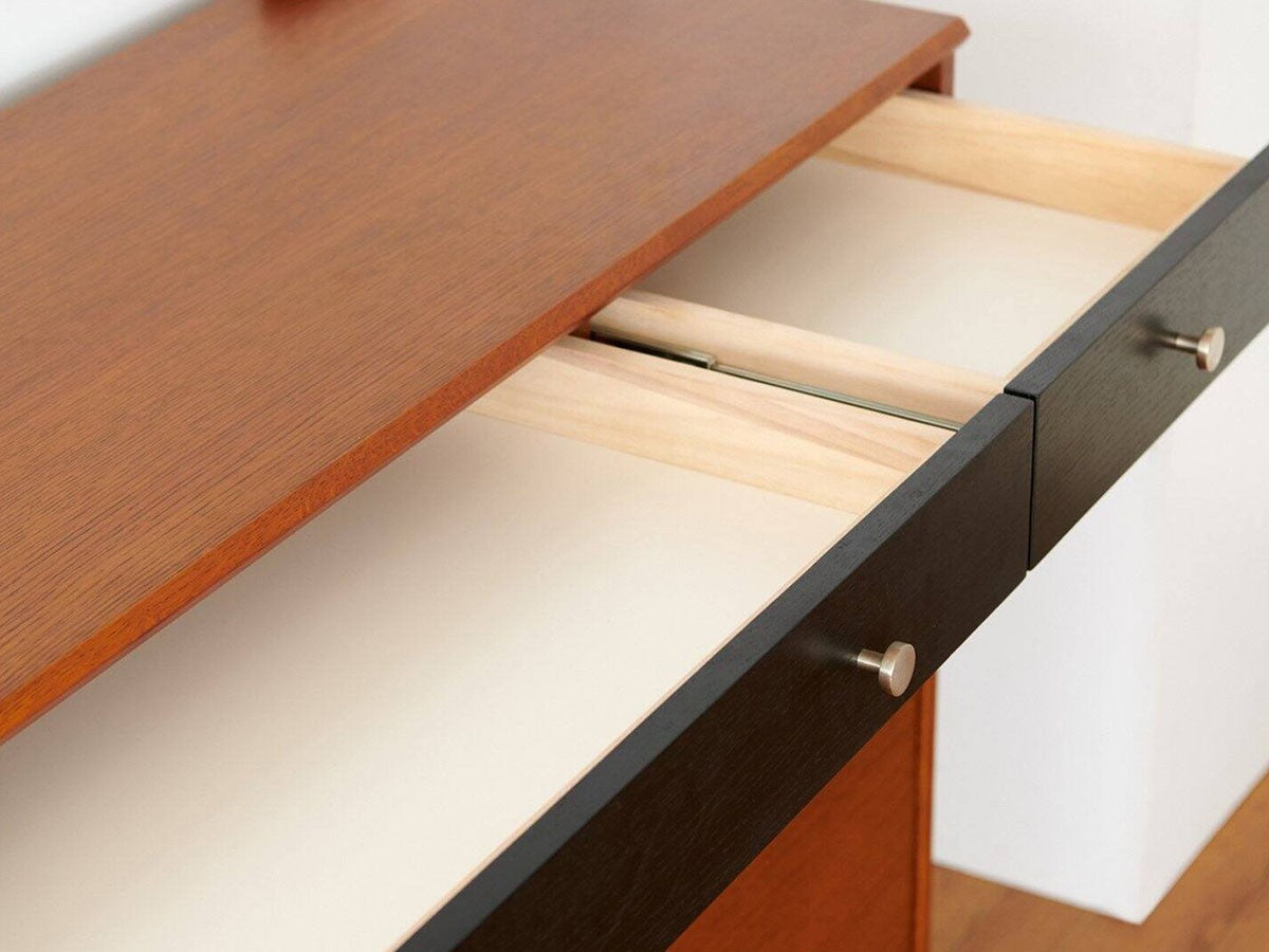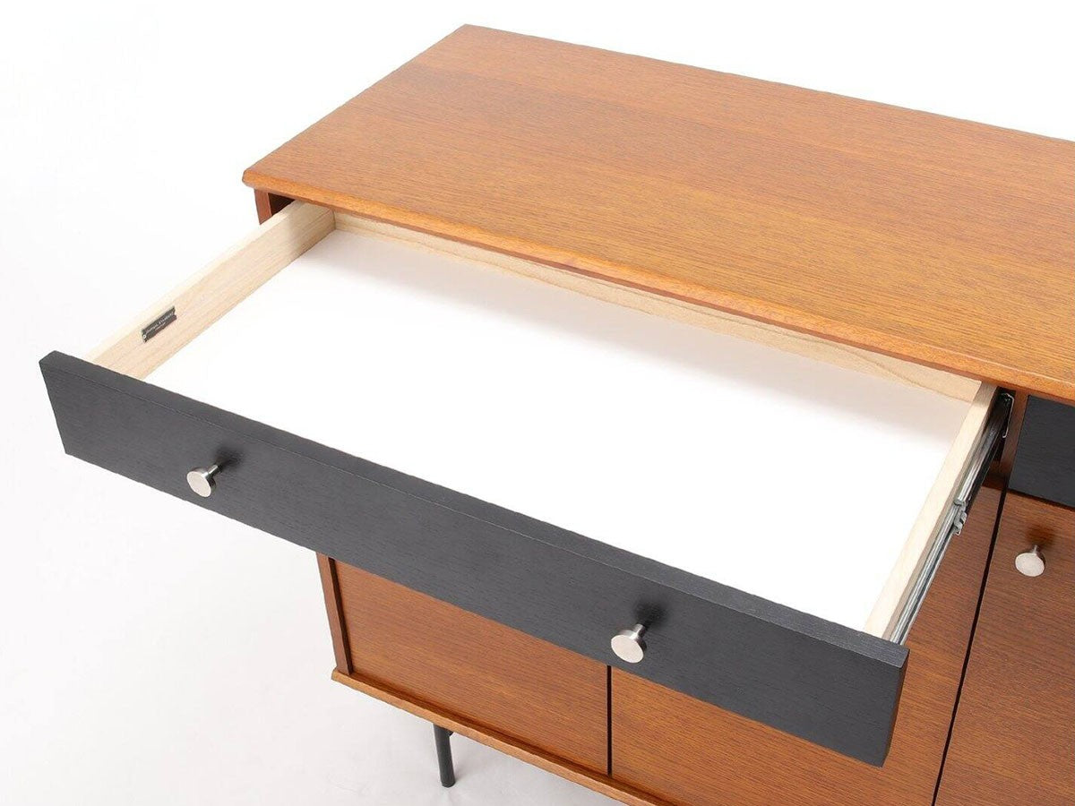 収納力に優れ、作業台として使用できるキッチンカウンター。天板には調理家電の使用に便利なコンセントが付いています。浅型の引出しとたっぷりとした開き戸に、食器やストック食品などを整理しながら収納できます。引出しの前板を黒く塗装することで、北欧ヴィンテージの雰囲気にモダンな印象を添えています。ナチュラルテイストのインテリアにも差し色として取り入れやすいデザインです。サイズや形状が異なるモデルがあり、組み合わせてお使いいただくことで、収納量や用途の幅が広がります。天板のコンセントは取り外しが可能なため、リビングルームではチェストとしてご活用いただけます。脚部は一般的なロボット掃除機が使用できる高さになっています。