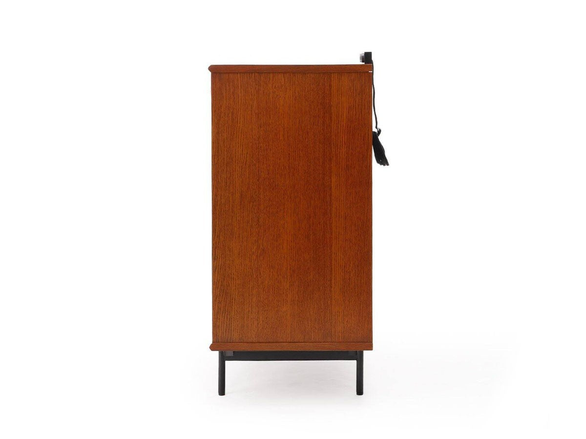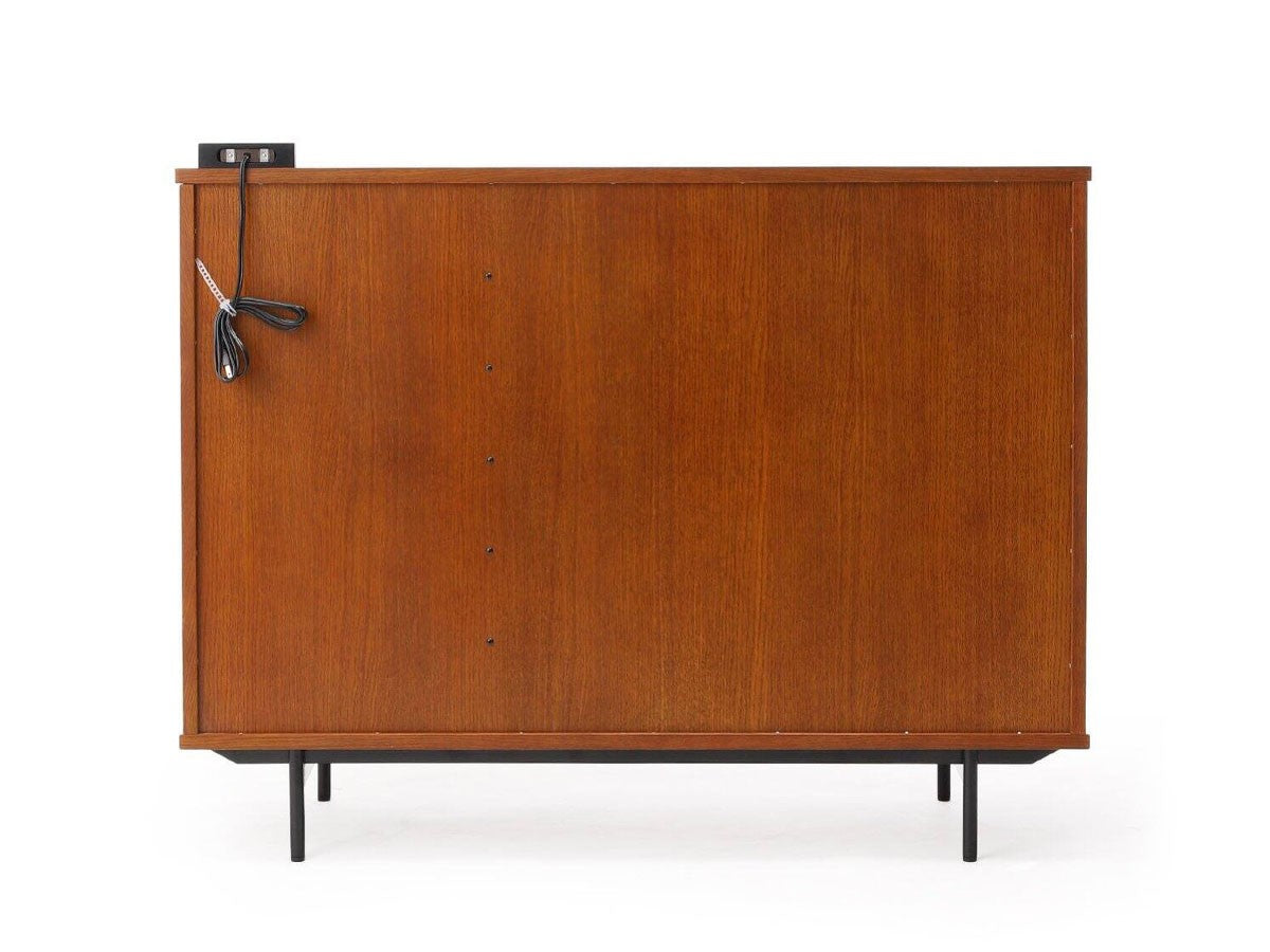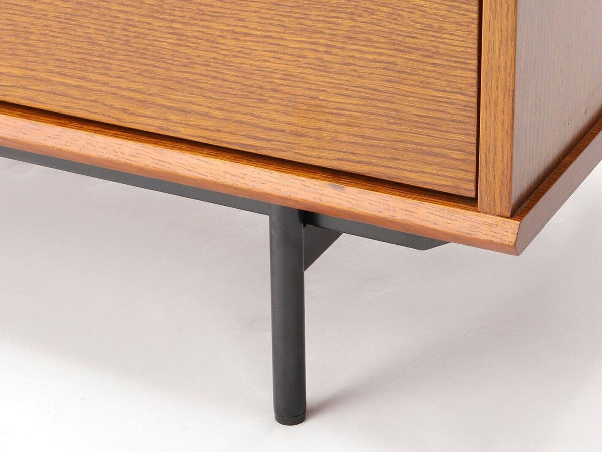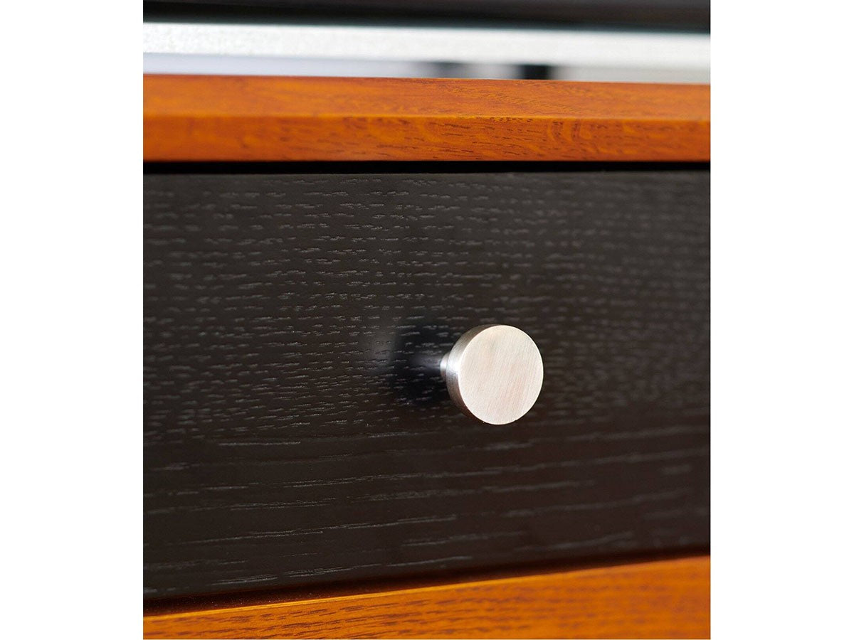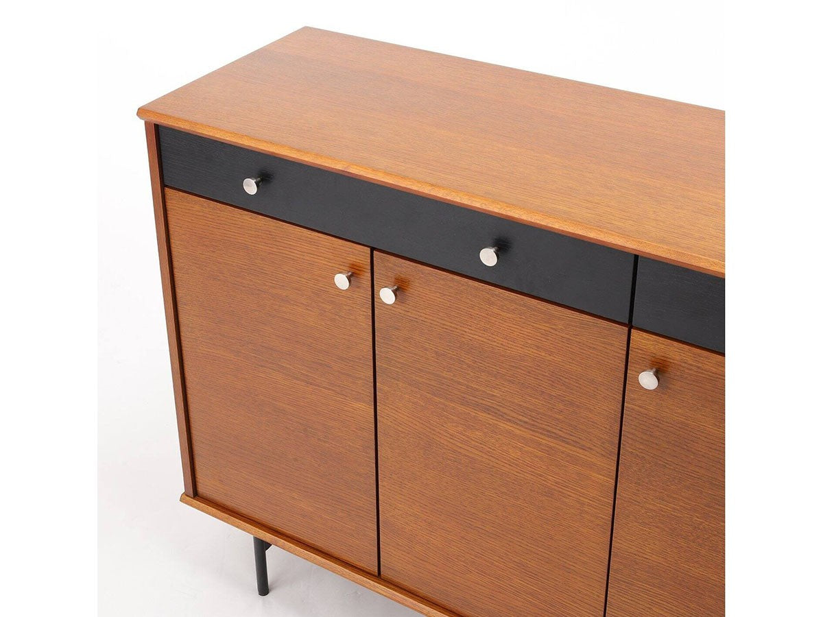 収納力に優れ、作業台として使用できるキッチンカウンター。天板には調理家電の使用に便利なコンセントが付いています。浅型の引出しとたっぷりとした開き戸に、食器やストック食品などを整理しながら収納できます。引出しの前板を黒く塗装することで、北欧ヴィンテージの雰囲気にモダンな印象を添えています。ナチュラルテイストのインテリアにも差し色として取り入れやすいデザインです。サイズや形状が異なるモデルがあり、組み合わせてお使いいただくことで、収納量や用途の幅が広がります。天板のコンセントは取り外しが可能なため、リビングルームではチェストとしてご活用いただけます。脚部は一般的なロボット掃除機が使用できる高さになっています。