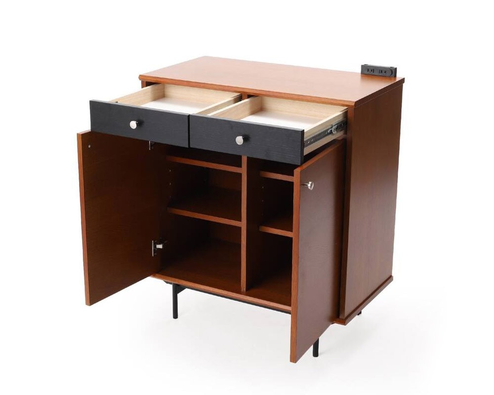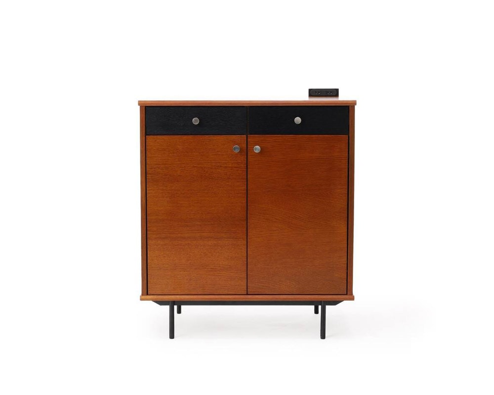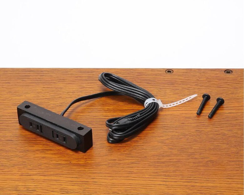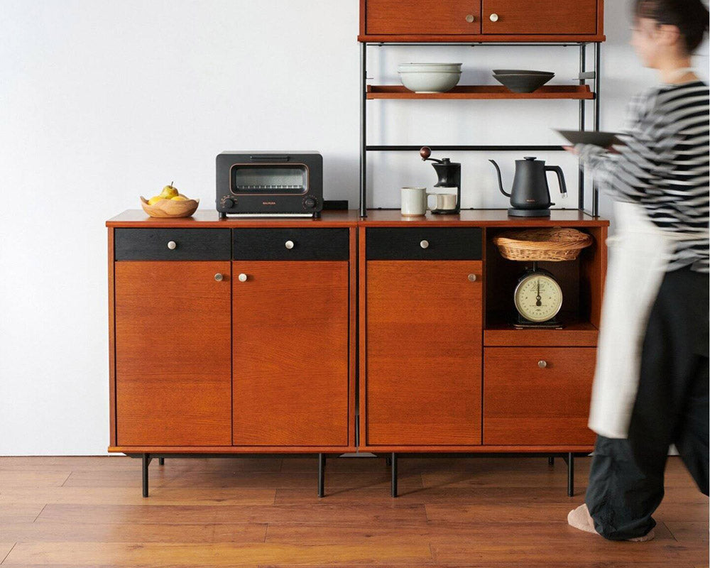 組み合わせてリビング、キッチン、寝室でご利用ができる、北欧ヴィンテージテイストの「HABITAT/ハビタ」シリーズのキッチンカウンターです。一般的な家庭のキッチンの広さは4.5帖程度と言われています。実質置ける収納アイテムの大きさは2m前後がおおよその一般的に置けるスペースと考えられます。そこにキッチンカウンターとボードを置く事を考慮してサイズを考えられています。もちろん1台のみでもある程度の機能と収納容量確保出来ますが、HABITAT/ハビタシリーズ4種類のサイズバリエーションの組み合わせ次第で、設置スペースに合わせて自由に組み合わせることが可能です。抽斗の前板を黒くする事で北欧ヴィンテージのモダンな印象を感じられ、北欧テイストやナチュラルのインテリアにも挿して取り入れやすいデザインです。キッチンで収納兼作業台としてのコンパクトなサイジングで、脚元は、お掃除ロボットが通り抜けられるサイズになっています(約12.5cm)。また、コンセントは取り外しが可能なので、リビングスペースで使えるチェストやキャビネットとしてお使いいただけます。取り付けたままでもテーブルランプや、携帯電話等の電源供給下として便利に使って頂けます。