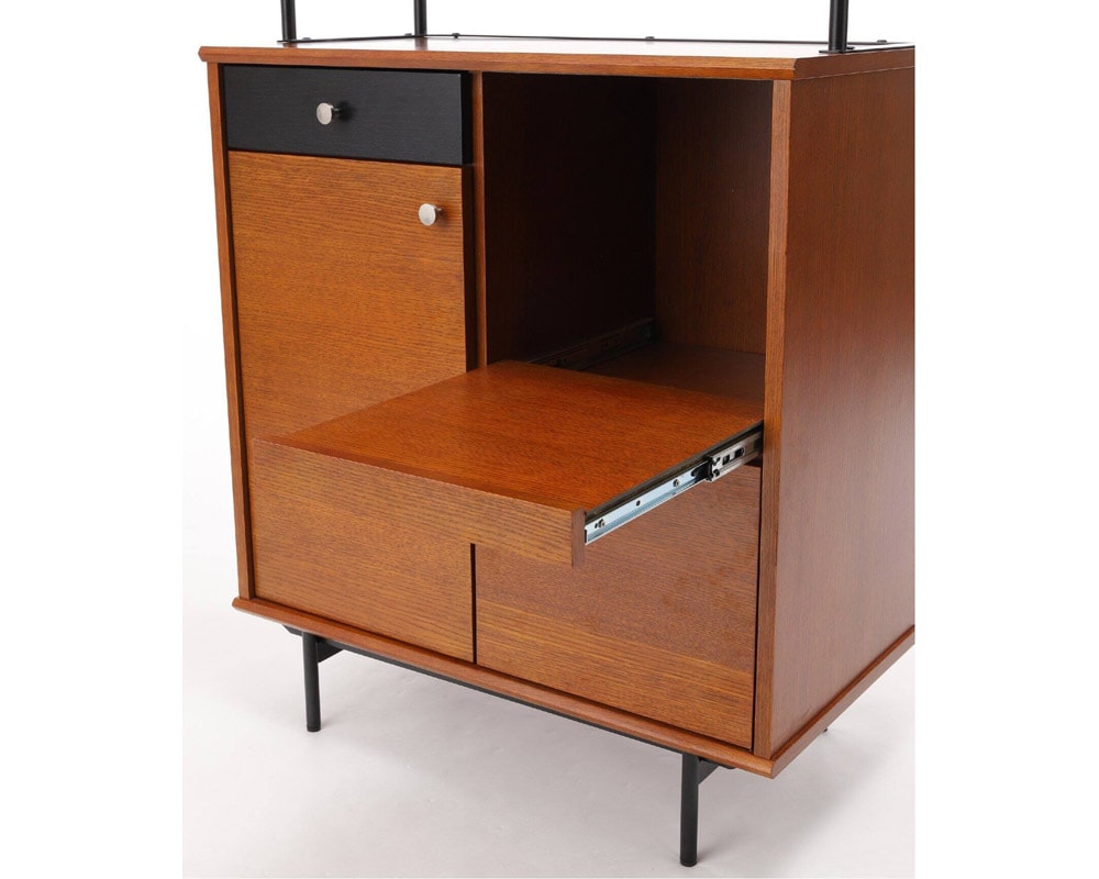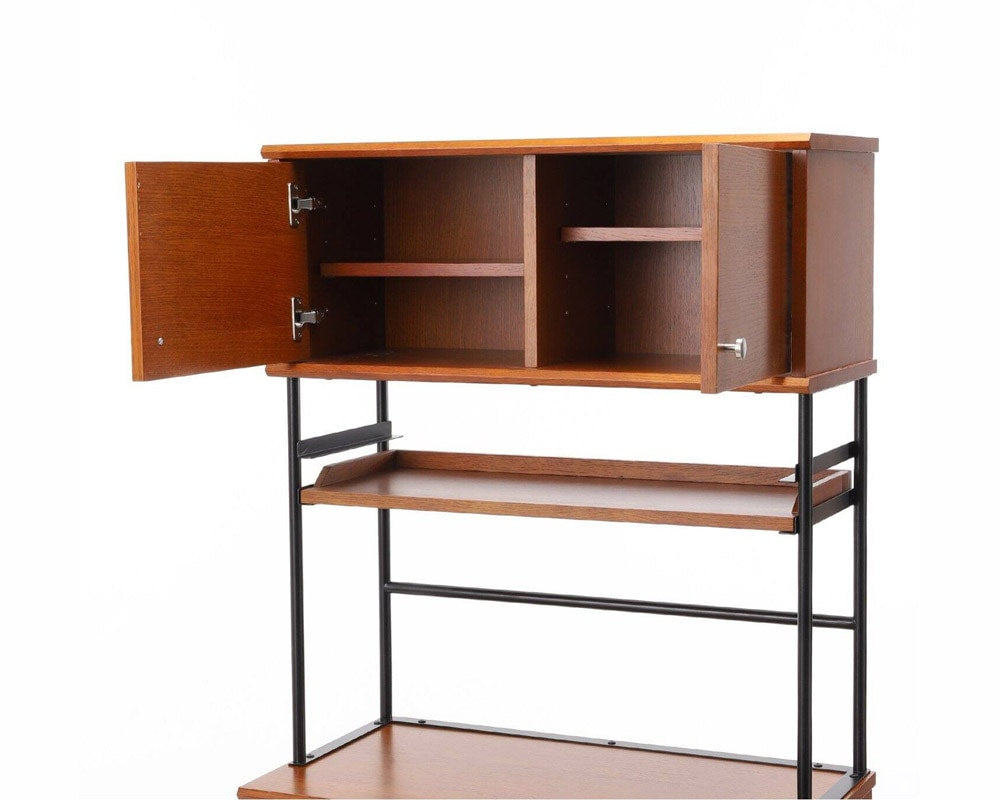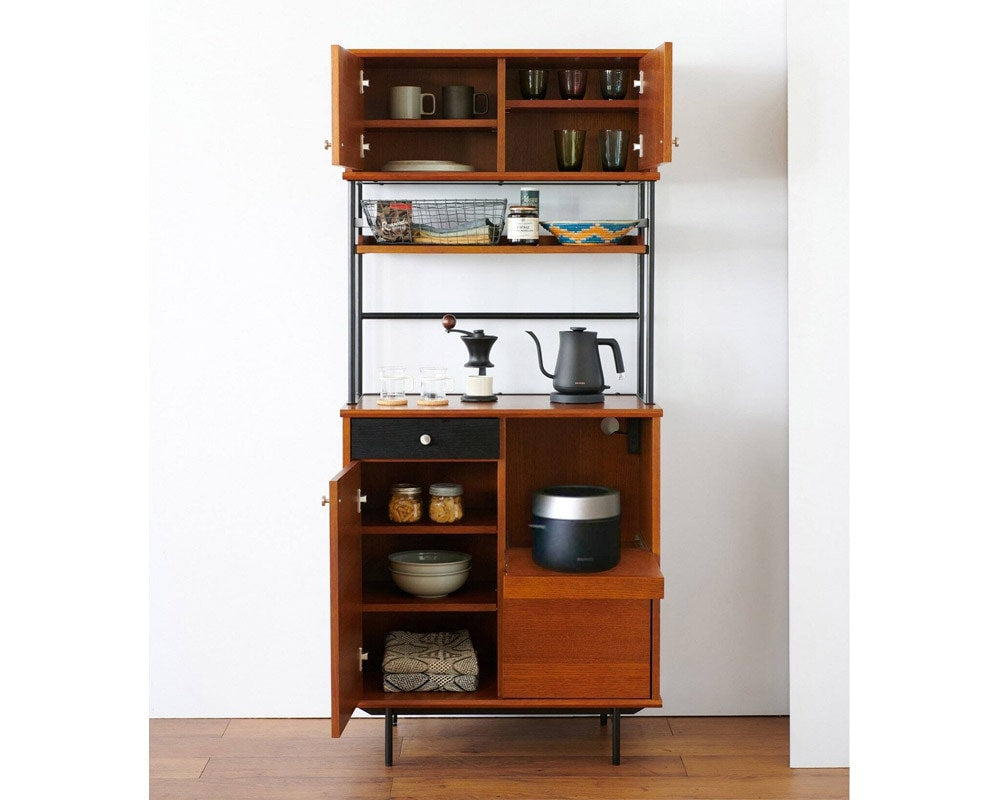 組み合わせてリビング、キッチン、寝室でご利用ができる、ヴィンテージテイストの「HABITAT/ハビタ」シリーズのキッチンボードです。一般的な家庭のキッチンの広さは4.5帖程度と言われています。実質置ける収納アイテムの大きさは2m前後がおおよその一般的に置けるスペースと考えられます。そこにキッチンカウンターとボードを置く事を考慮してサイズを考えられています。もちろん1台のみでもある程度の機能と収納容量確保出来ますが、HABITAT/ハビタシリーズ4種類のサイズバリエーションの組み合わせ次第で、設置スペースに合わせて自由に組み合わせることが可能です。抽斗の前板を黒くしている事で北欧ヴィンテージのモダンな雰囲気を感じられるようにデザインされ、北欧テイストやナチュラルなインテリアにも挿して取り入れてやすいデザインです。キッチンでの吊り戸棚の様な収納を携えた収納キャビネットに仕上がっていて、天板には電子レンジをなどの家電を置く事を想定し、棚板は2段階で高さ設定を出来るようになっています。下段には炊飯器やコーヒーメーカー等の収納に特化した抽斗が設けられています。また脚元は、お掃除ロボットが通り抜けられるサイズ(約12.5cm)に設定されています。
