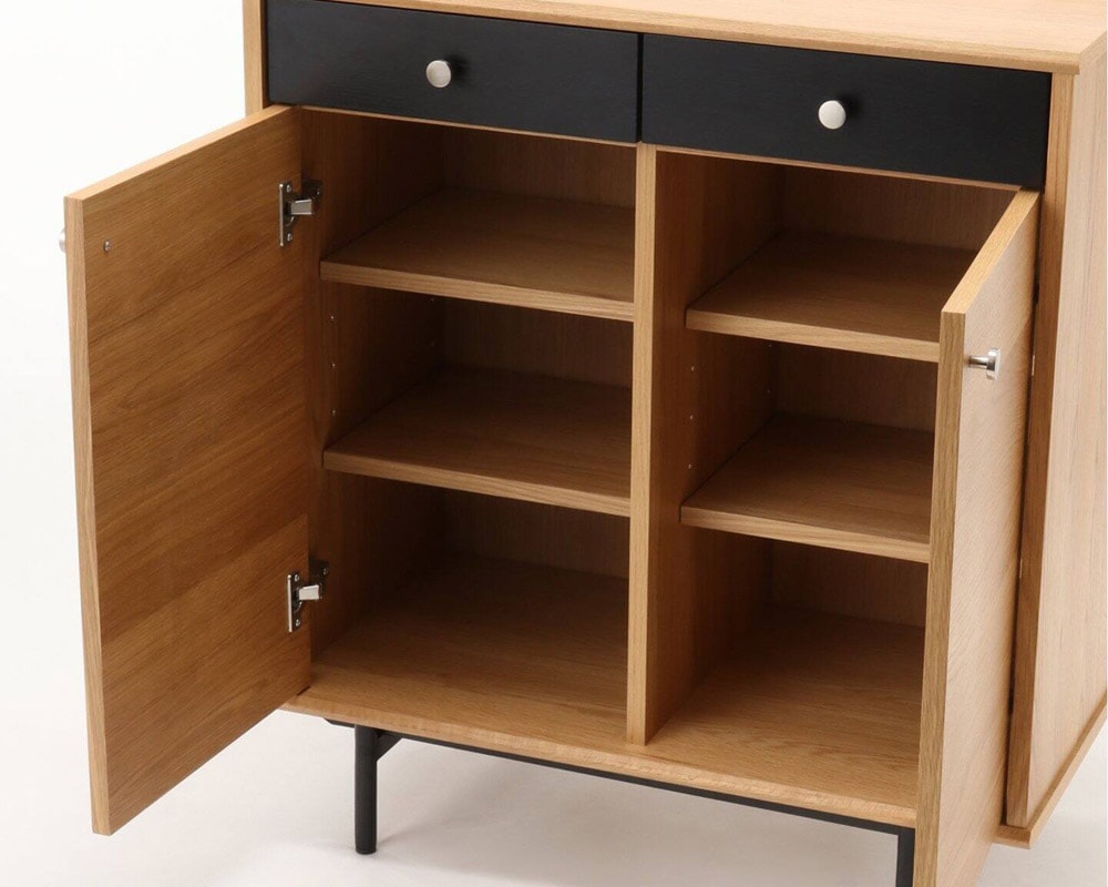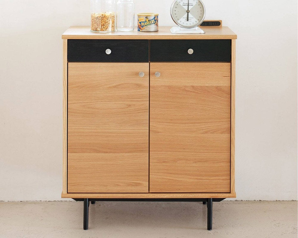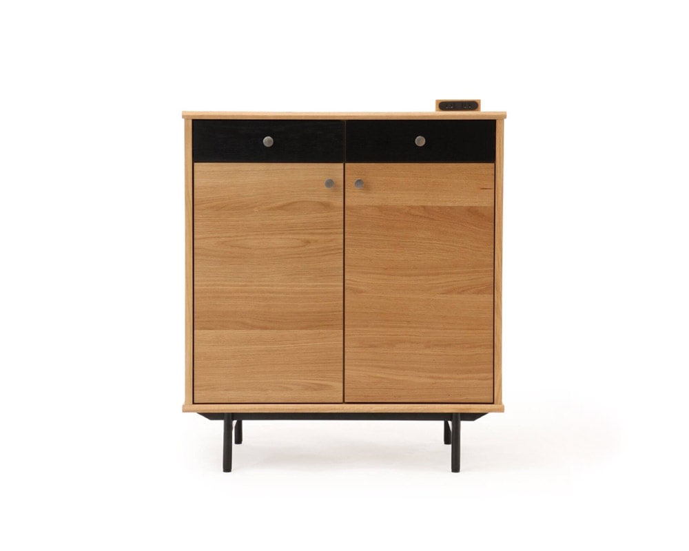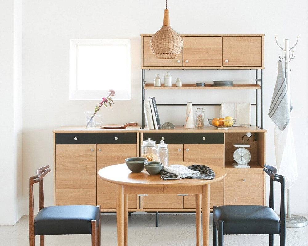 組み合わせてリビング、キッチン、寝室でご利用ができる、北欧ヴィンテージテイストの「HABITAT/ハビタ」シリーズのキッチンカウンター、ナチュラルトーンの新色です。一般的な家庭のキッチンの広さは4.5帖程度と言われています。実質置ける収納アイテムの大きさは2m前後がおおよその一般的に置けるスペースと考えられます。そこにキッチンカウンターとボードを置く事を考慮してサイズを考えられています。もちろん1台のみでもある程度の機能と収納容量確保出来ますが、HABITAT/ハビタシリーズ4種類のサイズバリエーションの組み合わせ次第で、設置スペースに合わせて自由に組み合わせることが可能です。抽斗の前板を黒くする事で北欧ヴィンテージのモダンな印象を感じられ、北欧テイストやナチュラルのインテリアにも挿して取り入れやすいデザインです。キッチンで収納兼作業台としてのコンパクトなサイジングで、脚元は、お掃除ロボットが通り抜けられるサイズになっています(約12.5cm)。また、コンセントは取り外しが可能なので、リビングスペースで使えるチェストやキャビネットとしてお使いいただけます。取り付けたままでもテーブルランプや、携帯電話等の電源供給下として便利に使って頂けます。