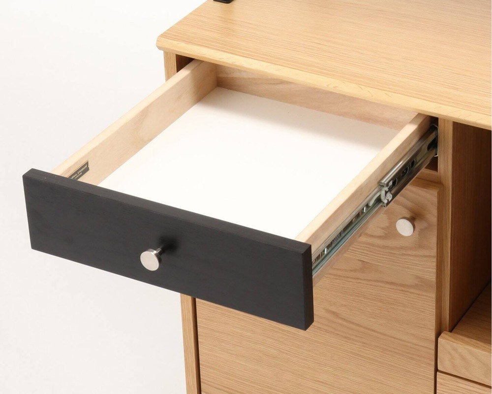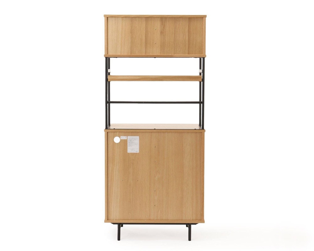 組み合わせてリビング、キッチン、寝室でご利用ができる、ヴィンテージテイストの「HABITAT/ハビタ」シリーズのキッチンボード、ナチュラルトーンの新色です。一般的な家庭のキッチンの広さは4.5帖程度と言われています。実質置ける収納アイテムの大きさは2m前後がおおよその一般的に置けるスペースと考えられます。そこにキッチンカウンターとボードを置く事を考慮してサイズを考えられています。もちろん1台のみでもある程度の機能と収納容量確保出来ますが、HABITAT/ハビタシリーズ4種類のサイズバリエーションの組み合わせ次第で、設置スペースに合わせて自由に組み合わせることが可能です。抽斗の前板を黒くしている事で北欧ヴィンテージのモダンな雰囲気を感じられるようにデザインされ、北欧テイストやナチュラルなインテリアにも挿して取り入れてやすいデザインです。キッチンでの吊り戸棚の様な収納を携えた収納キャビネットに仕上がっていて、天板には電子レンジをなどの家電を置く事を想定し、棚板は2段階で高さ設定を出来るようになっています。下段には炊飯器やコーヒーメーカー等の収納に特化した抽斗が設けられています。また脚元は、お掃除ロボットが通り抜けられるサイズ(約12.5cm)に設定されています。