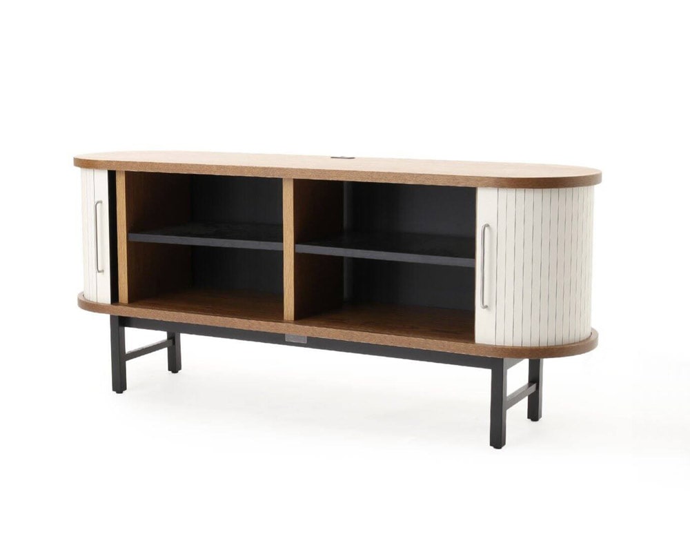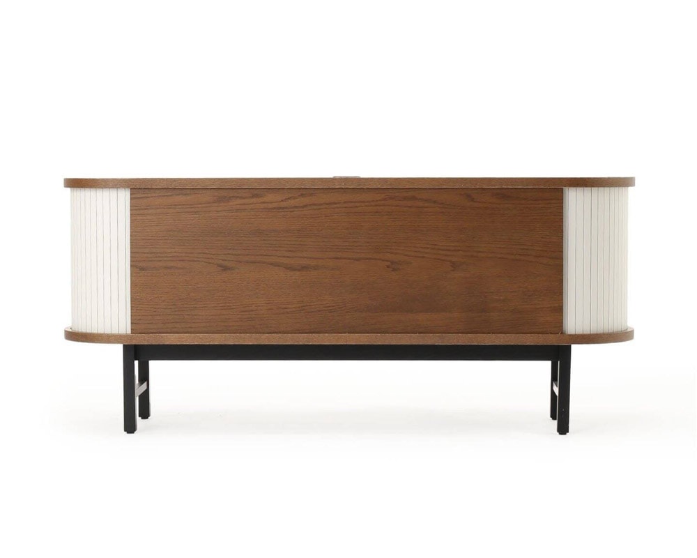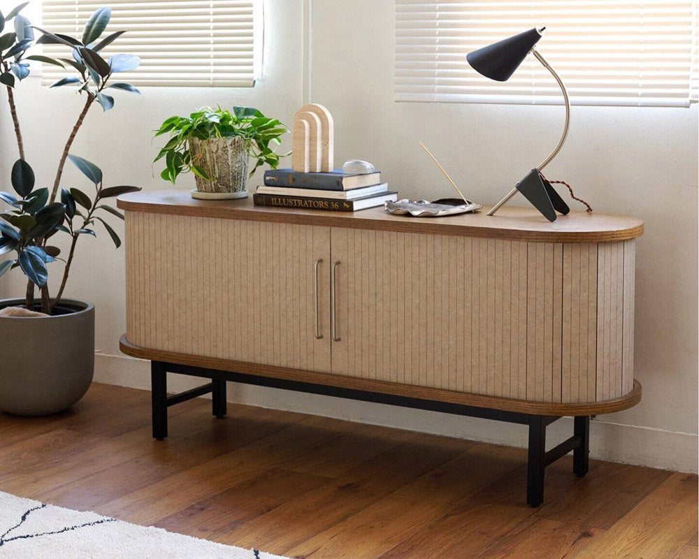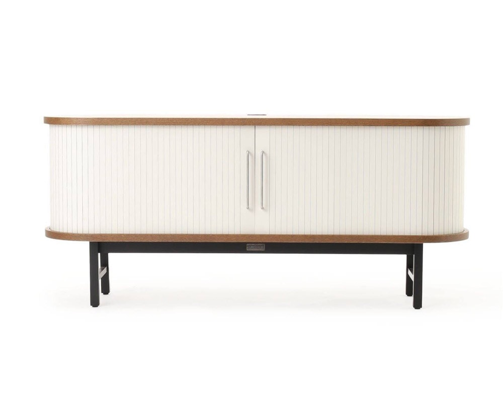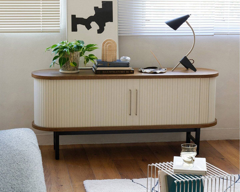 フレンチヴィンテージをイメージした、journal standard Furniture/ジャーナルスタンダードファニチャーのANOR SIDE BOARD /アノール サイドボードです。フレンチヴィンテージのサイドボードをイメージソースに、日本の住空間に合わせやすいようにデザインされた蛇腹式のサイドボードです。蛇腹扉の特性を生かした丸みを帯びたデザインが、空間を柔らかく演出し、部屋に置いた際の圧迫感を軽減してくれます。ステンレス素材のハンドルがデザインを引き締め、良いアクセントになっています。底板に配線用の穴が開いていますのでTVボードとしてもお使いいただけます。