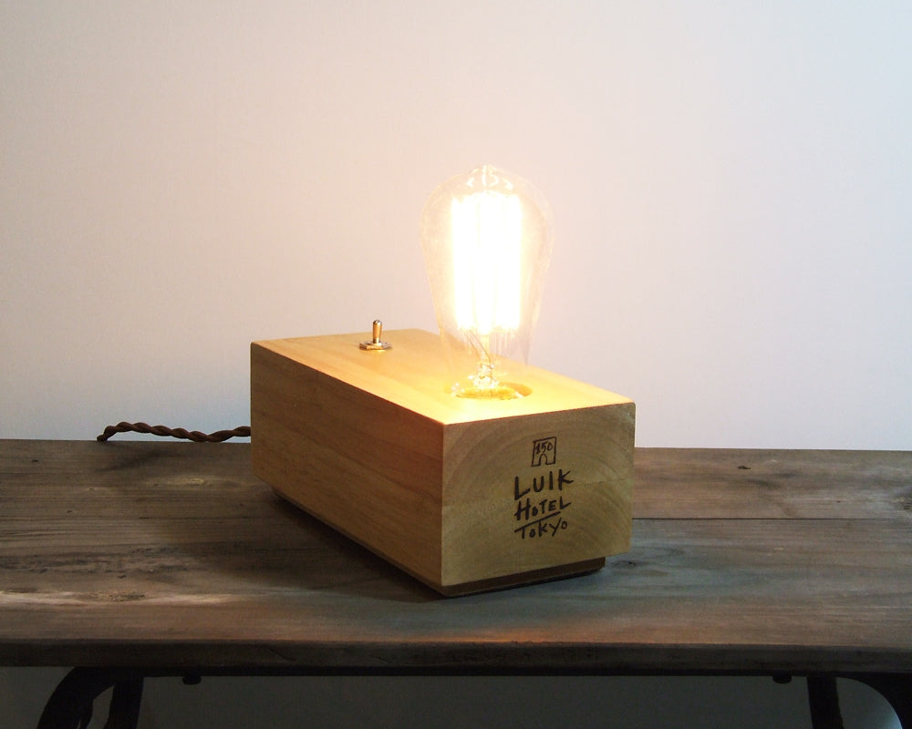 journal standard Furnitureが提案する架空のホテル「LUIK HOTEL」シリーズのテーブルランプ。架空のホテル「LUIK HOTEL」のアメニティやインテリアを提案するシリーズのテーブルランプです。スイッチとソケットを取り付けたウッドブロックのようなシンプルなテーブルランプで、素朴なスイッチと正面のロゴ焼印、付属のエジソンバルブが上手く調和しています。コードにはツイストコードを使用するなど、こだわりが随所に見られ、ベッドサイドや、床に置いて間接照明としても最適です。【Luik Hotel(ルイックホテル)】 Luik Hotelはjournal standard Furnitureが提案する架空のホテル。“Luik”とはオランダの造語で「Lui(怠け者)」と「Ik(私)」を重ねた言葉。居心地が良くてついつい怠け者になってしまう… そんなフレーズを口ずさんでもらえるよう、私たちはその全てを提供いたします。