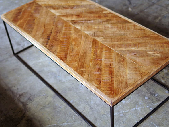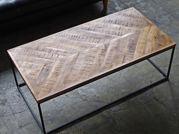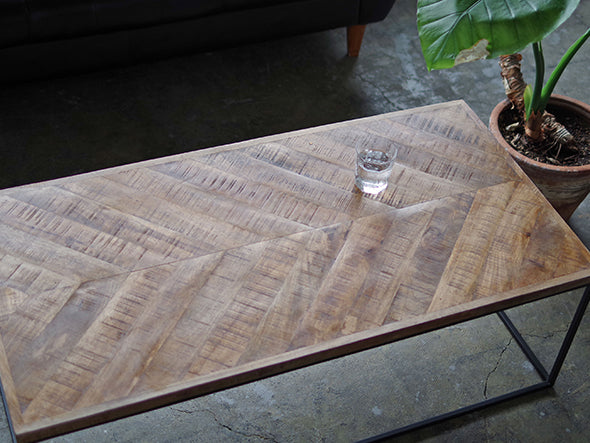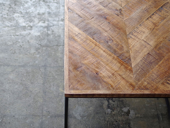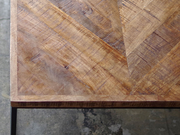 木目や風合いの違いで天板にヘリンボーンの柄を描いたローテーブル。マンゴー無垢材の独特な味わいと幾何学的なパターンの組み合わせが個性的な表情を見せます。表面は木の質感そのままに凹凸のあるラフな仕上がりです。