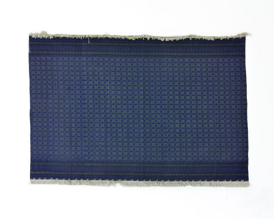 キリムをモチーフにデザインされた生地「AFG Rug」を使ったランドスケーププロダクツのオリジナルラグ。カラーはネイビーです。 テキスタイルブランドcoccaと共同でデザイン、制作された「AFG Rug」という名の生地。 この生地はアフガニスタンの絨毯:キリムをモチーフに、表情のあるコットンにそのデザインをプリントして作られています。 その生地「AFG Rug」にブラックの厚手の生地を裏側につけることで「ラグ」に仕上げられています。 また、両端にはリネンのフリンジをあしらい、さながらキリムのような雰囲気をかもし出しています。 ラグといっても綿素材なので、水洗いも可能でいつでも清潔に保っていただけます。