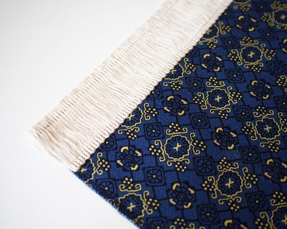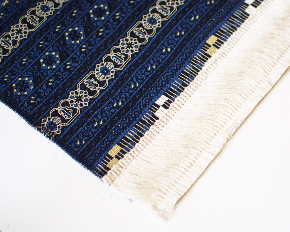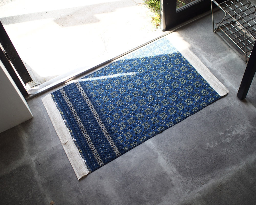 キリムをモチーフにデザインされた生地「AFG Rug」を使ったランドスケーププロダクツのオリジナルマット。カラーはネイビーです。 テキスタイルブランドcoccaと共同でデザイン、制作された「AFG Rug」という名の生地。 この生地はアフガニスタンの絨毯:キリムをモチーフに、表情のあるコットンにそのデザインをプリントして作られています。 その生地「AFG Rug」にブラックの厚手の生地を裏側につけることで「マット」に仕上げられています。 また、両端にはリネンのフリンジをあしらい、さながらキリムのような雰囲気をかもし出しています。 ラグといっても綿素材なので、水洗いも可能でいつでも清潔に保っていただけます。